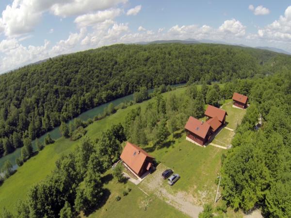 Kompletno i suvremeno opremljene kuće za odmor u netaknutoj prirodi na rijeci Mrežnici. Iznajmljujemo tri drvene kuće. Svaka je površine 140 m2. Na katu su tri spavaće sobe, a u prizemlju veliki dnevni boravak, kuhinja i terasa. Po jedna je kupaonica na katu i u prizemlju. Kuhinja je kompletno opremljena. Gosti mogu koristiti roštilj. Pored kuća je igralište za mali nogomet, odbojku i badminton. Ispred velike terase je bazen 10x4 m. Uređujemo šetnice uz rijeku. Iznajmljujemo kajake i brdske bicikle. Hranu možete naručiti unaprijed.