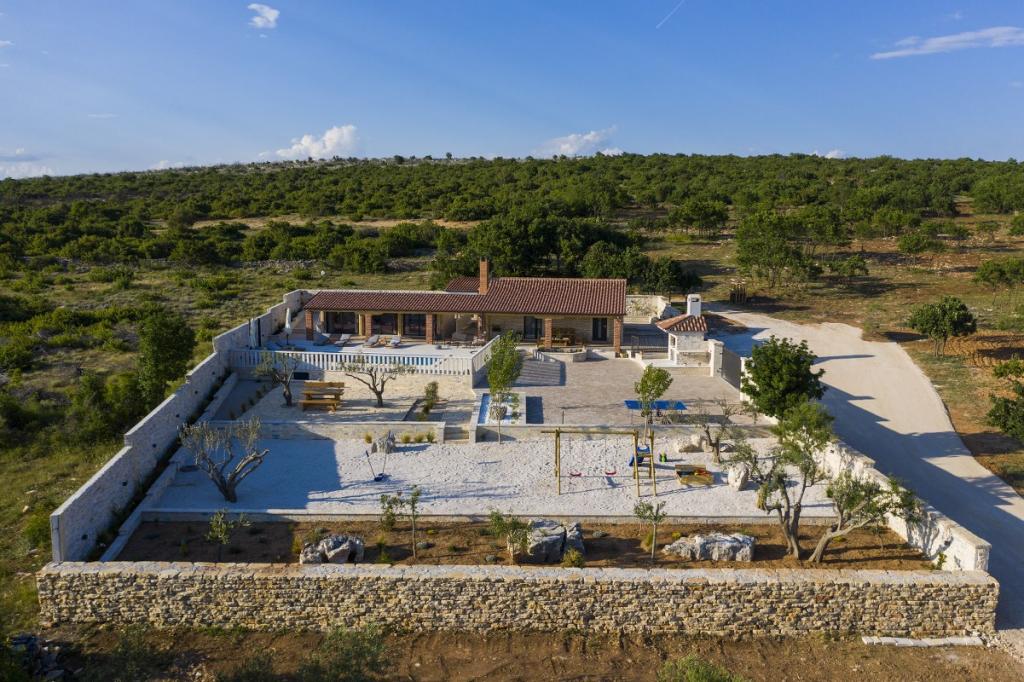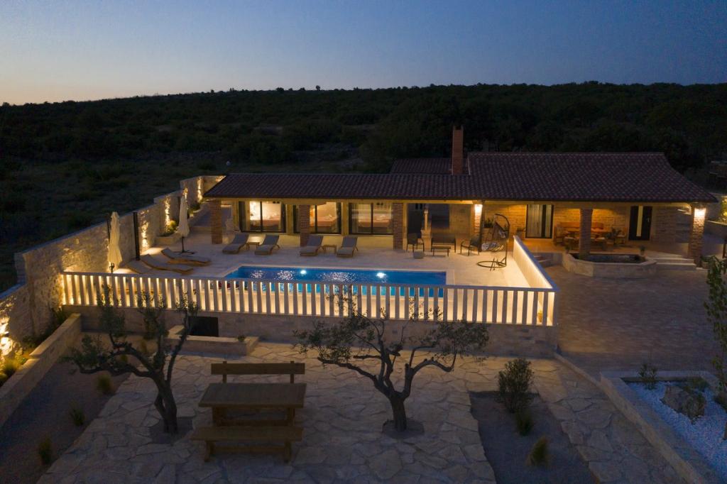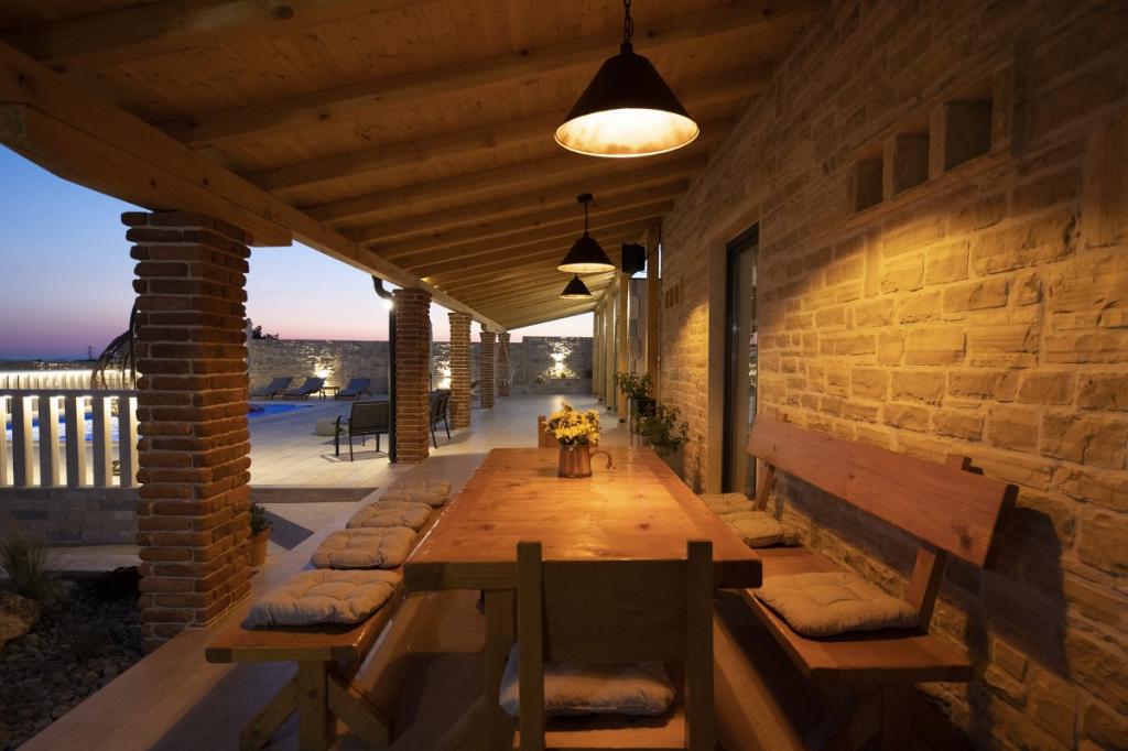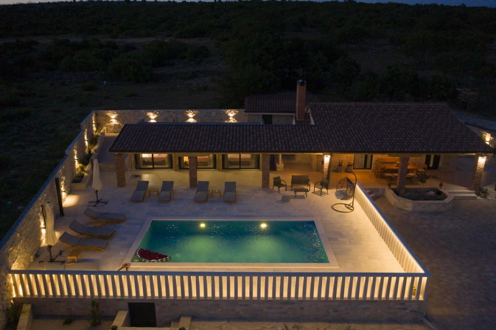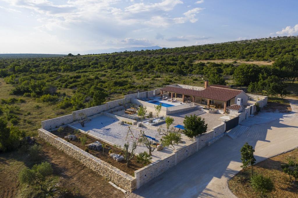 Prekrasna luksuzna vila s privatnim bazenom-Villa Bukovica nova je vila smještena u blizini Zadra. Smještena na privatnom imanju površine 1100 m2 i izgrađena od visokokvalitetnog lokalnog kamena, Villa može udobno primiti grupu do 8 osoba. Ukusno uređen životni prostor podijeljen je u dva dijela, oba s izravnim pristupom lijepom sunčalištu. Šarmantni rustikalno uređeni životni prostor sadrži potpuno opremljenu kuhinju otvorenog plana, blagovaonicu i elegantan dnevni boravak u kojem dominira vintage namještaj . Sve 4 spavaće sobe su klimatizirane i imaju vlastite kupaonice. Prostrani vanjski prostor nudi vam lijep privatni bazen, prekrasnu natkrivenu terasu sa stolom za blagovanje, dječje igralište i tradicionalni otvoreni kamin. I na kraju, ali ne najmanje važno, u podrumu se nalazi dobro opremljen vinski podrum. Tamo možete uživati u bogatom izboru visokokvalitetnih domaćih vina.