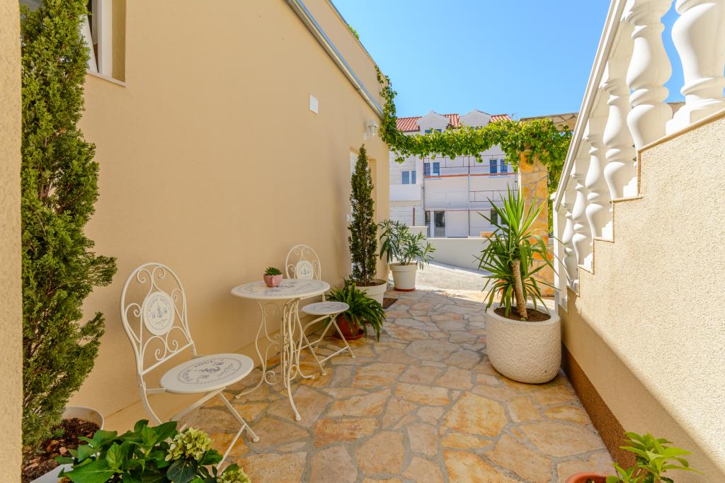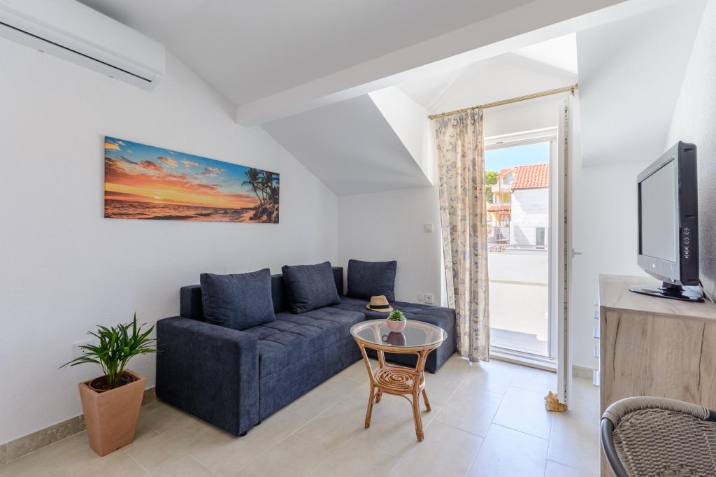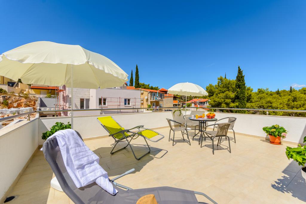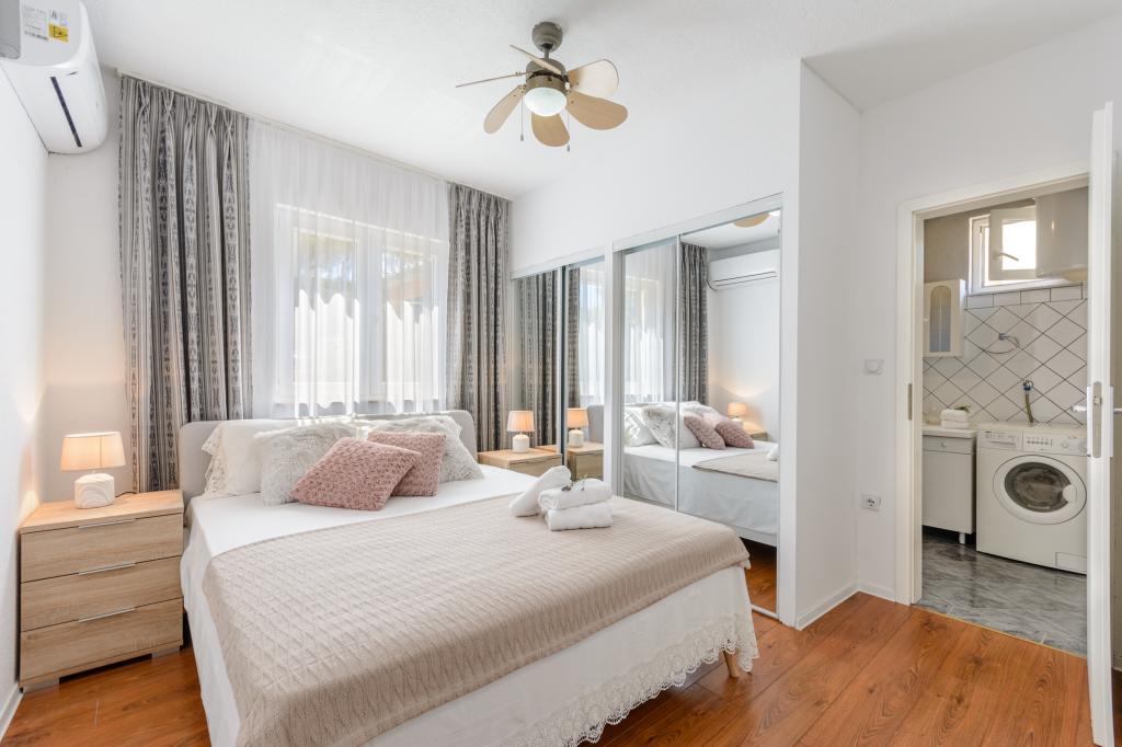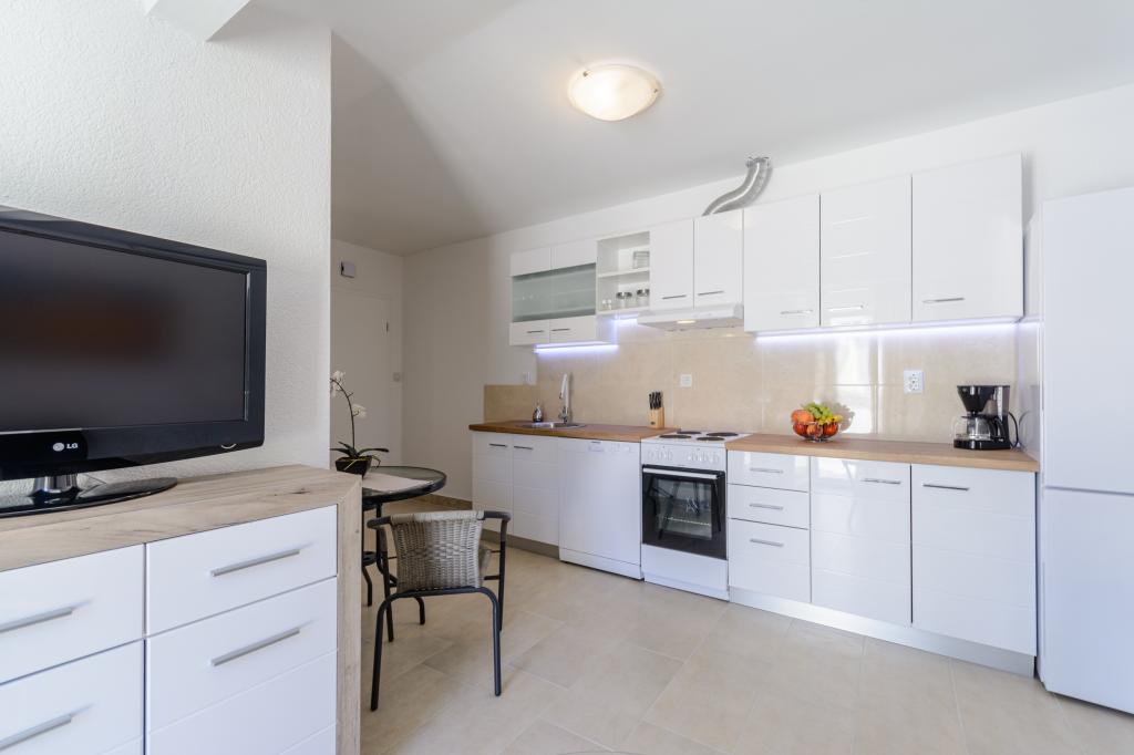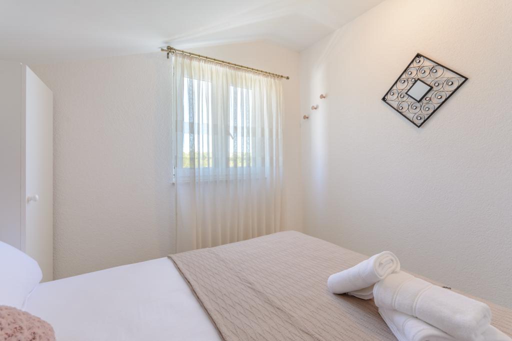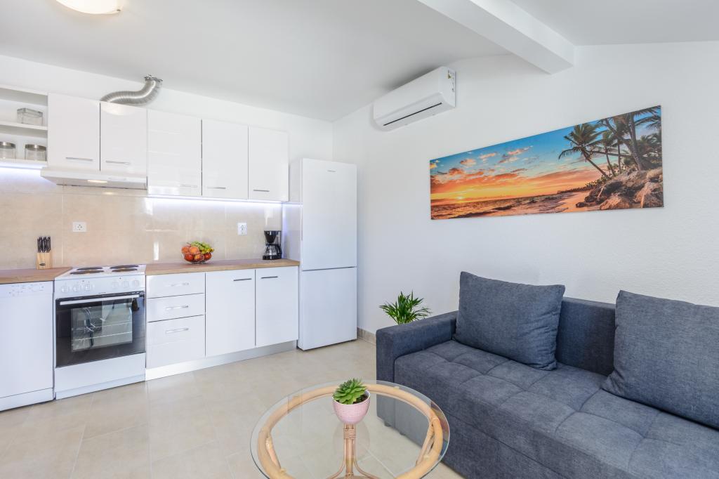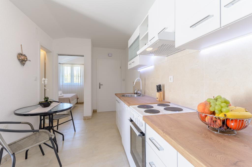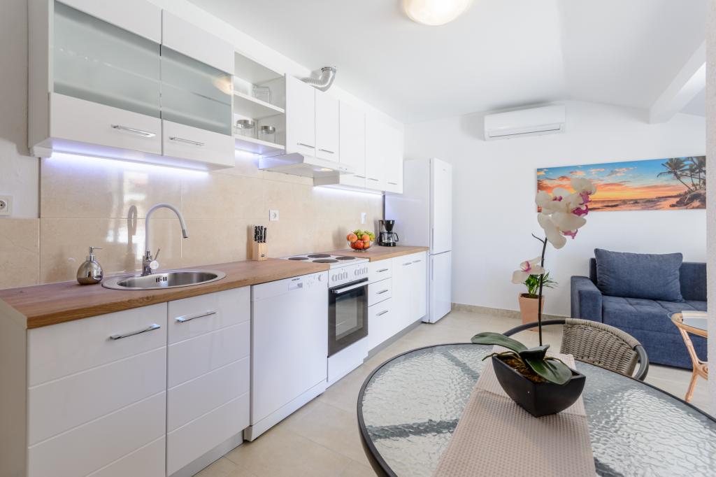 Privatni ulaz u kompletne, nove i suvremeno opremljene apartmane s pogledom na more. Vrijeme za opustanje je moguce na privatnim terasama. Osigurani su: luksuzna (satenska) posteljina, rucnici i za plazu rucnici , lezaljke i suncobrani. Da bi vam boravak ucinili sto ugodnijim u apartmanu cete pronaci susilo za kosu, peglu, toster, kuhalo i masinu za kavu. Kuhinja je opremljena svim potrebnim posudem i priborom za kuhanje kao i pitkom vodom iz slavine.