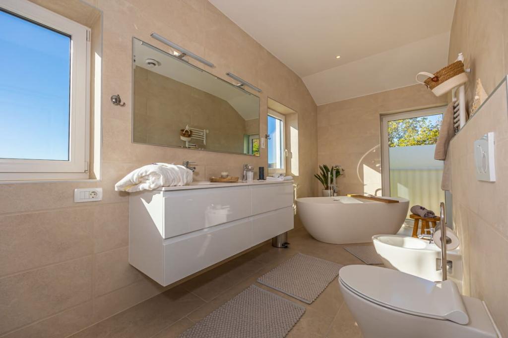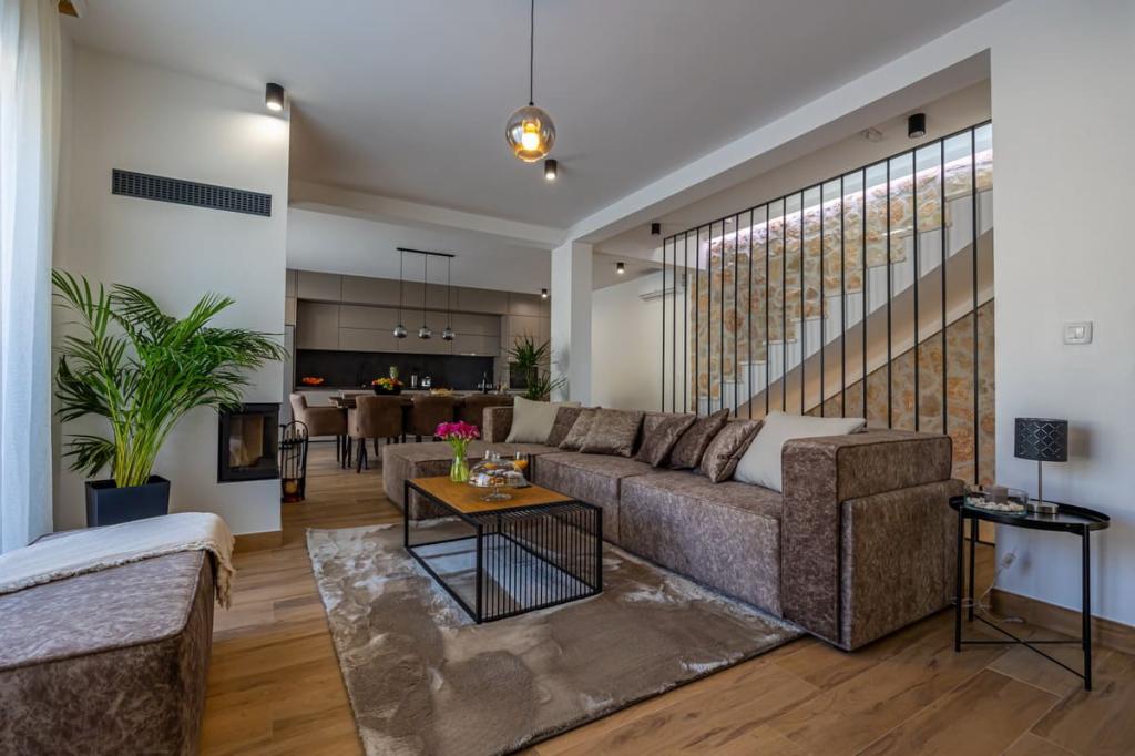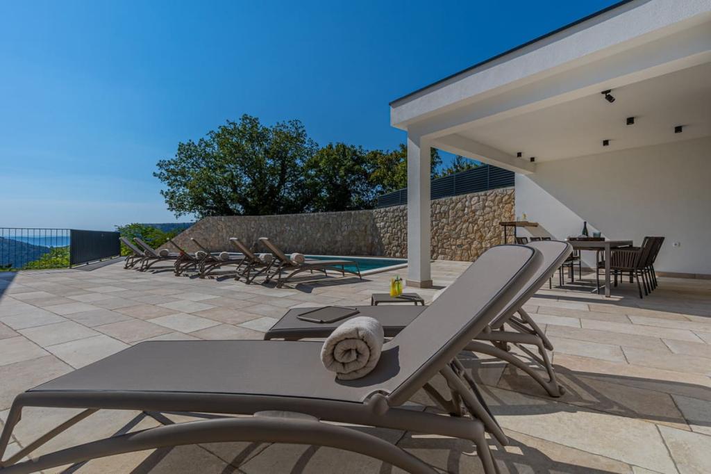 Vila 21 - Vinodol Hilltop Estate Očaravajuća fuzija moderne mediteranske vile koja predstavlja izvornu arhitekturu kuće može se doživjeti u Villi 21. Ulazeći kroz vrata na terasu glavnog bazena, vanjske kuhinje z otvorenim kaminom, gosti ulaze u vilu u glavni dnevni boravak, ultra modernu kuhinju otvorenog tipa i blagovaonicu proširiti u dnevni boravak opremljen Smart TV-om ravnog ekrana od 75 inča i kaminom za ugodne trenutke. Spoj modernog sa starim mediteranskim stilom može se naslutiti u cijeloj Villi, posebno sa starim kamenim stubištem koje vodi na oba kata gdje se nalazi 5 luksuznih spavaćih soba s vlastitim kupaonicama. Na gornjem katu velika glavna spavaća soba je raskošno opremljena sa prostorom za sjedenje, kao i moderna samostojeća kupka od umjetnog kamena. Velika lodja povezuje obe sobe i gleda na bazen. Prizemlje nudi konobu sa igraonicom , fitnes,saune,djakuzi,zen sobu ,a prizemne sobe imaju izlaz na terasu