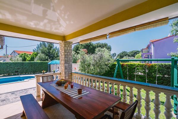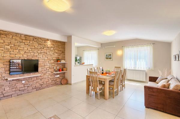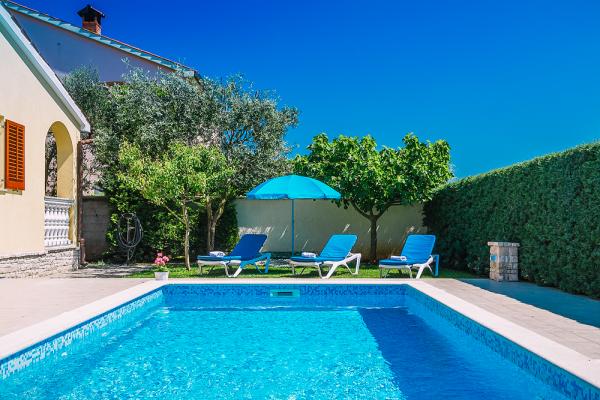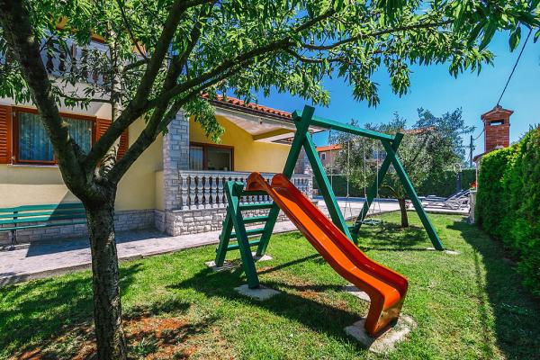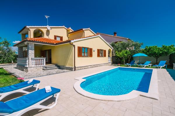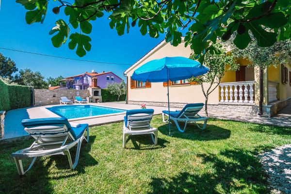Lijepo uređena i funkcionalno opremljena vila s bazenom smještena je u mirnom djelu naselja Valbandon svega 2km od Fažane i 6km od grada Pule. Do prekrasne plaže udaljene 500m od objekta stiže se pješke za 4-5min. U objekat možemo ugostiti max. 13 osoba uključujući djecu. Villa se sastoji od 4 apartmana međusobno povezanih unutarnjim stepenicama i iznajmljuje se kao cijelina. U ograđenom dvorištu su 4 parkirna mjesta, bazen dimenzija 25m2, tobogan i ljuljačke za djecu, roštilj, 7 ležaljki, 1 suncobran. U podrumu kuće nalazi se igraona sa stolnim nogometom, biljarom, stolnim tenisom i pikadom. Klima uređaj 3 komada. Kuća je idealna za veče obitelji ili prijatelje koji skupa provode godišnji odmor.