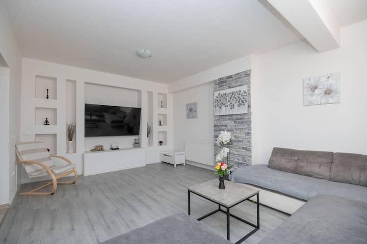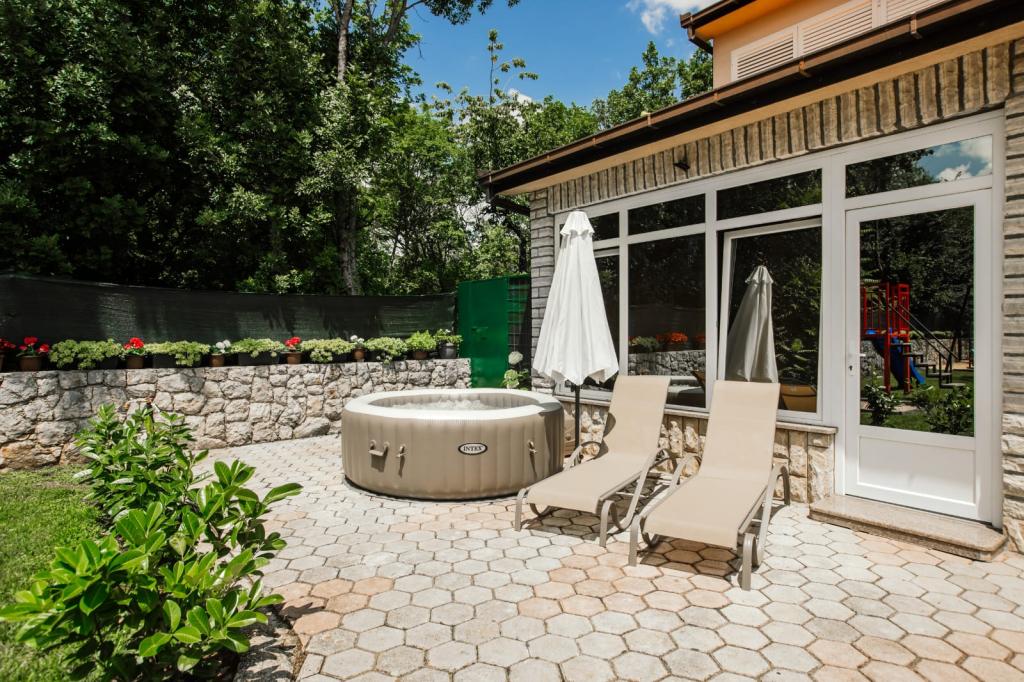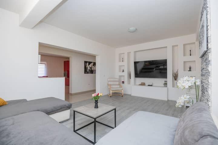 Dovedite cijelu obitelj i prijatelje u ovaj sjajan smještaj s puno prostora za zabavu. Obiteljska kuća idealna za obitelji sa djecom. Gosti borave u cijeloj kući sa kompletno opremljenom kuhinjom, prostranim dnevnim boravkom, 4 sobe, 2 kupaonice i popratnim unutarnjim i vanjskim igraonama za djecu te velikim dvoristem sa bazenom (8×4m) te masaznom kadom za 4 osobe. U sklopu kuce se nalazi mini kino dvorana i teretana.