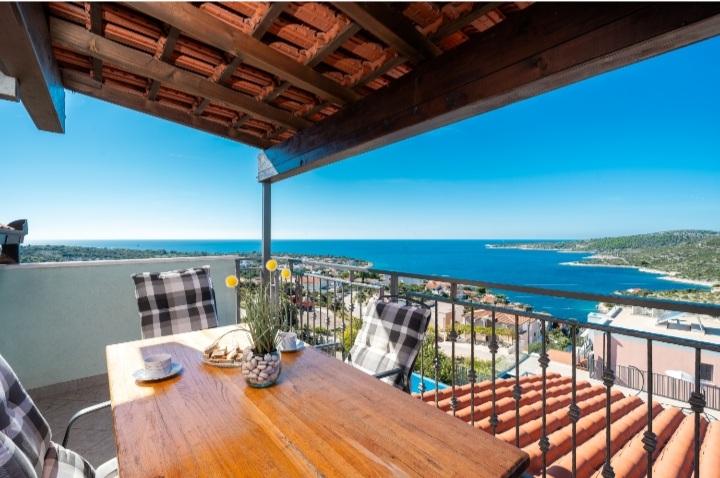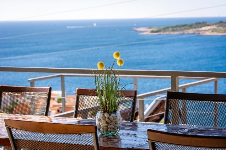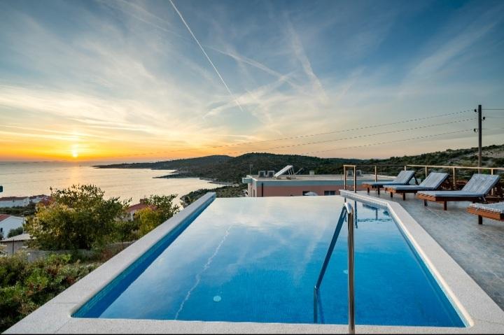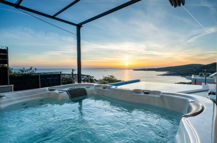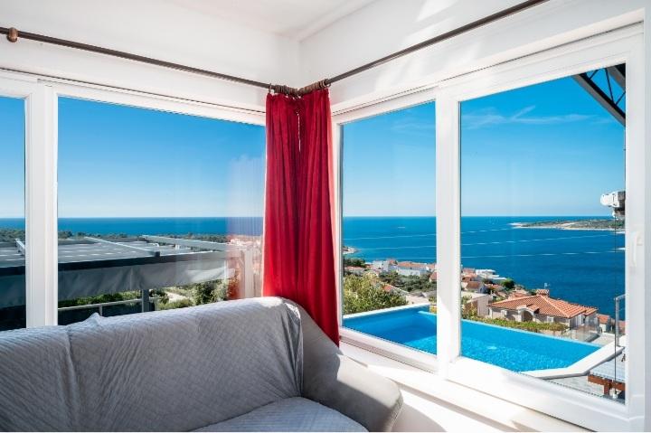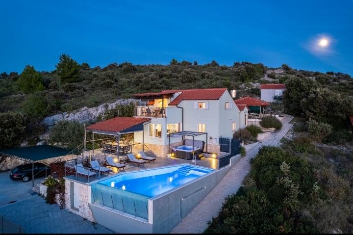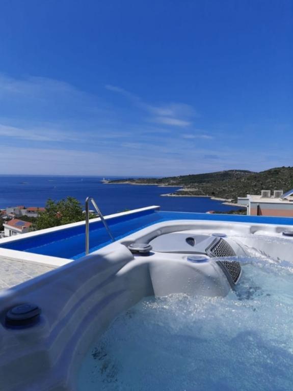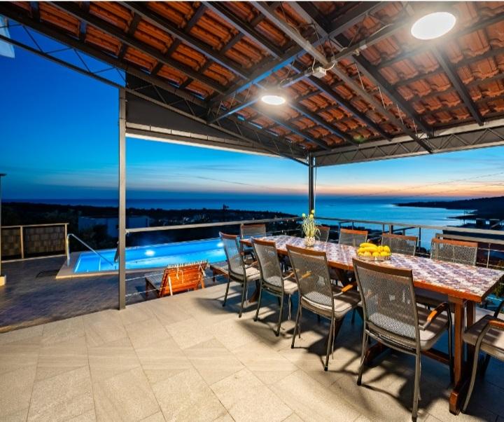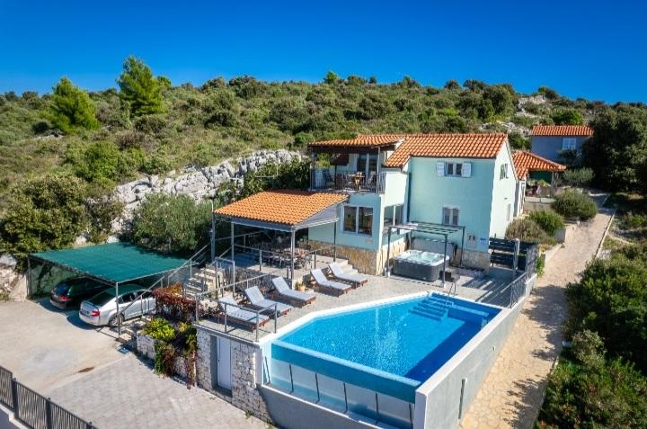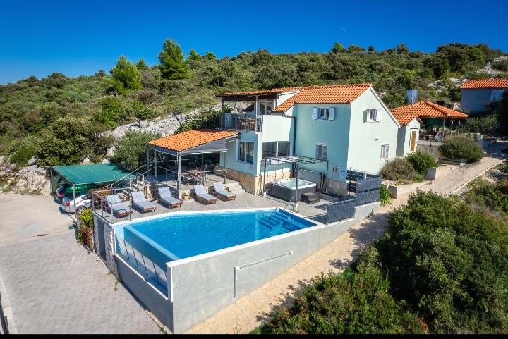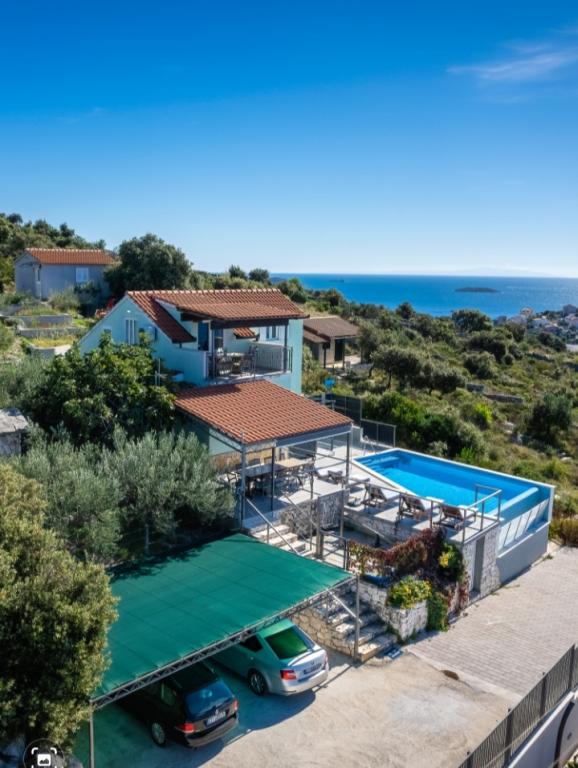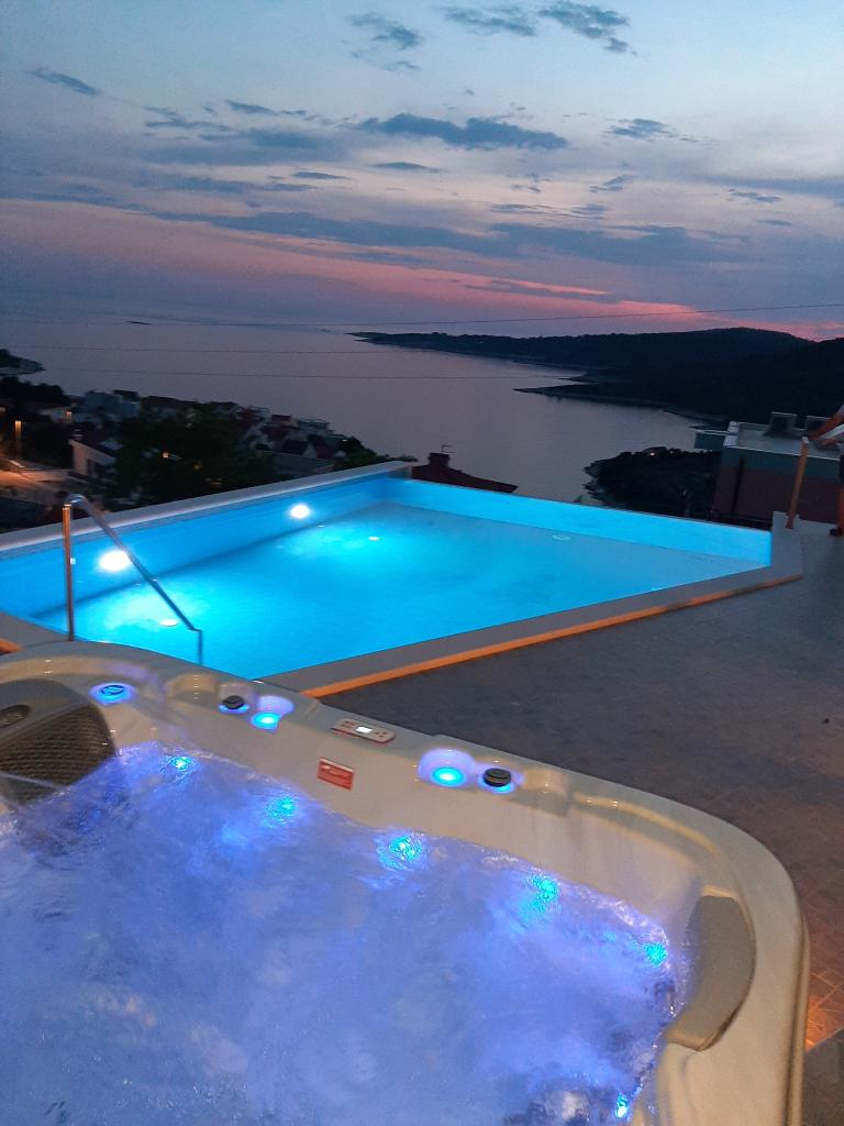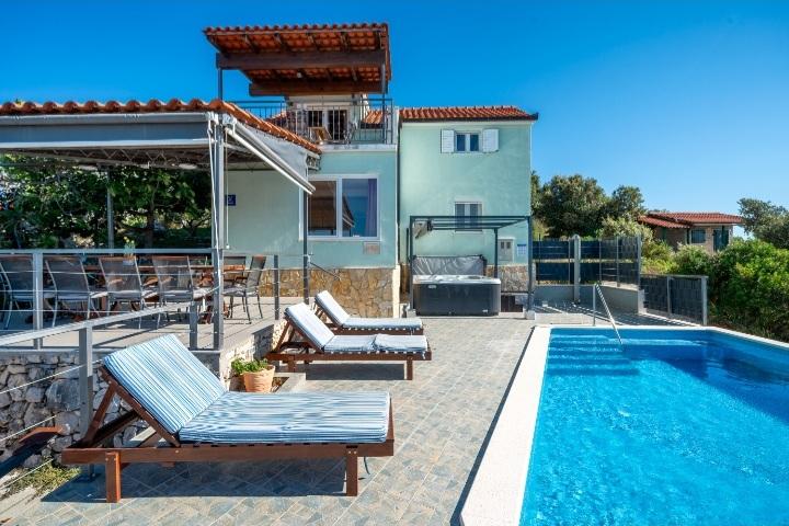 Kuća za odmor s bazenom i grijanom masažnom kadom smještena je na brijegu s prekrasnim pogledom na otvoreno more. Idealna je za miran odmor veće obitelji ili grupe prijatelja. Istovremeno, sportski i zabavni sadržaji su lako dostupni; uređene biciklističke staze, pješčana, betonska i šljunčana plaža uz kristalno čisto more. Restorani i noćni klubovi su udaljeni 5 do 10 minuta vožnje. Kuća raspolaže s ukupno deset kreveta i dva kauča na razvlačenje, dvije moderno opremljene kuhinje, dvije kupaonice i dva toaleta. Kuhinje su opremljene posuđem za pripremu i priborom za serviranje jela. U jednoj kuhinji je perilica posuđa, aparat za kavu, mikrovalna pećnica, kuhalo za vodu, toster. Gosti na raspolaganju imaju dvije natkrivene terase, veliku otvorenu terasu uz bazen, roštilj, parking za tri automobila, bazen (40 m2), ležaljke, vanjski tuš i ograđeno igralište za djecu. U cijenu je uključeno završno čišćenje, klimatizacija, održavanje bazena, boravišna pristojba i internet. Dobrodošli!