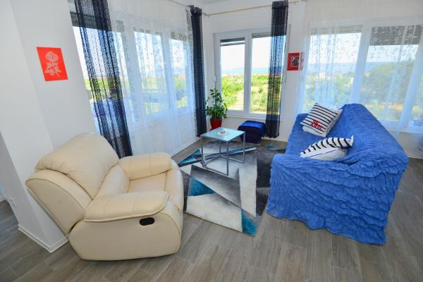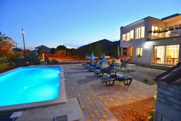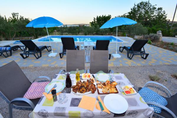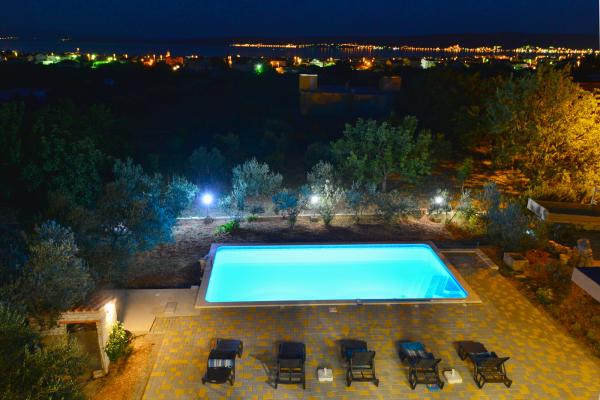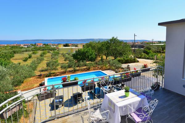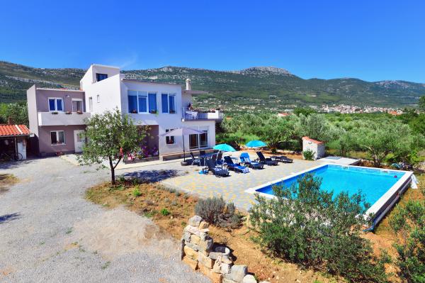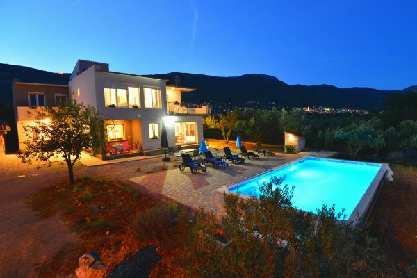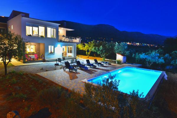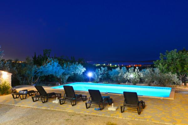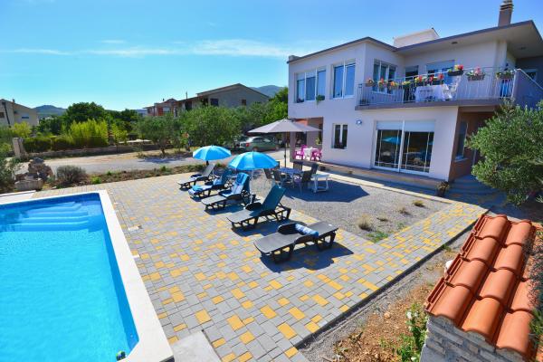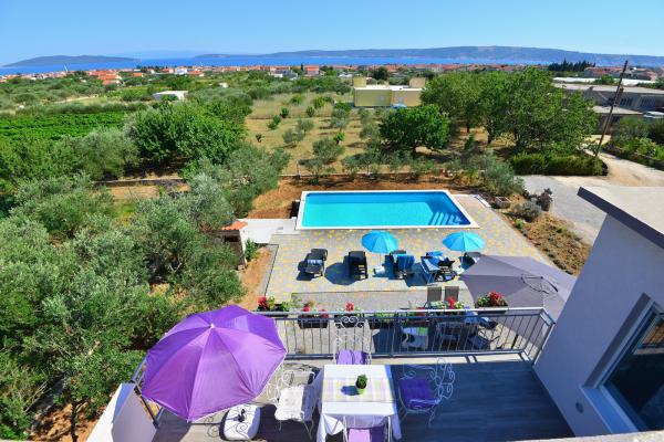 Villa sa 5 soba za 10 osoba, i 42m2 privatnim bazenom je smjestena u sredini izmedu Splita i Trogira, samo 5 min od aerodroma. U mirnom naselju okruzena prirodom nudi panoramski pogled na Split, Kastelanski Zaljev i dalmatinske otoke. Opremljena je sa 4 kupaonice, besplatnim wi fi, flat tv, a/c na oba kata, kuhinjom te 2 dnevna boravka. Udaljenost od Splita je 15 min, najbliza plaza je 3 min, a Trogir 10min.