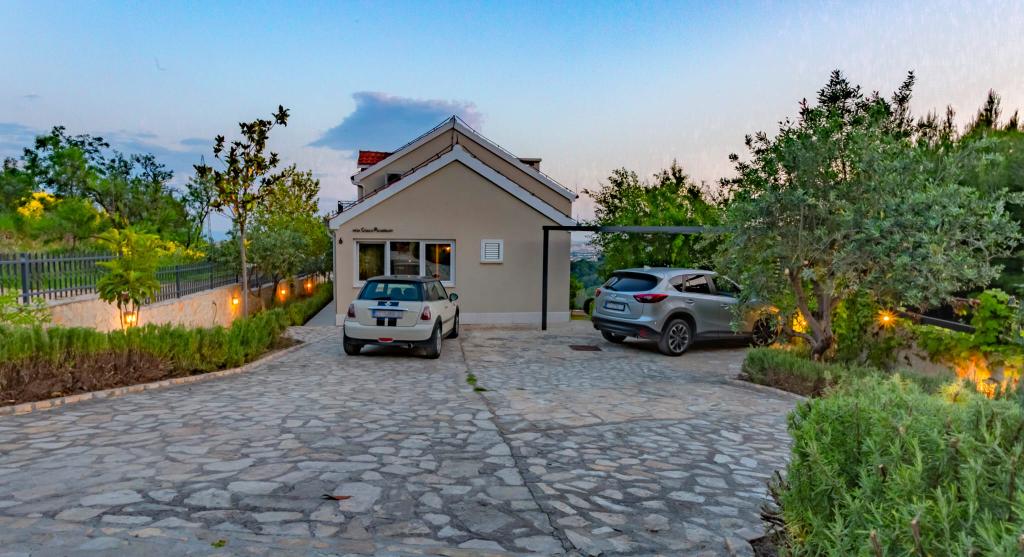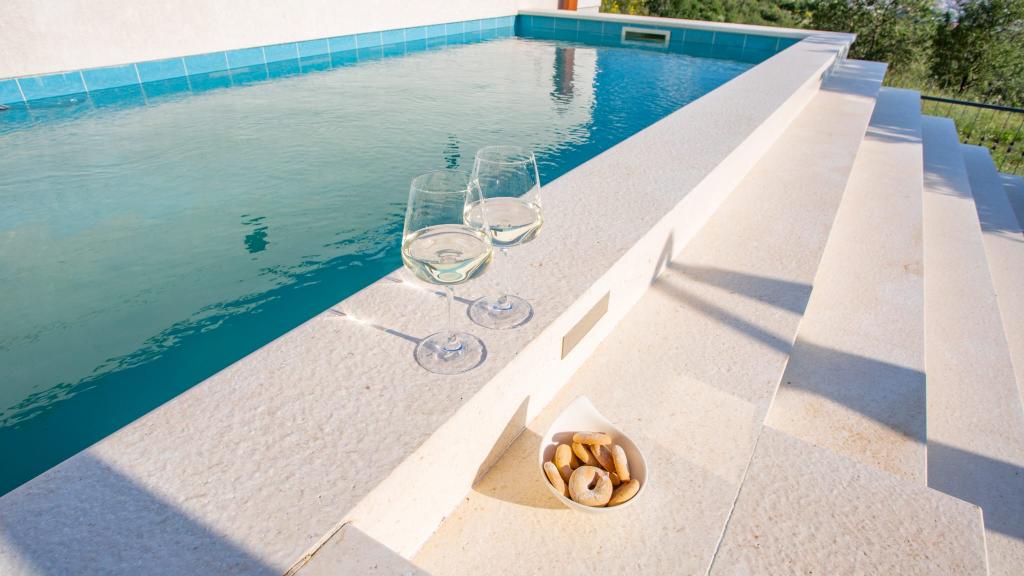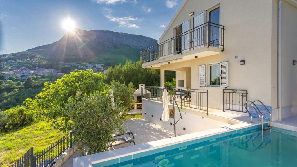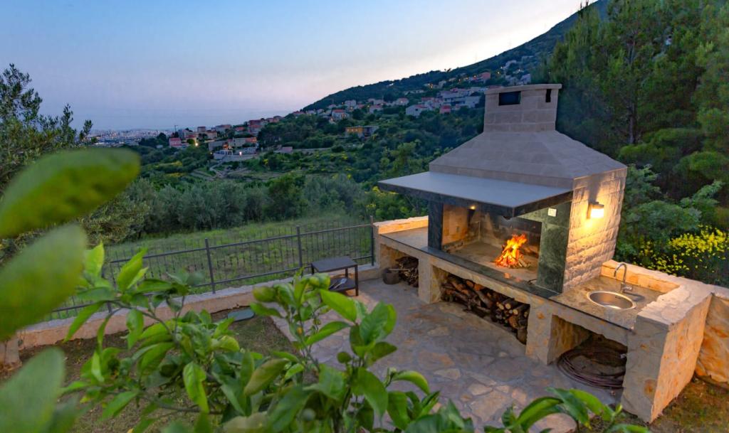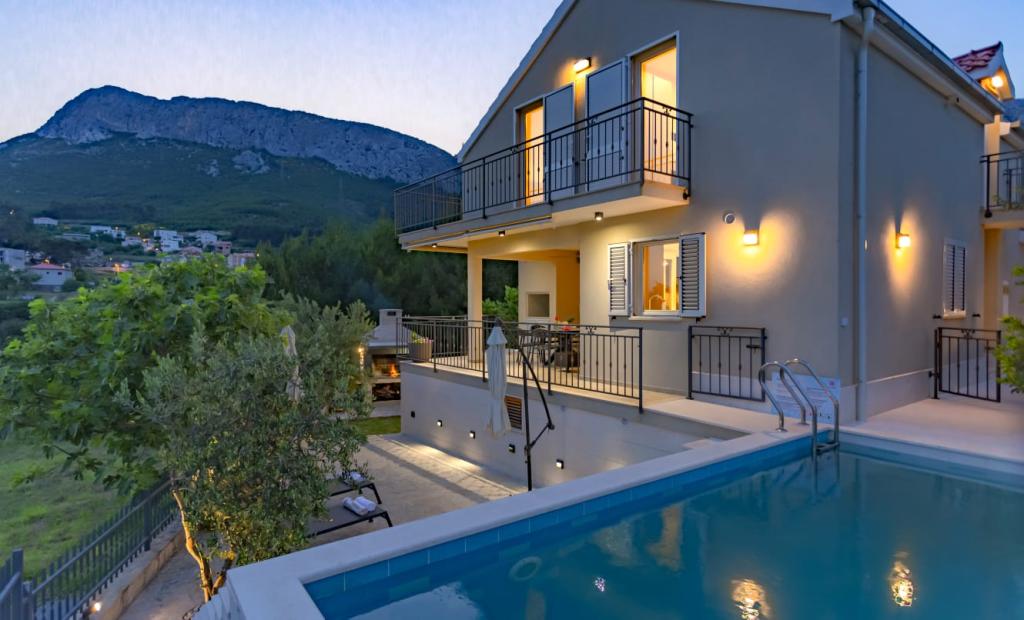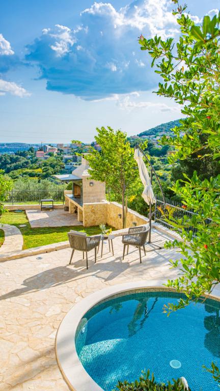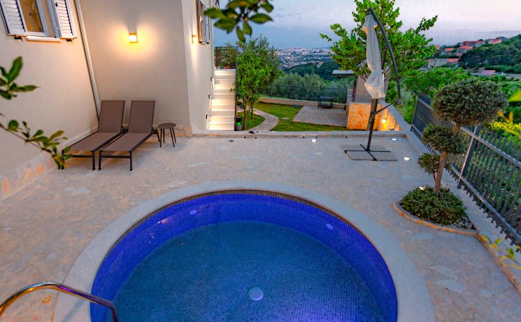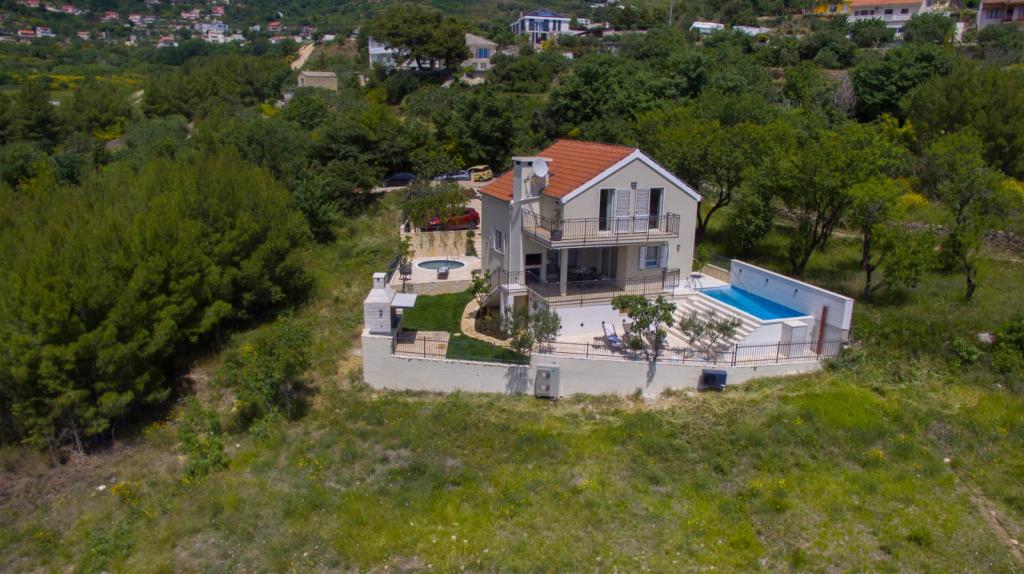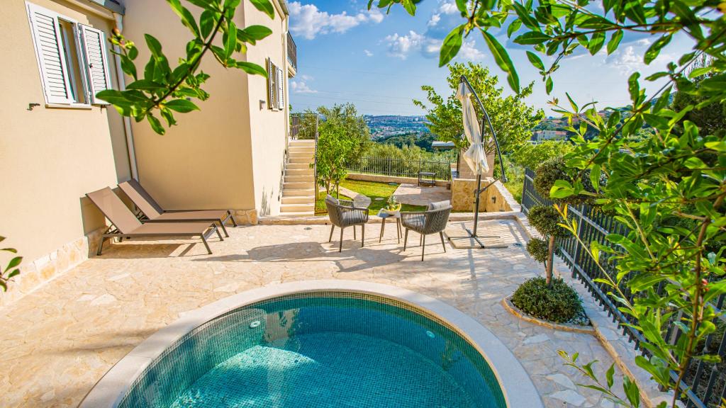 Vila se proteže na dvije etaže ukupne površine 180 četvornih metara.Prizemlje ove ljepotice sastoji se od potpuno opremljene kuhinje s blagovaonicom i udobnog dnevnog boravka. U kuhinji ćete pronaći sve što vam je potrebno za pripremu i posluživanje hrane, a blagovaonica je opremljena za 8 osoba.Dnevni boravak će tijekom dana biti mjesto za opuštanje uz TV,a tijekom noći možete se odmoriti na kauču koji može poslužiti kao pomoćni ležaj.Iz dnevnog boravka stepenice vas vode na gornji kat gdje se nalaze 3 spavaće sobe kao i jedna zajednička kupaonica. Sve tri spavaće sobe imaju izlaz na balkon s prekrasnim panoramskim pogledom na vrt ili okolicu. Dvije spavaće sobe imaju bračne krevete, dok preostale dvije imaju po dva odvojena kreveta. Kuću okružuje pomno uređen mediteranski vrt. Na južnoj strani nalazi se grijani bazen s ležaljkama za uživanje na suncu. Za trenutke potpunog opuštanja pronaći ćete jacuzzi u stražnjem dijelu kuće te roštilj pokraj balkona.