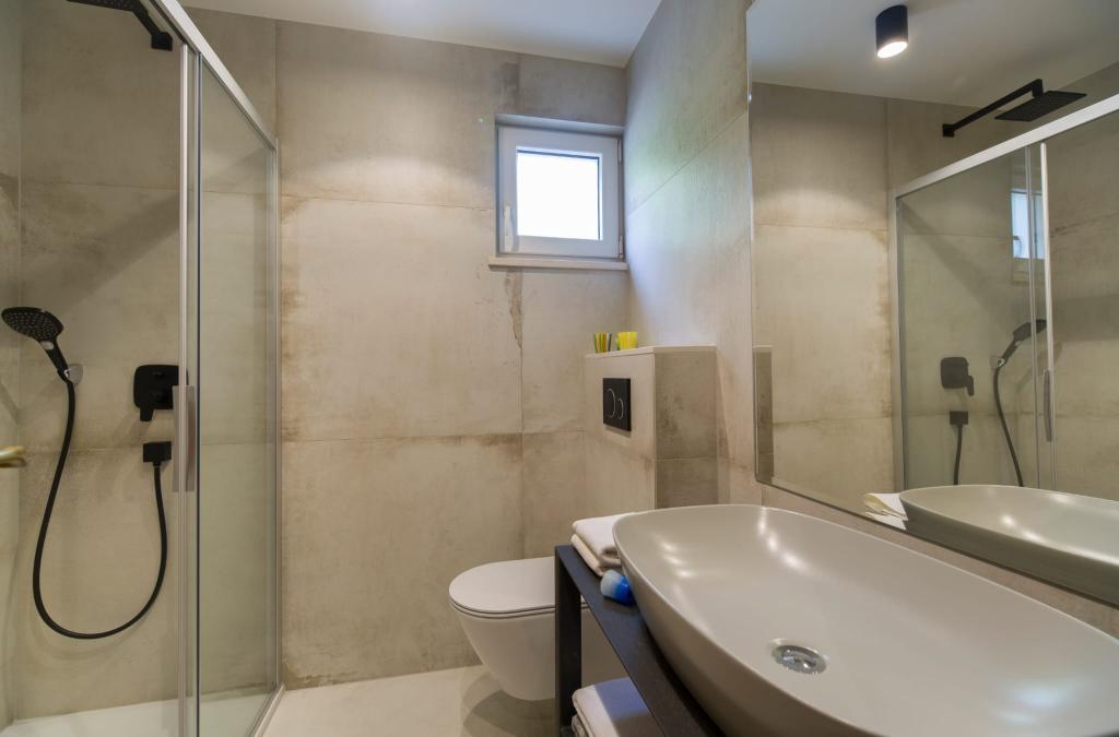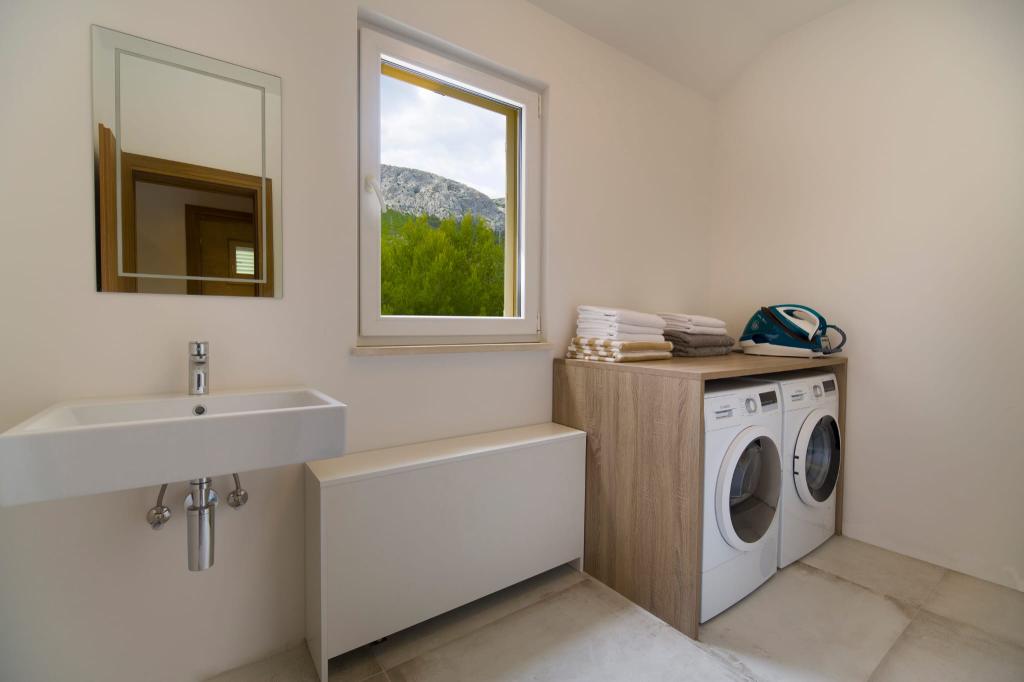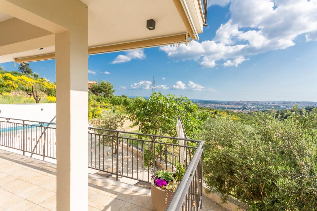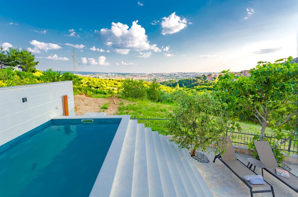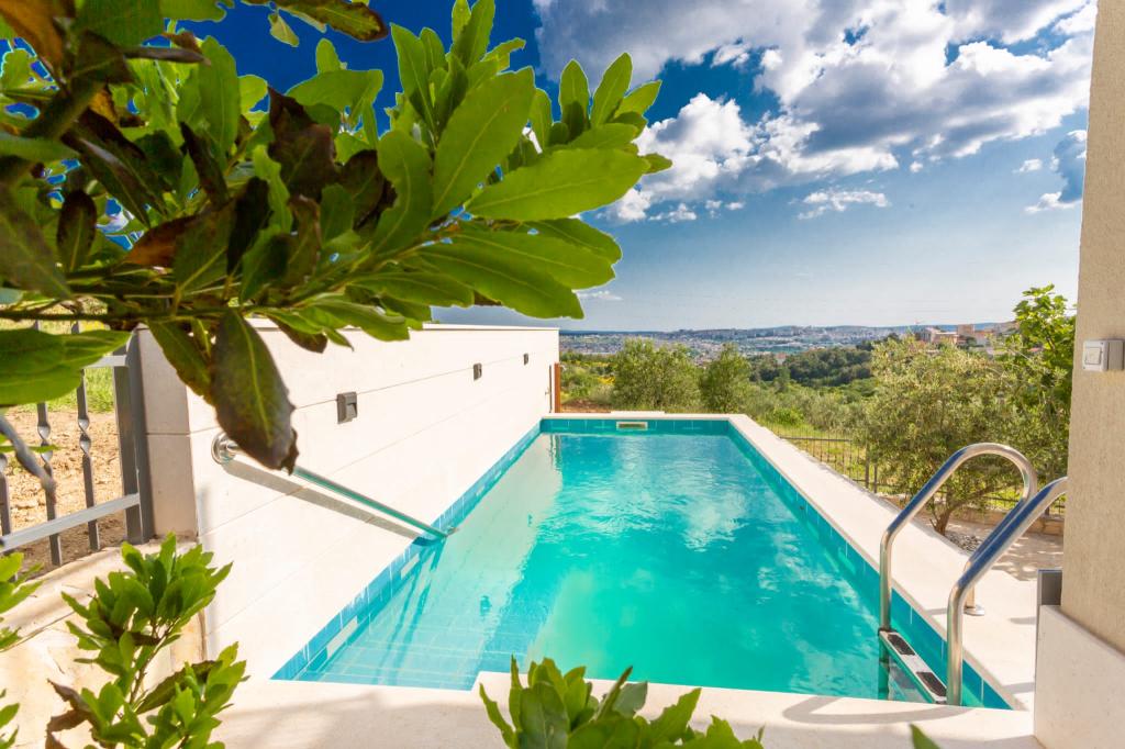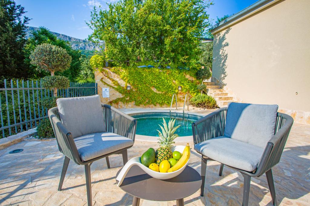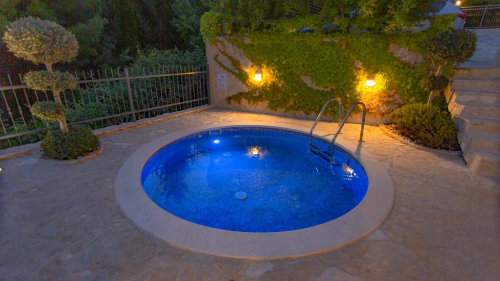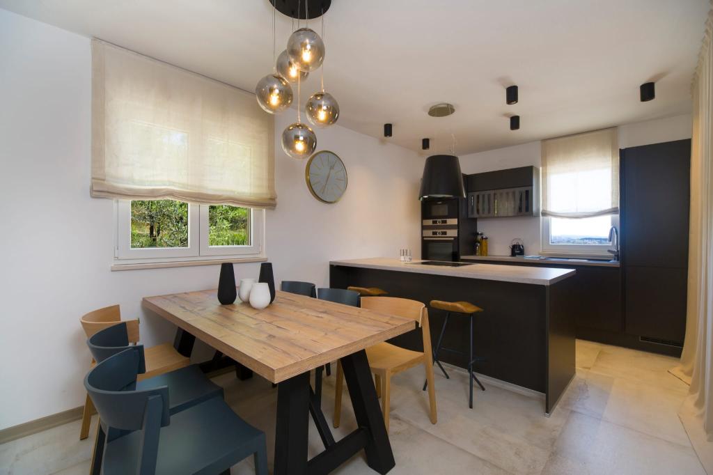 Vila se proteže na dvije etaže ukupne površine 180 četvornih metara.Prizemlje ove ljepotice sastoji se od potpuno opremljene kuhinje s blagovaonicom i udobnog dnevnog boravka. U kuhinji ćete pronaći sve što vam je potrebno za pripremu i posluživanje hrane, a blagovaonica je opremljena za 8 osoba.Dnevni boravak će tijekom dana biti mjesto za opuštanje uz TV,a tijekom noći možete se odmoriti na kauču koji može poslužiti kao pomoćni ležaj.Iz dnevnog boravka stepenice vas vode na gornji kat gdje se nalaze 3 spavaće sobe kao i jedna zajednička kupaonica. Sve tri spavaće sobe imaju izlaz na balkon s prekrasnim panoramskim pogledom na vrt ili okolicu. Dvije spavaće sobe imaju bračne krevete, dok preostale dvije imaju po dva odvojena kreveta. Kuću okružuje pomno uređen mediteranski vrt. Na južnoj strani nalazi se grijani bazen s ležaljkama za uživanje na suncu. Za trenutke potpunog opuštanja pronaći ćete jacuzzi u stražnjem dijelu kuće te roštilj pokraj balkona.