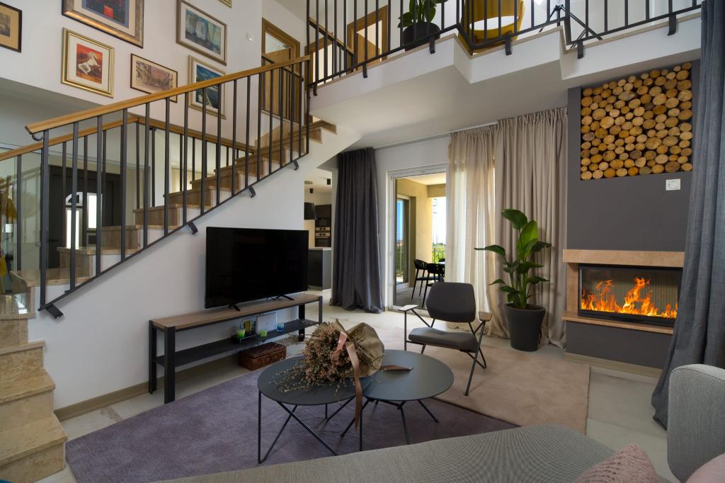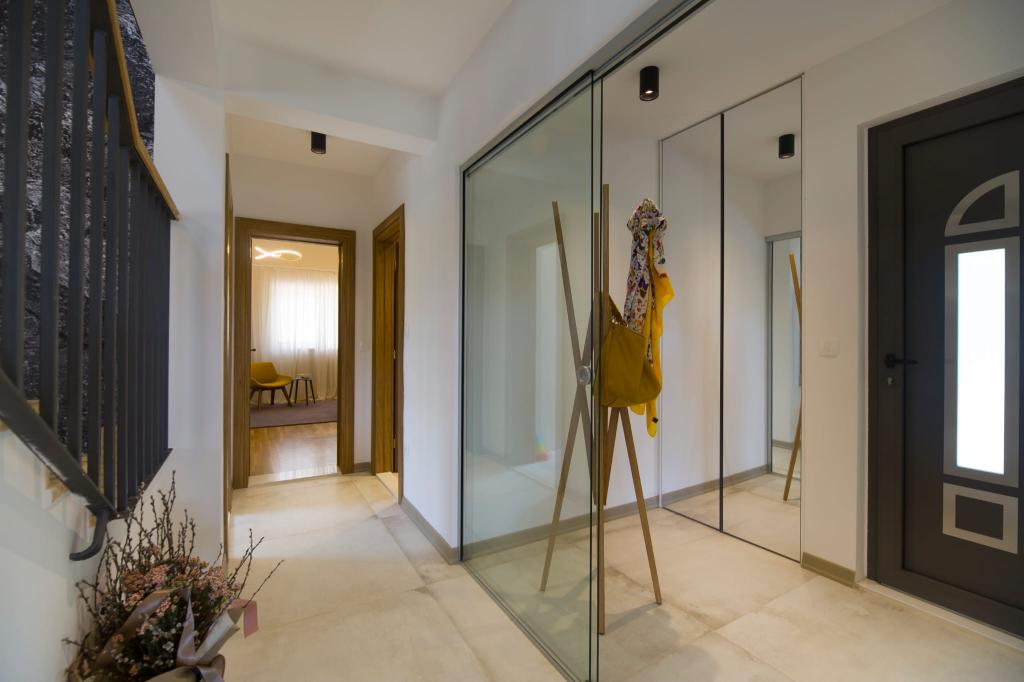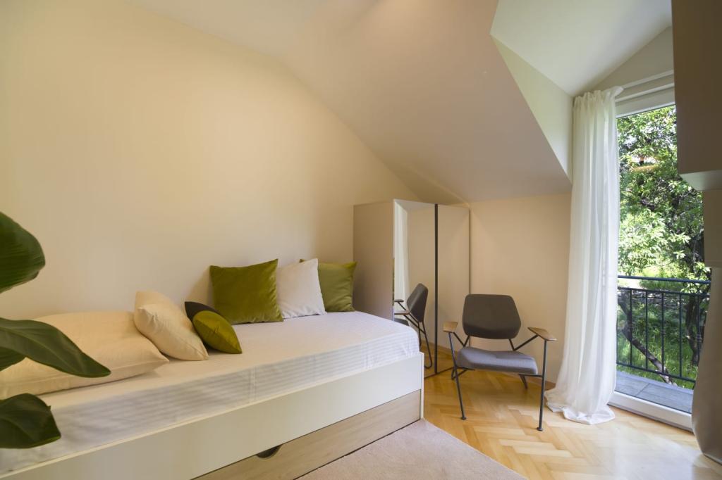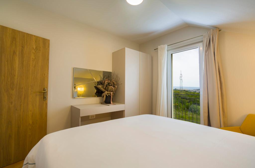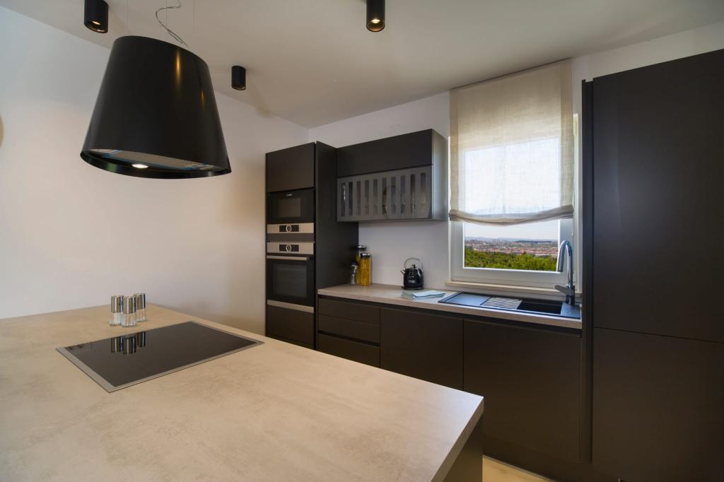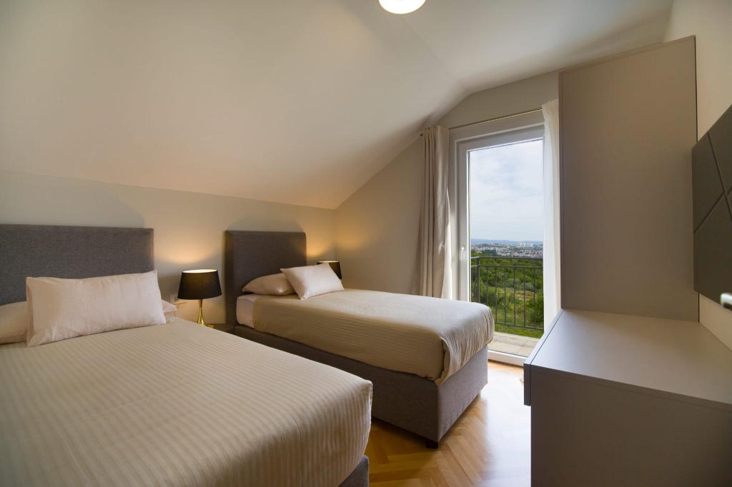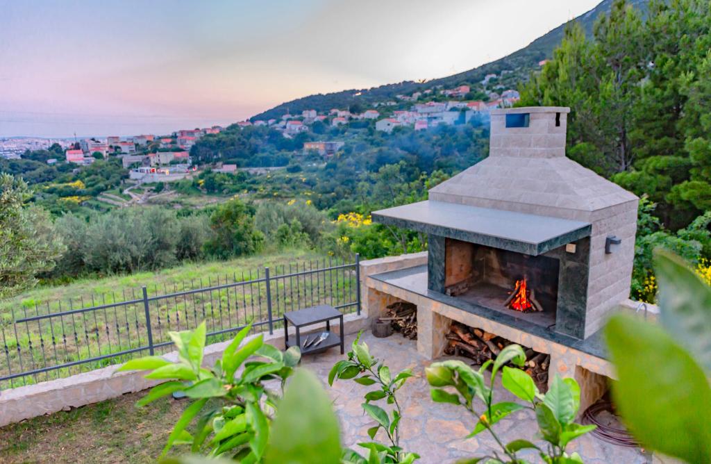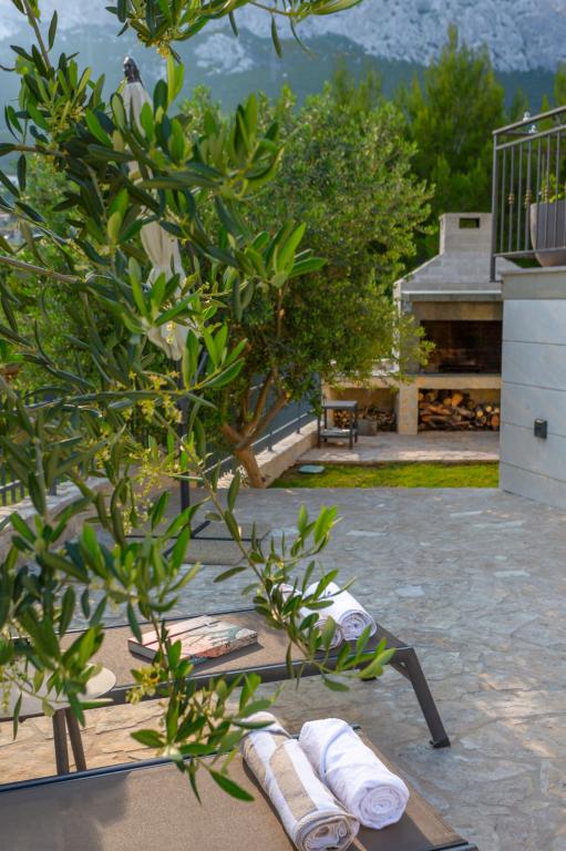 Vila se proteže na dvije etaže ukupne površine 180 četvornih metara.Prizemlje ove ljepotice sastoji se od potpuno opremljene kuhinje s blagovaonicom i udobnog dnevnog boravka. U kuhinji ćete pronaći sve što vam je potrebno za pripremu i posluživanje hrane, a blagovaonica je opremljena za 8 osoba.Dnevni boravak će tijekom dana biti mjesto za opuštanje uz TV,a tijekom noći možete se odmoriti na kauču koji može poslužiti kao pomoćni ležaj.Iz dnevnog boravka stepenice vas vode na gornji kat gdje se nalaze 3 spavaće sobe kao i jedna zajednička kupaonica. Sve tri spavaće sobe imaju izlaz na balkon s prekrasnim panoramskim pogledom na vrt ili okolicu. Dvije spavaće sobe imaju bračne krevete, dok preostale dvije imaju po dva odvojena kreveta. Kuću okružuje pomno uređen mediteranski vrt. Na južnoj strani nalazi se grijani bazen s ležaljkama za uživanje na suncu. Za trenutke potpunog opuštanja pronaći ćete jacuzzi u stražnjem dijelu kuće te roštilj pokraj balkona.
