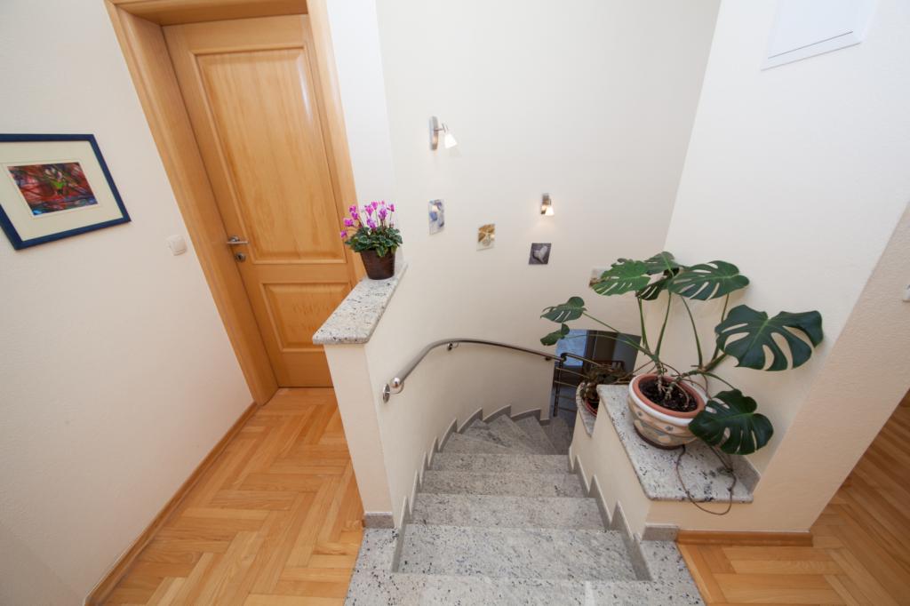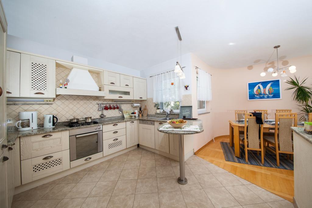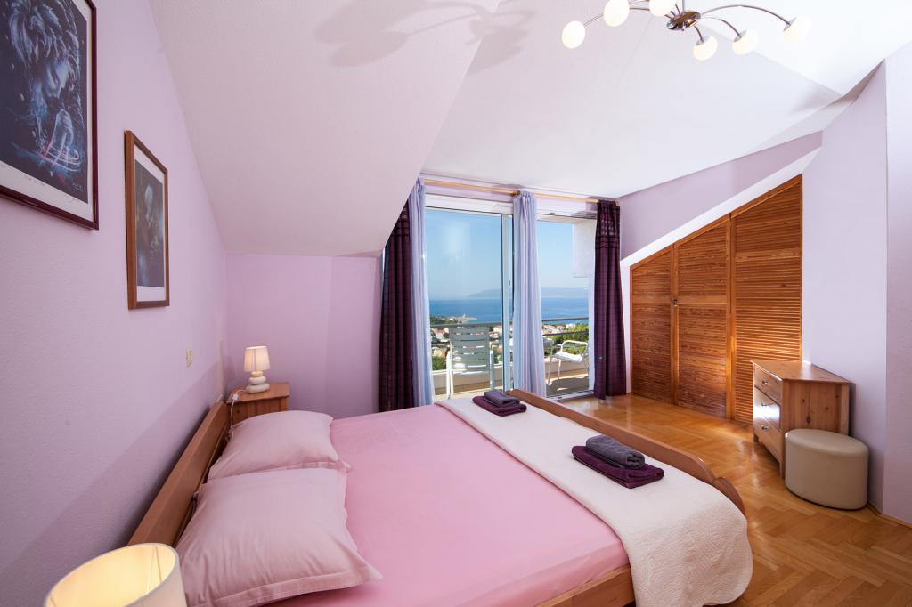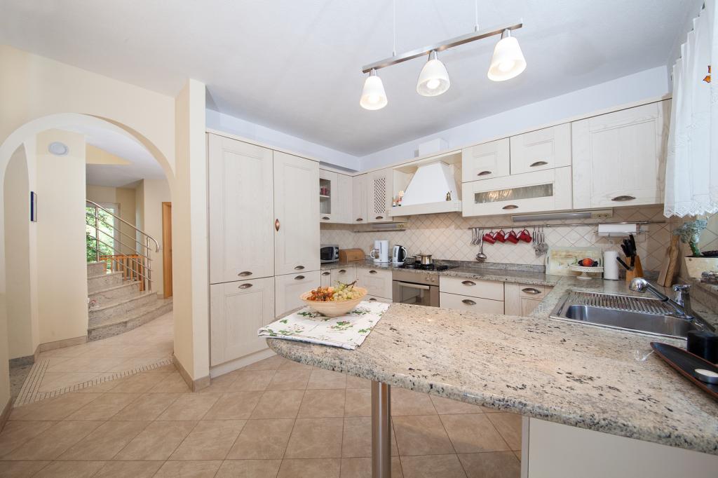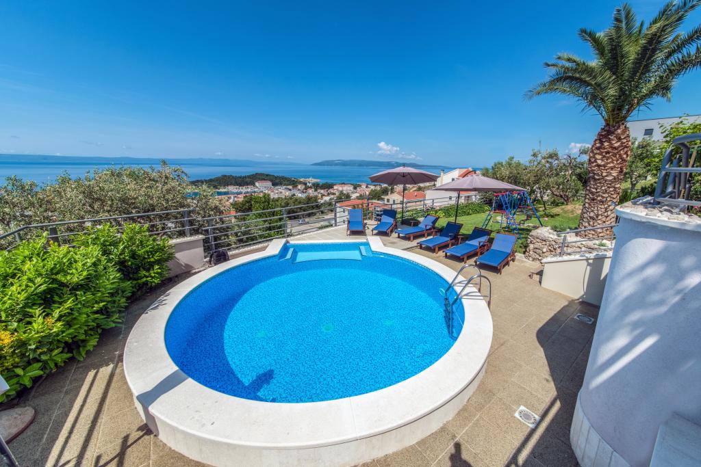 Suvremeno opremljena vila s bazenom iznad samog centra Makarske, okružena zelenim travnatom površinom, povrtnim biljkama, voćnjakom i cvijetnjacima. Na tri etaže i 350 m2 arhitektonskim umijećem raspoređeno je 5 spavaćih soba, 2 dnevne sobe, 5 kupaonica, 6 wc-ea.U kući se može smjestiti 10 osoba na osnovnim i do 6 na pomoćnim ležajevima. Cijene su istaknute za boravak do 11 osoba, ostalo se dodatno naplaćuje. U vili se nalaze i 4 manje manje i veće kuhinje s dvjema perilicama. Vila je klimatizirana. Gosti se mogu služiti grožđem s odrina i svježim smokvama. Možemo organizirati uslugu doručka ili večere. Bazen ispred kuće s kojega puca pogled na grad, luku, more i obližnje otoke promjera je 5 m i dubine 1.50 m. Moguće ju je unajmiti i preko zime ali najmanje tri tjedna. U dvorištu vile moguće je parkirati do 5 vozila. Uz kuću se nalazi konoba s roštiljem.