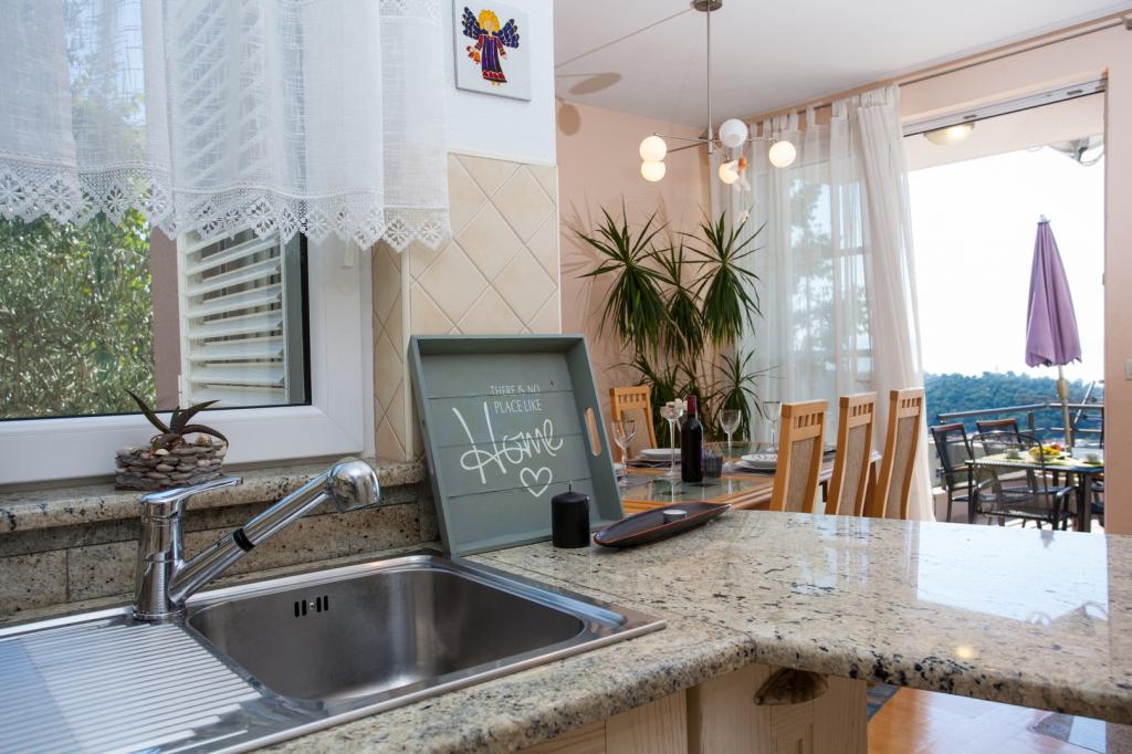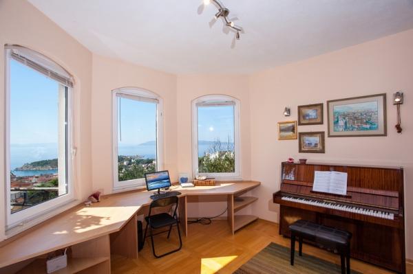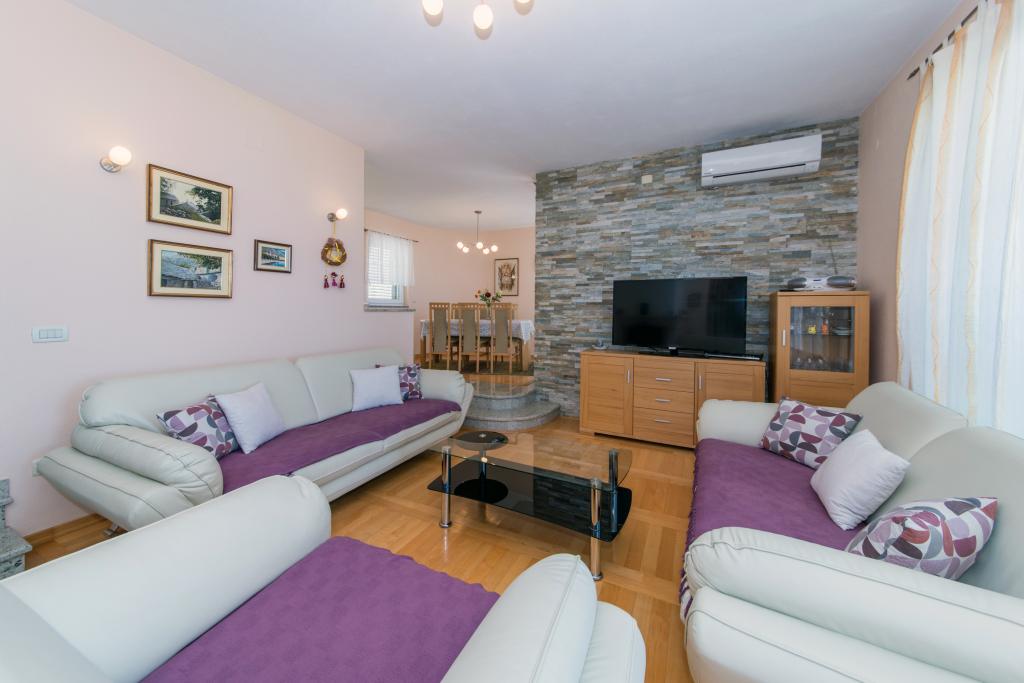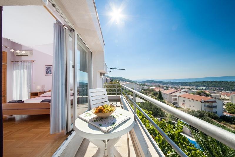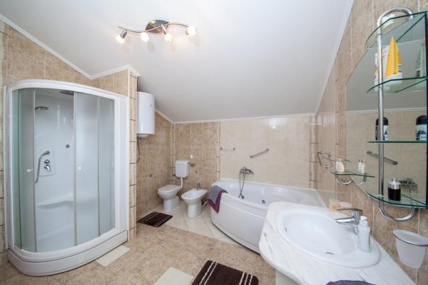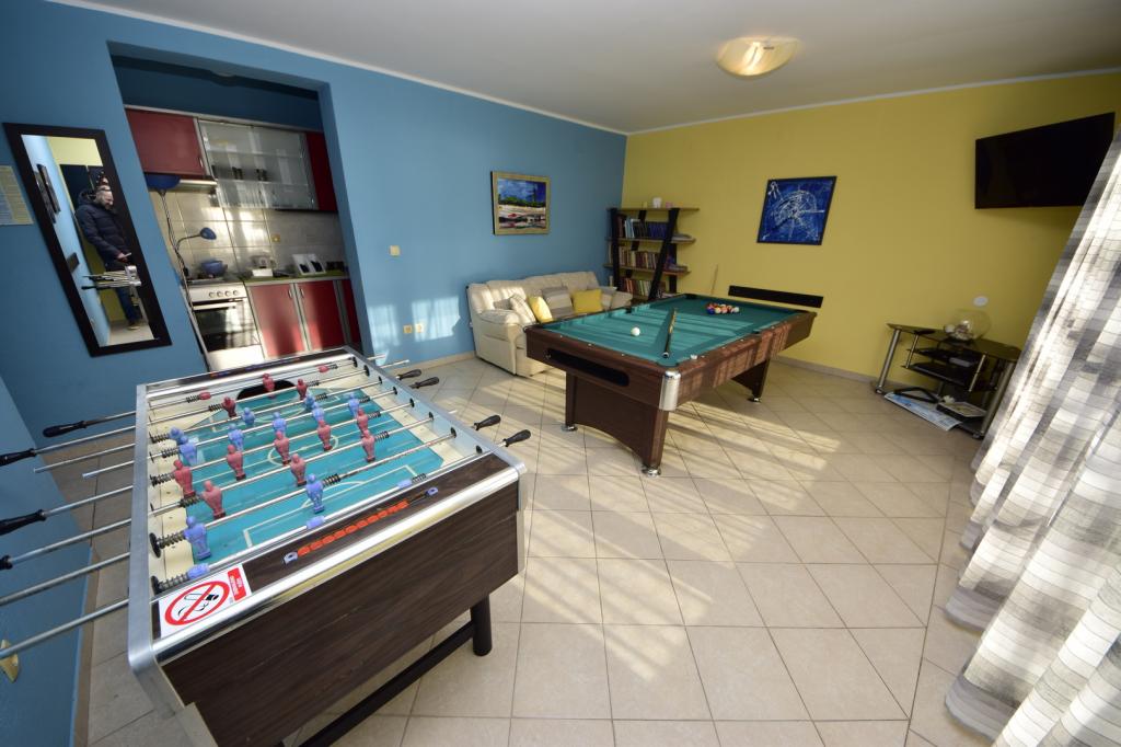 Suvremeno opremljena vila s bazenom iznad samog centra Makarske, okružena zelenim travnatom površinom, povrtnim biljkama, voćnjakom i cvijetnjacima. Na tri etaže i 350 m2 arhitektonskim umijećem raspoređeno je 5 spavaćih soba, 2 dnevne sobe, 5 kupaonica, 6 wc-ea.U kući se može smjestiti 10 osoba na osnovnim i do 6 na pomoćnim ležajevima. Cijene su istaknute za boravak do 11 osoba, ostalo se dodatno naplaćuje. U vili se nalaze i 4 manje manje i veće kuhinje s dvjema perilicama. Vila je klimatizirana. Gosti se mogu služiti grožđem s odrina i svježim smokvama. Možemo organizirati uslugu doručka ili večere. Bazen ispred kuće s kojega puca pogled na grad, luku, more i obližnje otoke promjera je 5 m i dubine 1.50 m. Moguće ju je unajmiti i preko zime ali najmanje tri tjedna. U dvorištu vile moguće je parkirati do 5 vozila. Uz kuću se nalazi konoba s roštiljem.