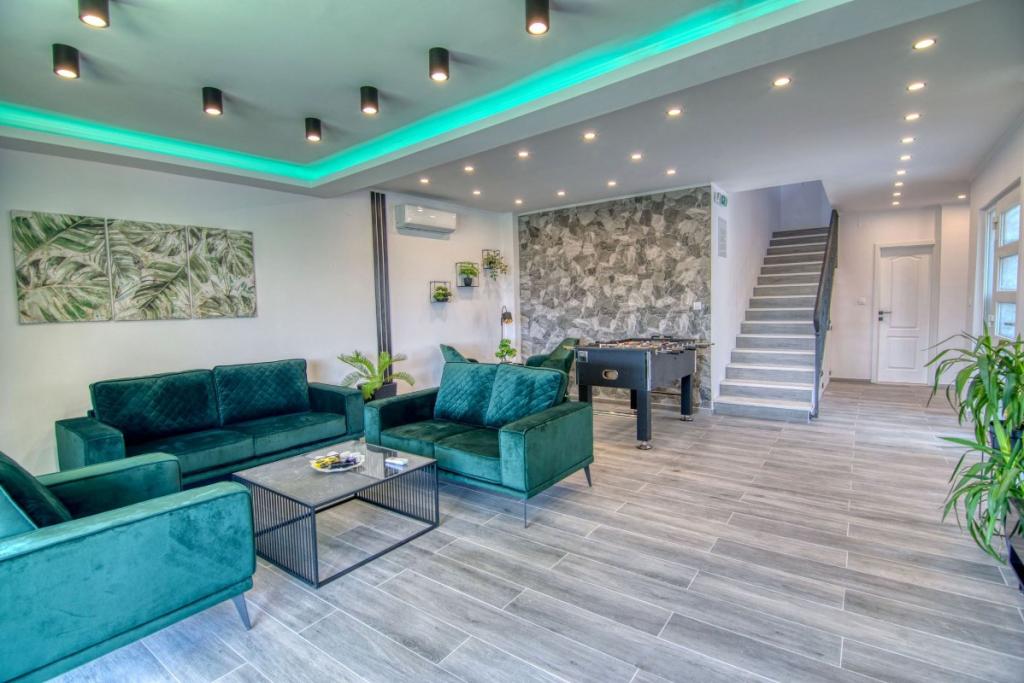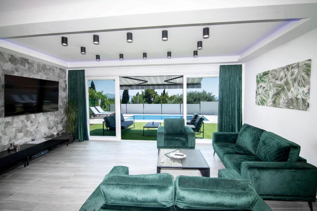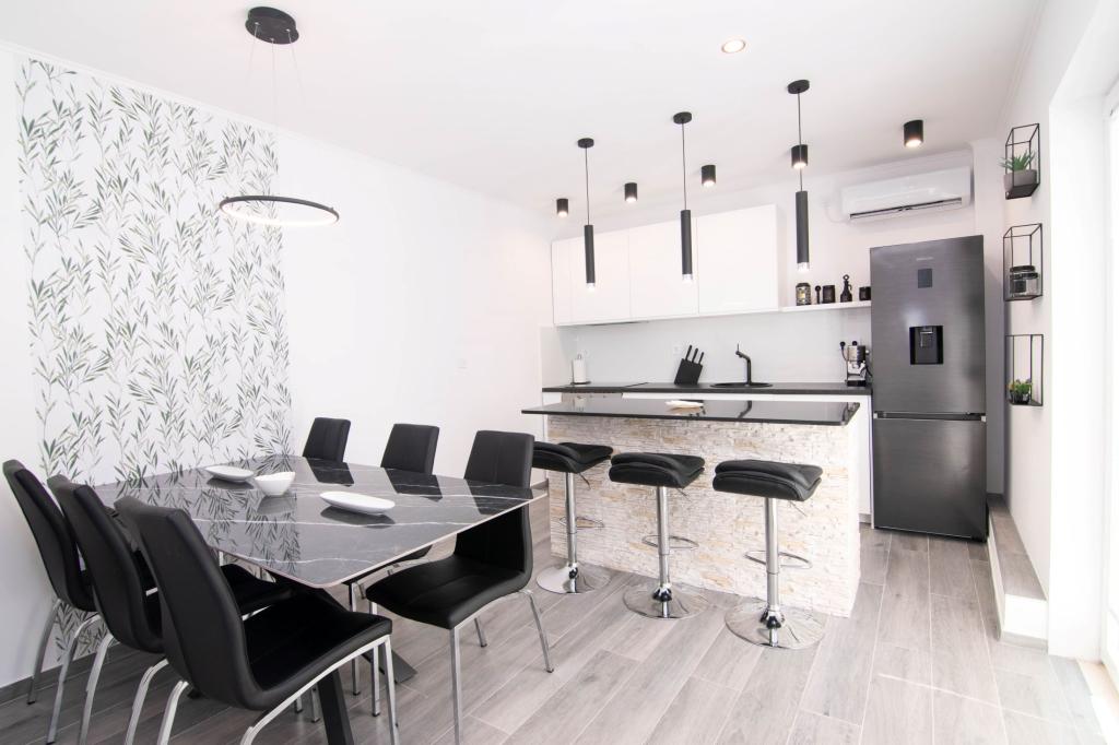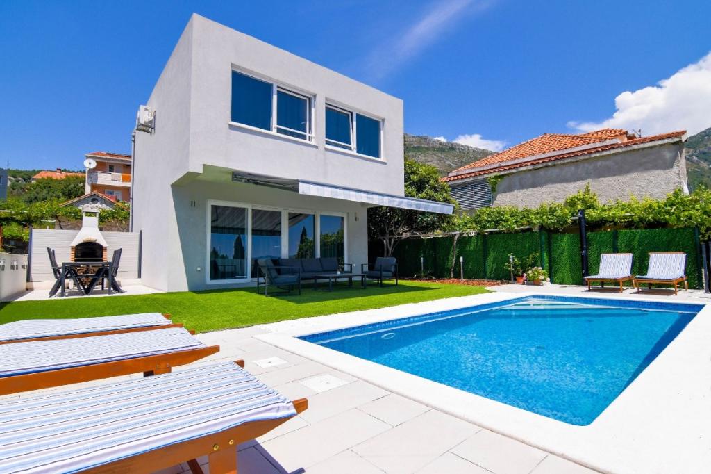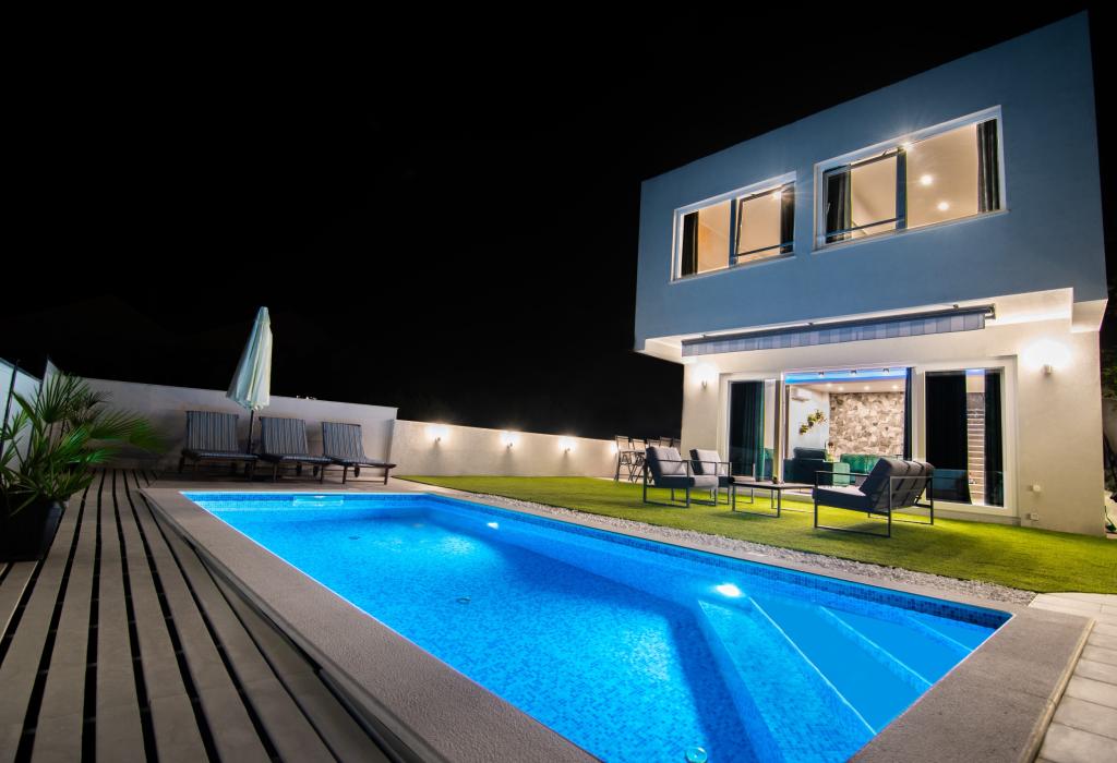 Kompletno i suvremeno opremljena vila sa bazenom na izvrsnoj lokaciji , udaljenost od plaže, centra, kafića i trgovina između 200-400m. Objekt posjeduje bazen dimenzija 6 x 3 metra. unutar ville su 3 sobe svaka sa svojom kupaonicom, veliki dnevni boravak i kuhinja, svi prostori su klimatizirani.