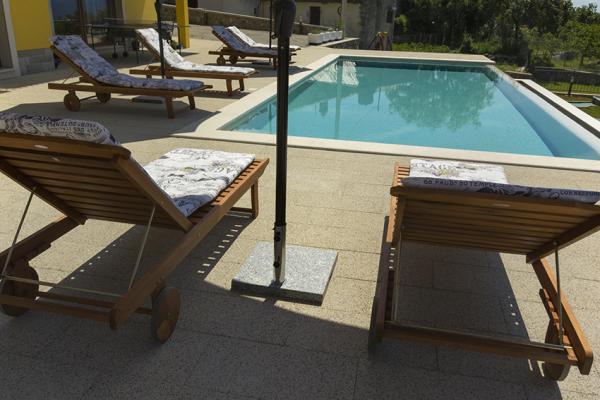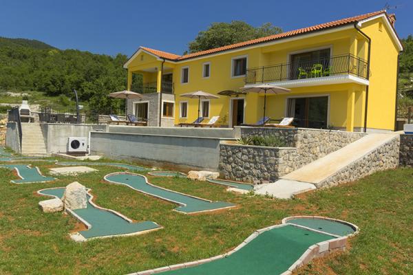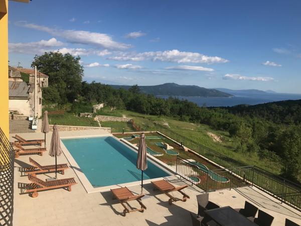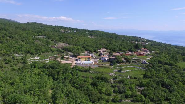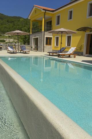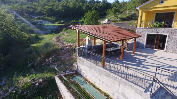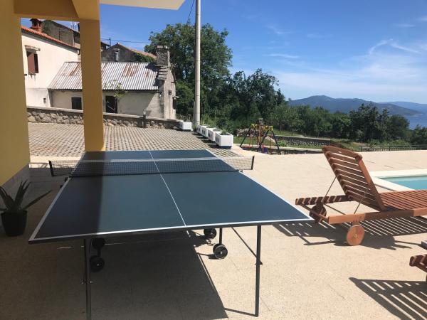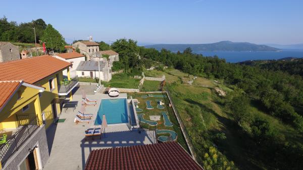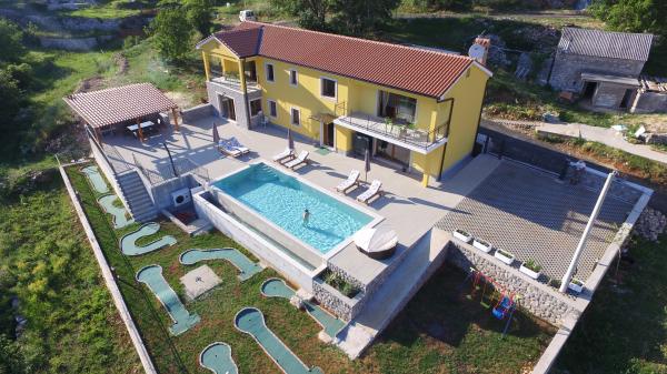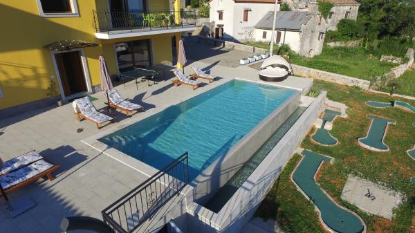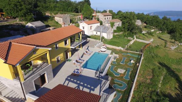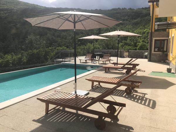 Villa je kompetno opremjena sa grijanim preljevnim bazenom veličine 10 x 4 m. Villa može primiti od 6 -8 osoba. Posjeduje whillpool i saunu. Ima 2 garažna mjesta. Prostor oko bazena je popločen a ispod bazena se nalazi minigolf sa 9 rupa. Kuća ima 6000 m2 vrta u kojem se može ubrat sviježe voće i povrće. Do Mošćenićke Drage je udaljena 10 minuta autom. U okolici ima puno šumskih staza za planinarenje i vožnju biciklom. Kuća se nalazi u malom selu od ukupno 4 kuće bez stanara