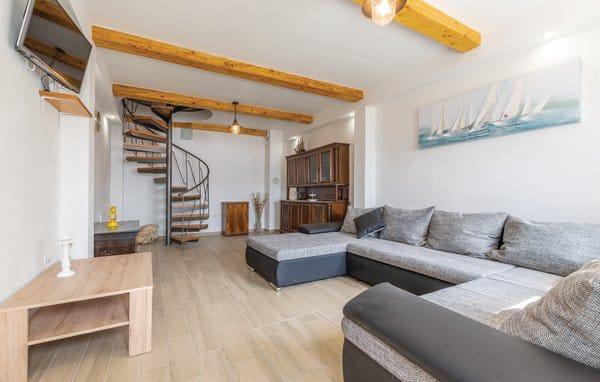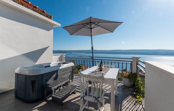 Dvojna kuća za odmor smještena je na uzvisini malog mjesta Stanići pokraj Omiša, raspolaže trima etažama povezanim unutarnjim i vanjskim stepenicama. Uz sobu na drugom katu nalazi se čajna kuhinja. Terasa pruža panoramski pogled na more i otoke koji oduzima dah, a prekrasne šljunčane plaže nalaze se svega oko 450m dalje. U 5 km udaljenom Omišu naći ćete sadržaje i zabavu za sve generacije. Posebno obilježje ovog prostora je rijeka Cetina sa mogućnošću raftinga i drugih riječnih aktivnosti.