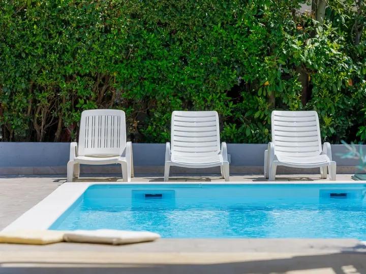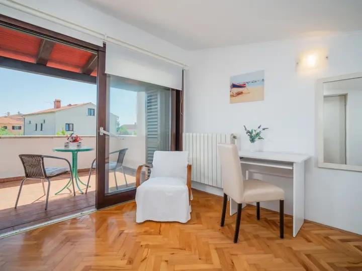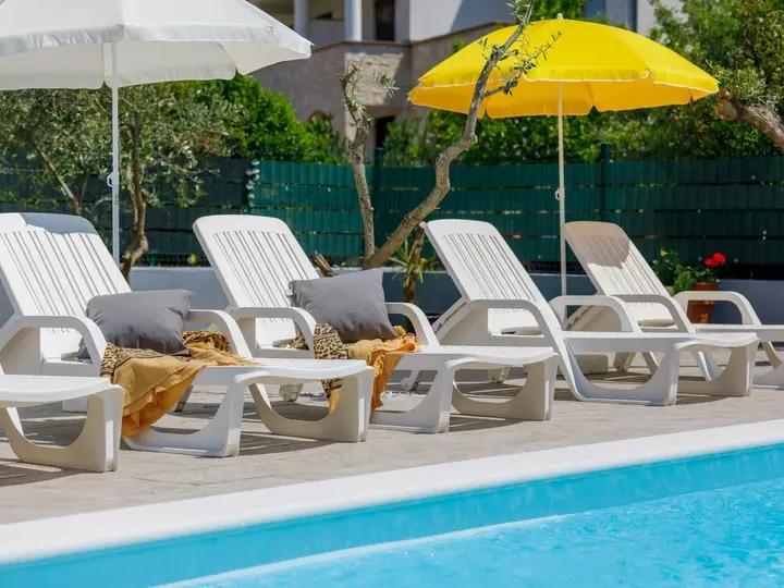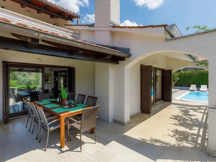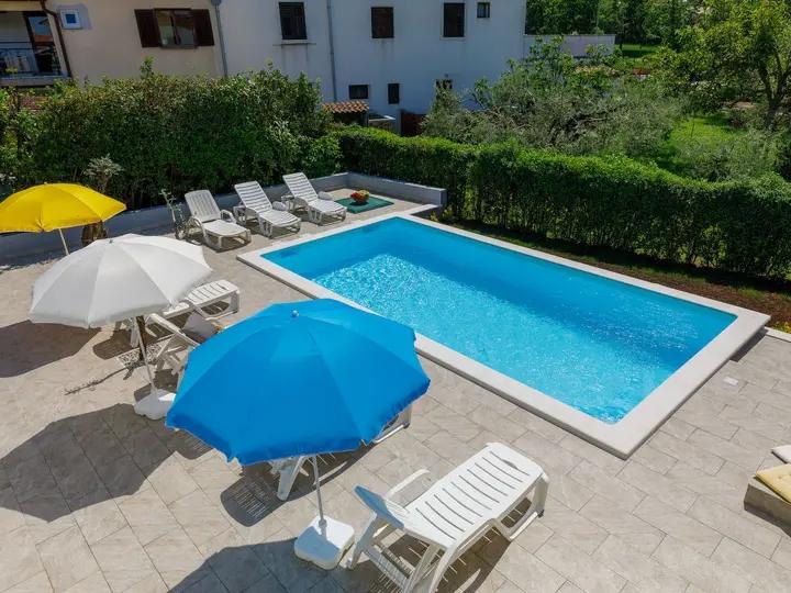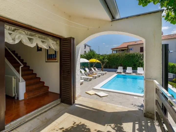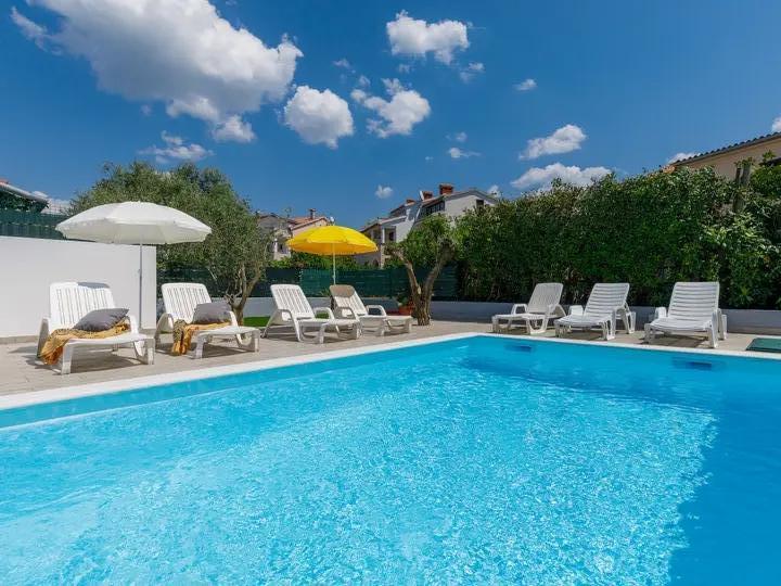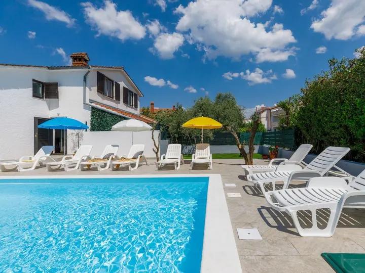 Vila s bazenom, dvije etaže unutrašnje površine 200m2, tri terase i okućnica s travnjakom 500 m2 .Bazen je veličine 24 m2, dužine 7 m i širine 3,5 m i roštiljem. Vila se nalazi u mirnom mjestu Špadići 2 km od centra Poreča, 1 km od mora i plaže. Kuća ima vlastiti parking. Unutarnji prostor vile sastoji se: dnevni boravak/blagovaona 50 m2 s TV-om sa sat. prijemnikom i DVD-om i klima uređajem. Izlaz na terasu. Terasa 30 m2. Dvokrevetna soba s izlazom na bazen i sunčalište. Otvorena kuhinja (pećnica, perilica za suđe, staklokeramička ploče za kuhanje, zamrzivač).Tuš/WC. Gornji kat: galerija. 1 soba s 1 franc. krevetom (160 cm, dužina 200 cm). Izlaz na terasu, 8 m2, garnitura za sjedenje,1 soba s bračnim krevetom (2 x 90 cm, dužina 200 cm). s pogledom na zelenu površinu, sunčalište i bazen, 1 soba s pogledom na bazen s 2 kreveta (90 cm, dužina 200 cm). Kada/WC. Na raspolaganju: dječji krevetić (uz doplatu). WiFI uključen.