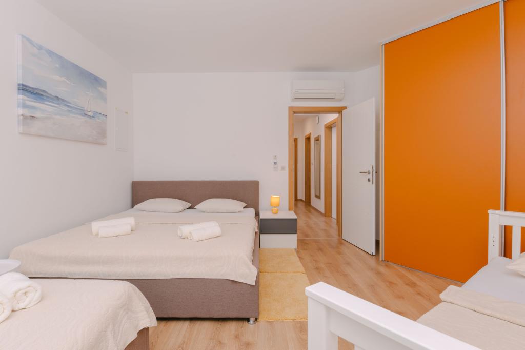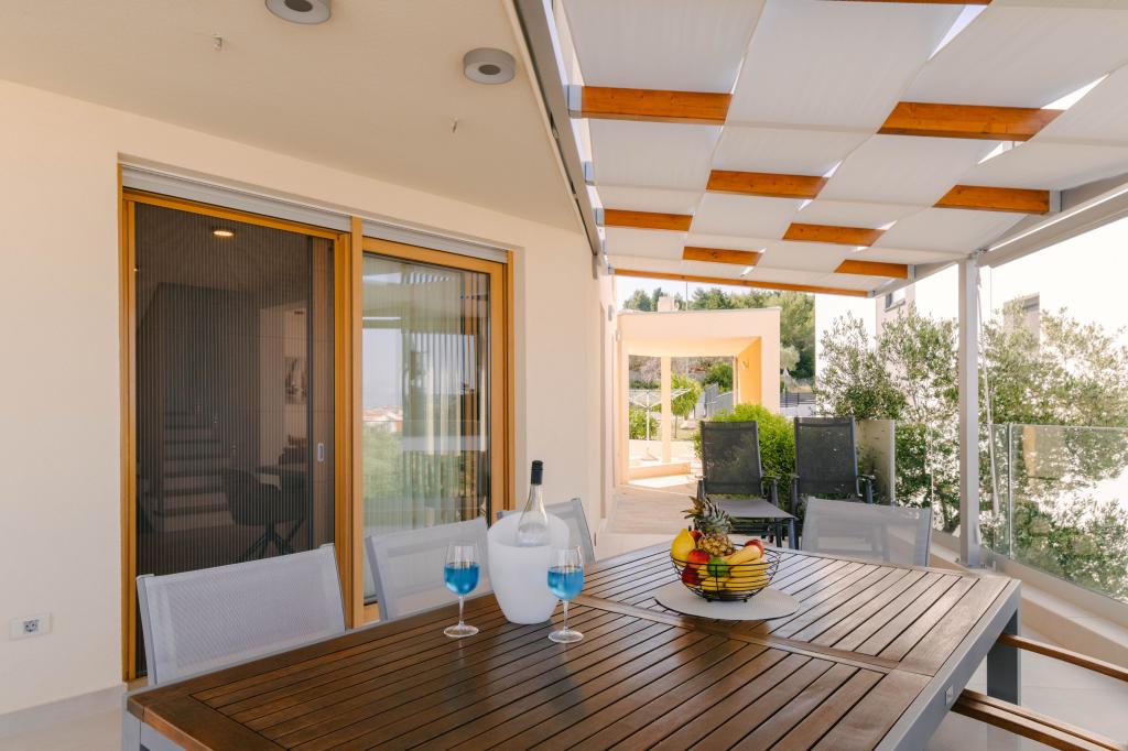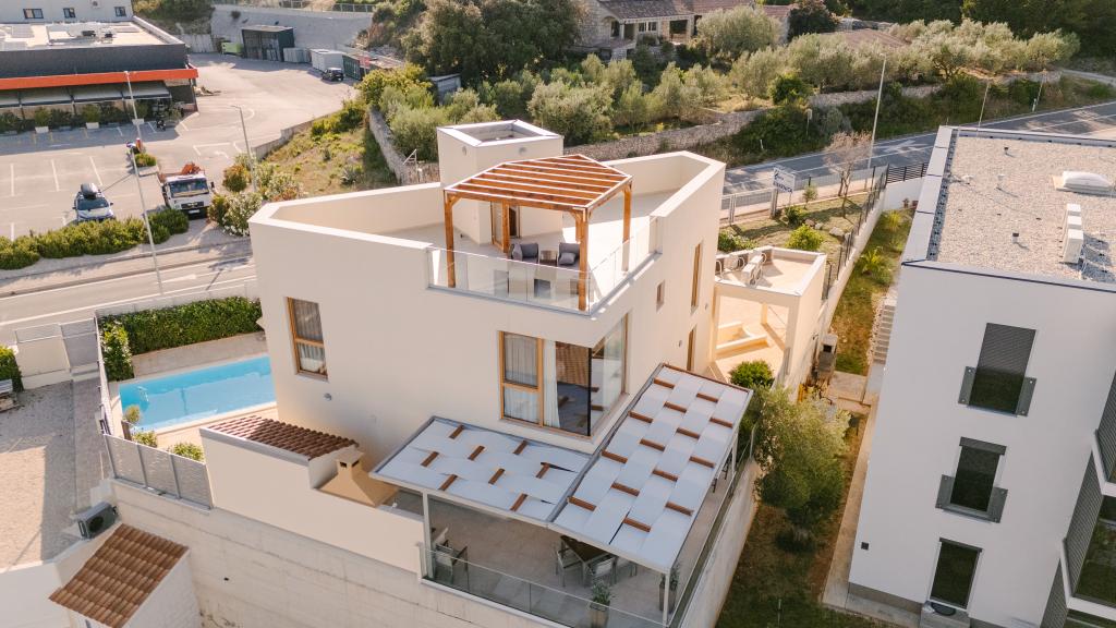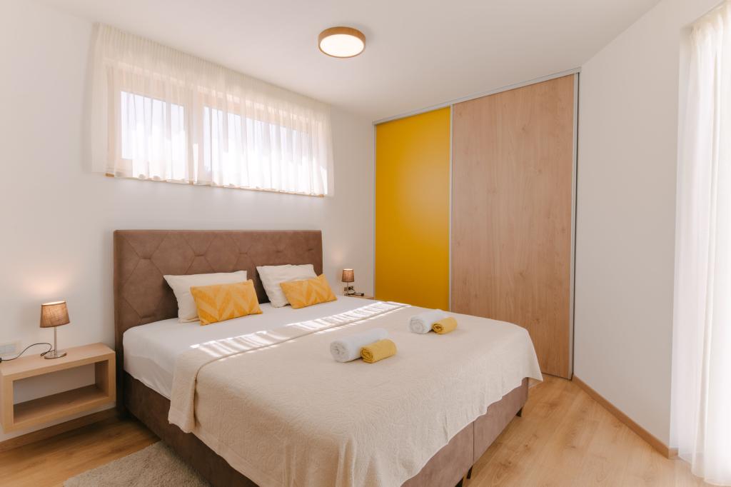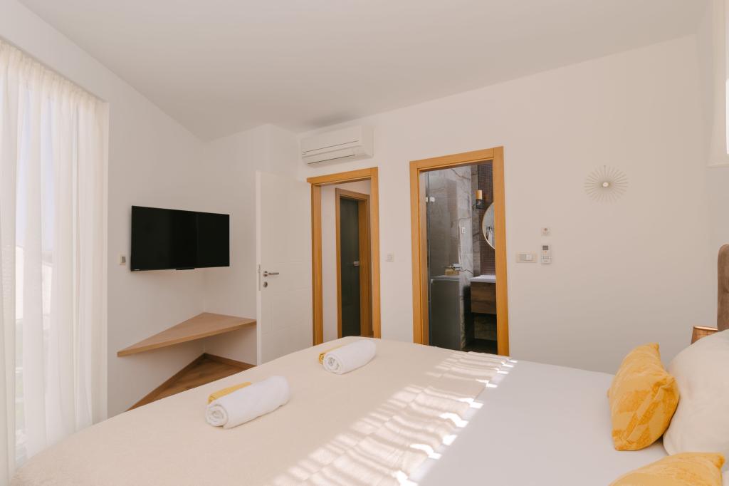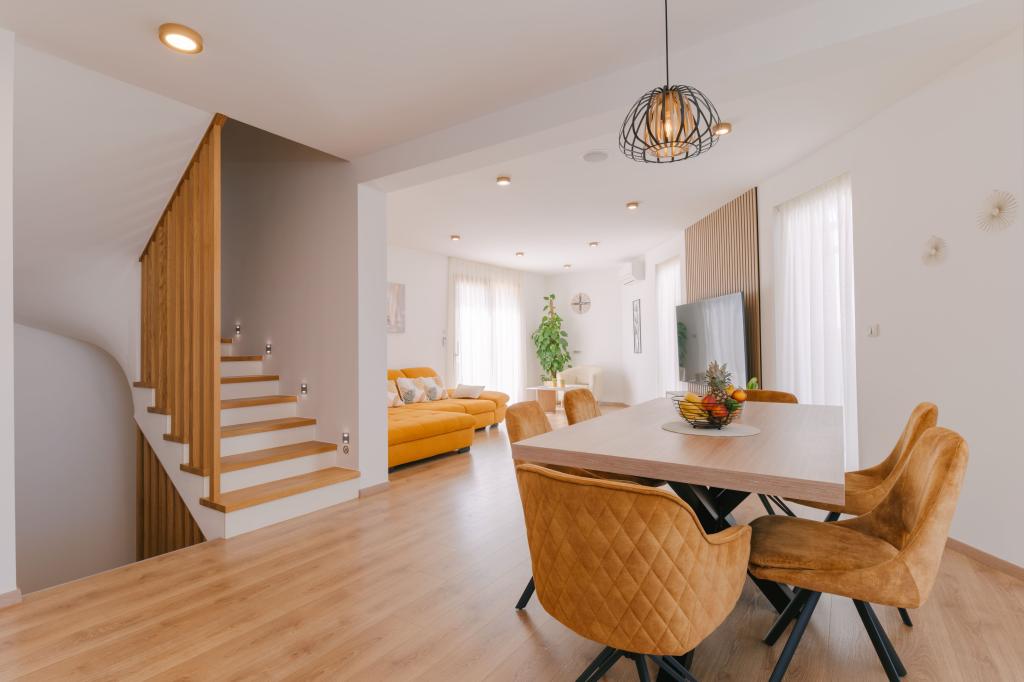 Tri moderne glavne spavaće sobe nalaze se na katu, dok se jedna gostinjska soba nalazi u podrumu. Sve kupaonice opremljene su vrhunskim Grohe i Laufen armaturama, prestižnim dizajnerskim keramičkim pločicama i elegantnim staklenim vratima. Kuća je službeno kategorizirana od strane Ministarstva turizma RH, što omogućuje udoban smještaj za 9, čak i 10 gostiju. Otvoreni dnevni boravak i blagovaonica, kao i svaka spavaća soba, opremljeni su individualnim klima uređajima s tihim načinom rada, savršenim za miran san. Moderna kuhinja, poznatog austrijskog brenda DanKüchen, potpuno je opremljena vrhunskim aparatima, uključujući hladnjak s ledomatom i aparat za hladnu vodu.