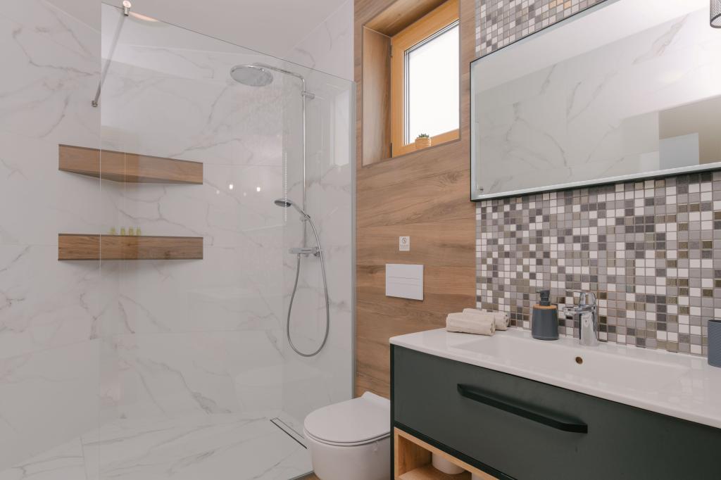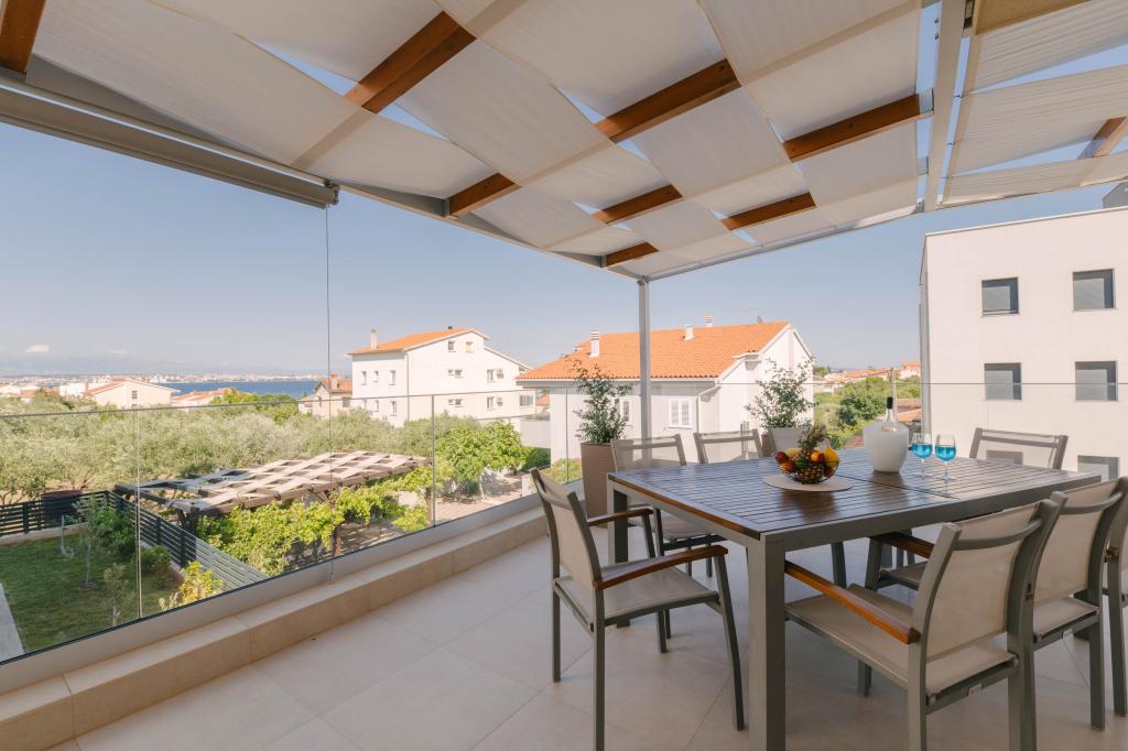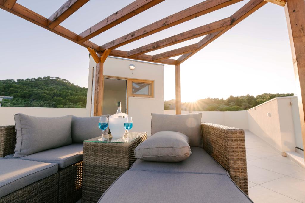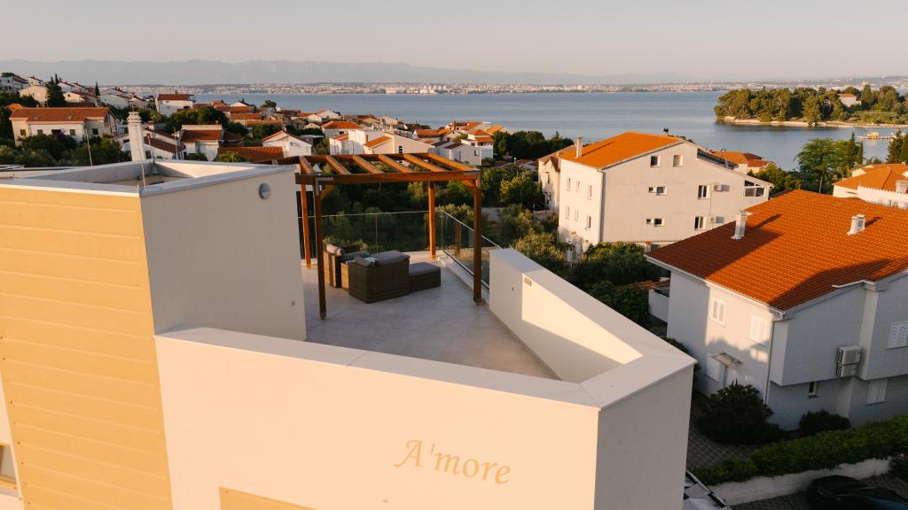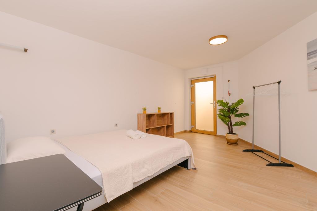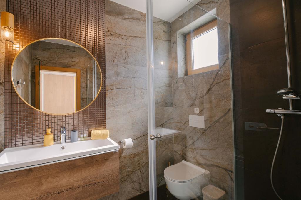 Tri moderne glavne spavaće sobe nalaze se na katu, dok se jedna gostinjska soba nalazi u podrumu. Sve kupaonice opremljene su vrhunskim Grohe i Laufen armaturama, prestižnim dizajnerskim keramičkim pločicama i elegantnim staklenim vratima. Kuća je službeno kategorizirana od strane Ministarstva turizma RH, što omogućuje udoban smještaj za 9, čak i 10 gostiju. Otvoreni dnevni boravak i blagovaonica, kao i svaka spavaća soba, opremljeni su individualnim klima uređajima s tihim načinom rada, savršenim za miran san. Moderna kuhinja, poznatog austrijskog brenda DanKüchen, potpuno je opremljena vrhunskim aparatima, uključujući hladnjak s ledomatom i aparat za hladnu vodu.