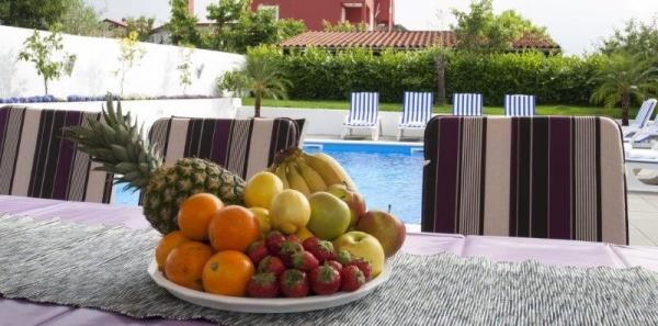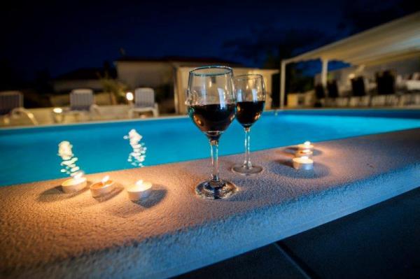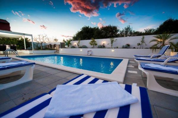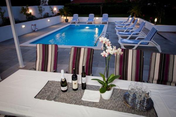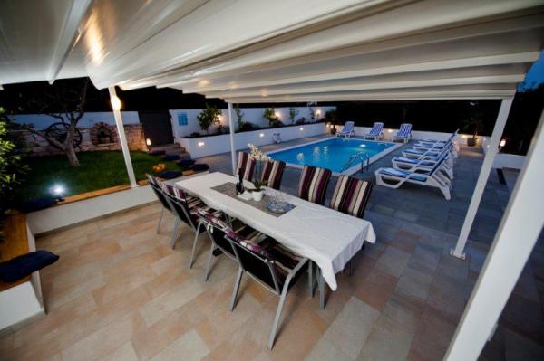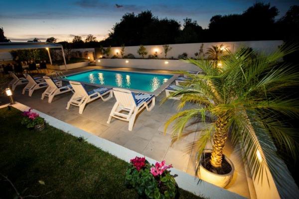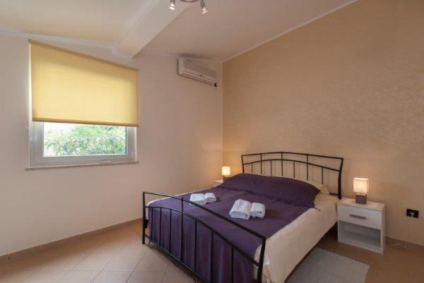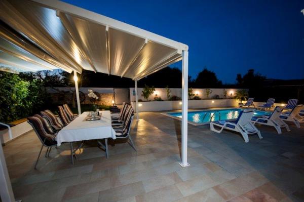 Ova suvremena i kompletno opremljena vila sa bazenom, dvojna kuća, nalazi se u mirnom predgrađu Rovinja, udaljena je tek 2000 m od centra grada i plaže. Namještena je modernim, stilskim namještajem, a komunikacija između kuhinje i prostranog dnevnog boravka te velike natkrivene terase od 24 m je otvorena. U kući se ukupno nalaze 4 spavaće sobe, veliki dnevni boravak, velika moderno opremljena kuhinja, 2 x kupatilo /WC, 1 x WC, hodnik, SAT-TV, Internet/ Wi-FI, 2 x klima, velika natkrivena terasa koja je opremljena vrtnim namještajem. Iza kuće se nalazi bazen veličine 24 m2. Za potpunu relaksaciju tu vam je na raspolaganju grill, nadstrešnica, stol i stolice za ručavanje te ležaljke.