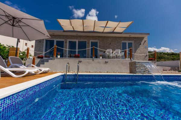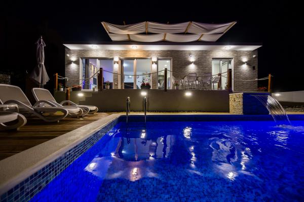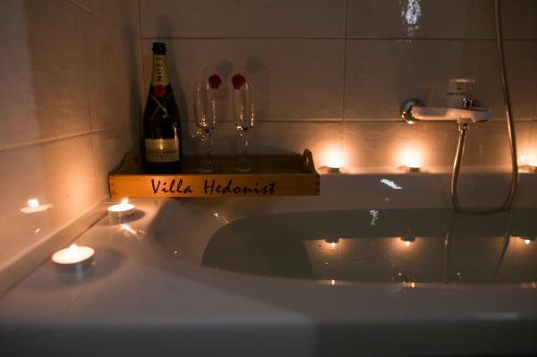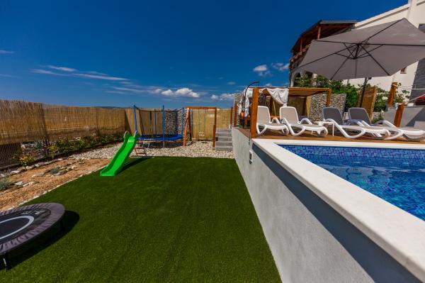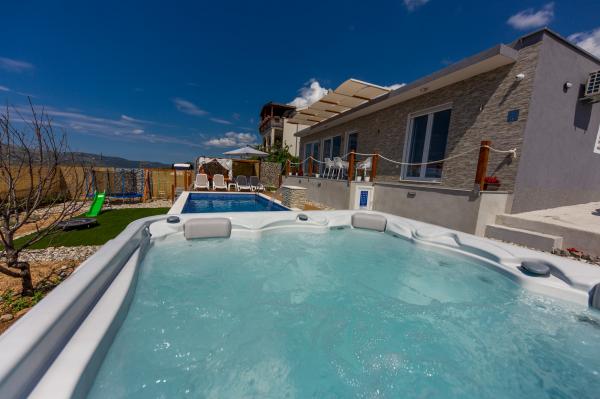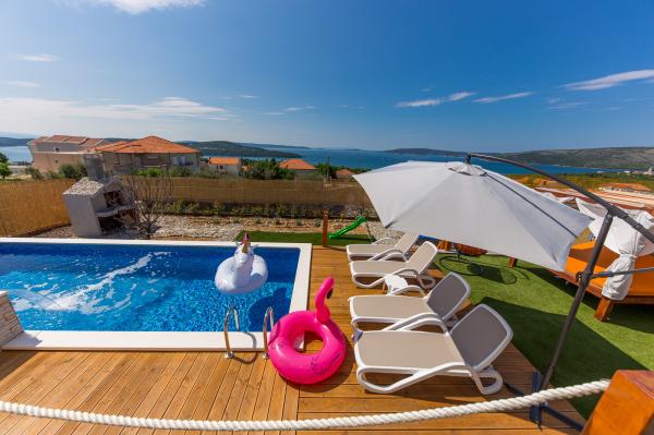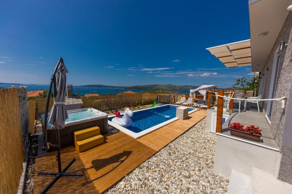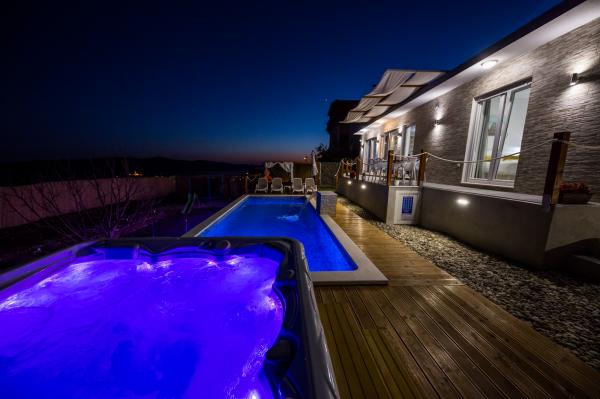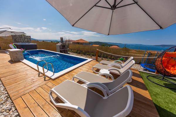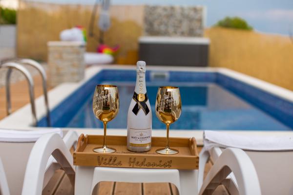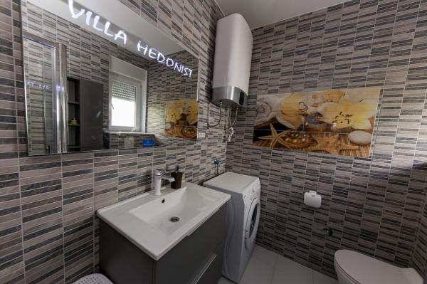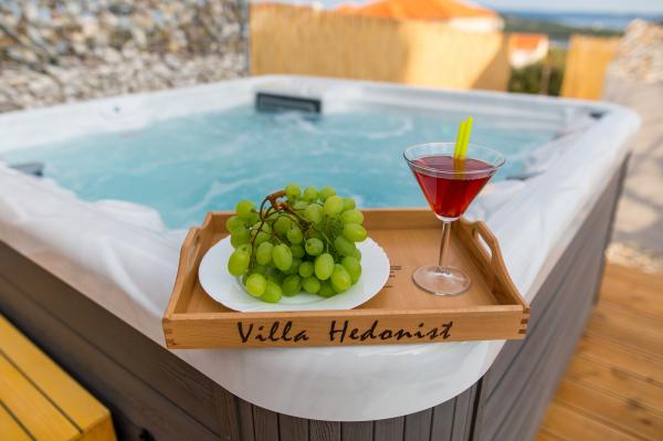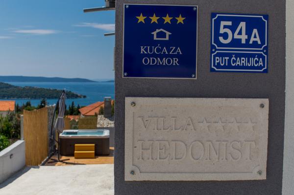 VILLA HEDONIST je smještena u Seget Vranjici 3km od Trogira. Sadrži 5 kupaonica, 4 sobe, finsku saunu, teretanu, dnevni boravak te kuhinju i blagovaonicu. Svaka soba ima svoju kupaonicu te satelitsku televiziju, klima udređaj, sef, ormar...ispred kuće je bazen od 28m2 s 6 lezaljki i drvenim krevetom s nadstresnicom. Uz bazen je jacuzzi za 5 osoba. U vrtu je umjetna trava s igralistem za djecu, trampulinom, ljuljackama, toboganom, te roštiljem. Iza kuće je parking za 3 automobila.