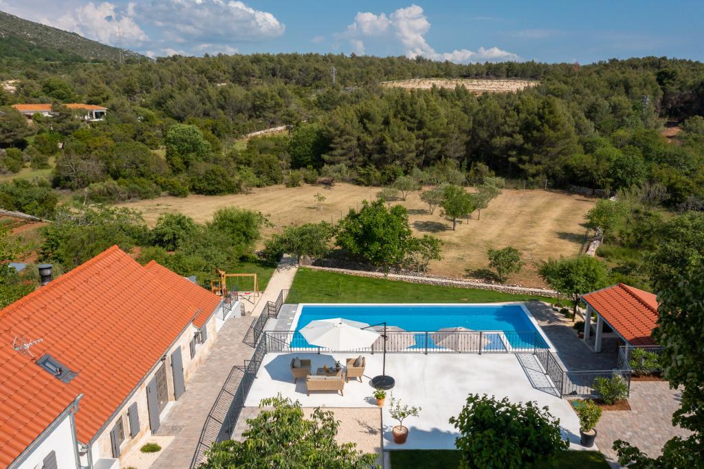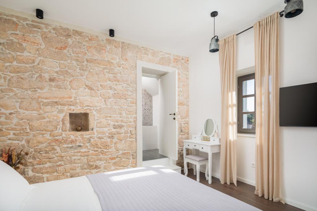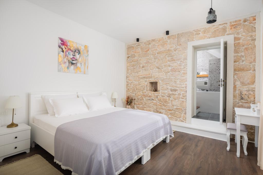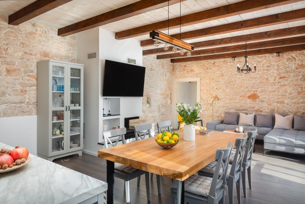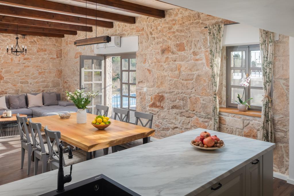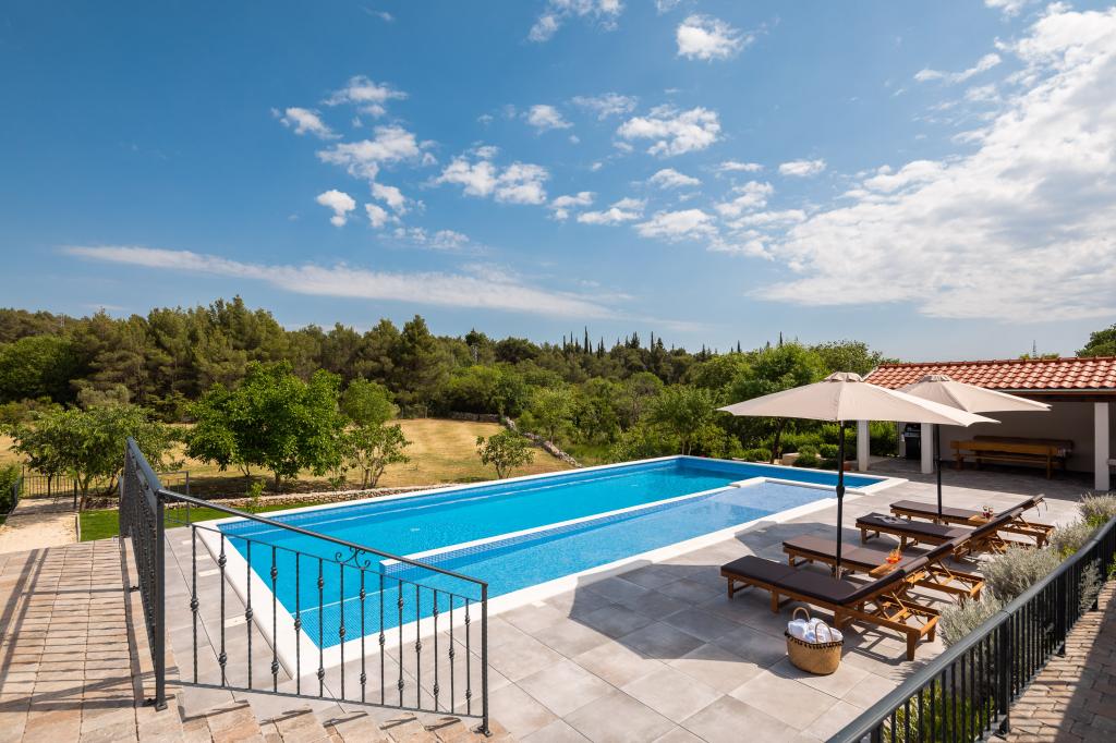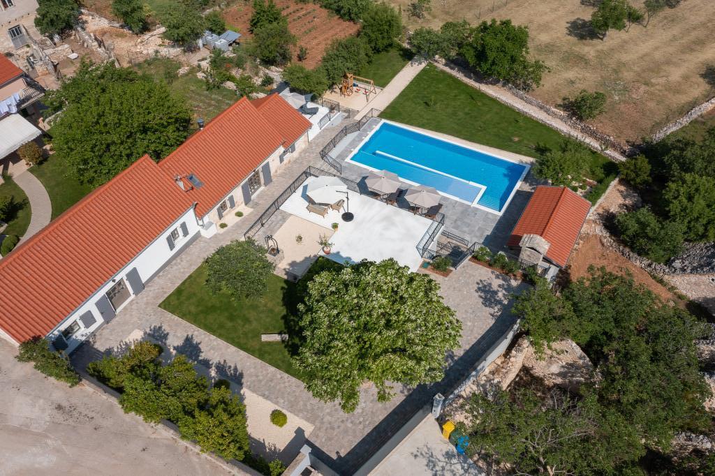 Želite li osjetiti čari Dalmacije okruženi zelenilom ,daleko od svakodnevne gužve, naša autentična kamena kuća u predgrađu Šibenika je idealna za vas. Interijer od 160 m2 u kombinaciji kamena ,drva i modernih motiva stvara izuzetan osjećaj topline i udobnosti. Kuća može primiti u goste 8 osoba u tri sobe sa krevetima i vlastitim kupaonicama. Dva dodatna ležaja mogu se prirediti u dnevnom boravku. Na usluzi je i dječji krevet. Kuhinja je potpuna uređena sa svim potrebnim za kuhanje i pečenje. Prostrana terasa i vanjska blagovaonica su idealne za druženje uz roštilj na vanjskom kaminu. Po potrebi tu je i plinski roštilj . Velika okućnica (1390m2) sa livadom i šumom (+ 2200m2) idealna je za razigranu djecu i kućne ljubimce. U velikom i lijepom bazenu ( 86 m2). možete u svakom trenutku naći osvježenje. BAZEN JE PRILAGOĐEN ZA OSOBE SA INVALIDITETOM I IMA UGRAĐENO GRIJANJE Plaže, restorani ,NP Krka , kulturni spomenici i spomenici pod zaštitom UNESCO-a ,udaljeni su 8 kilometara
