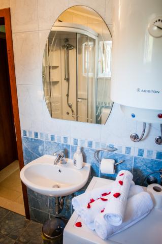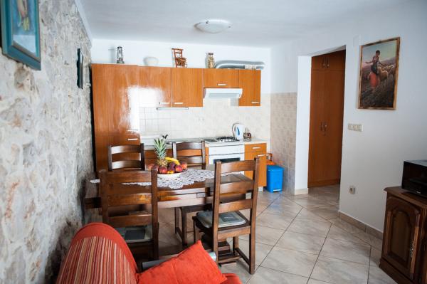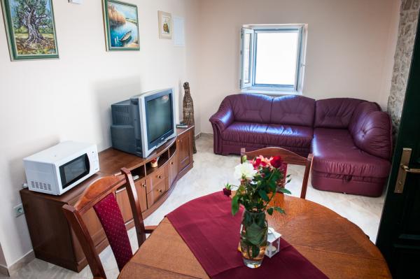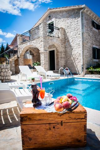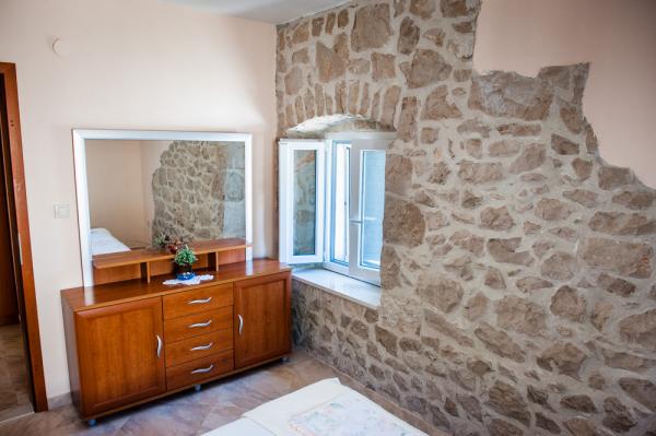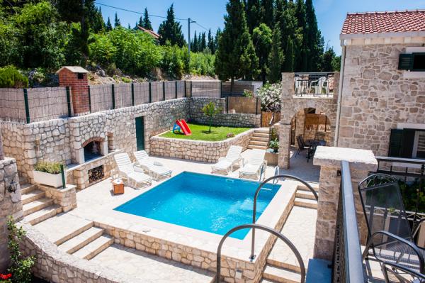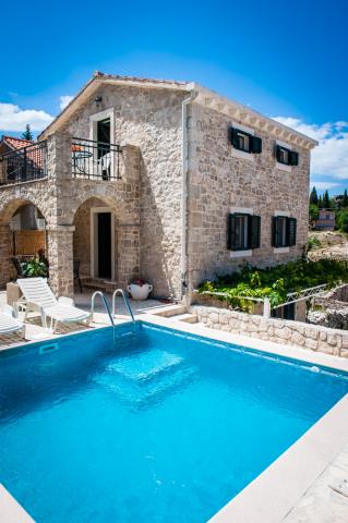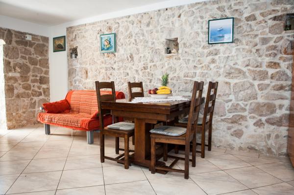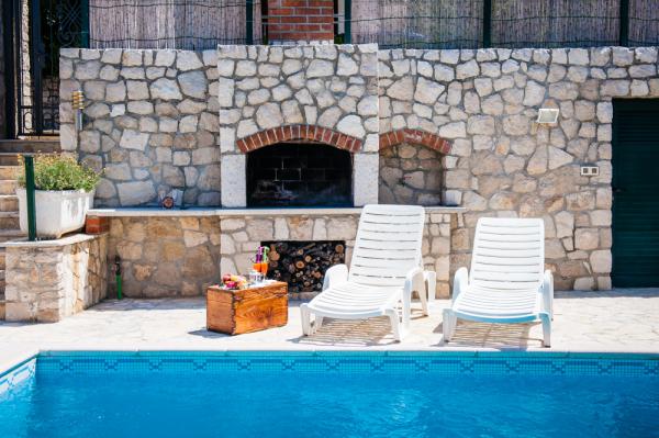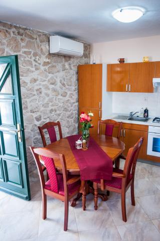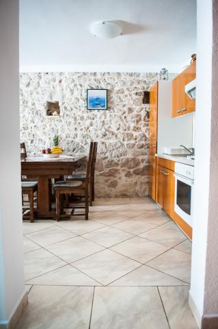 Turistička pristojba je uključena u cijenu.kuća se sastoji od 3 apartmana -Prizemlje se sastoji od prekrasne spavaće sobe sa velikim krevetom, moderne kupaonice sa masažnom tuš kadom. Potpuno opremljena kuhinja i dnevna soba sa ležajem na razvlačenje. Na velikoj terasi u hladovini od vinove loze se nalazi veliki drveni stol za 12 osoba. -Drugi kat ima isti raspored kao prizemlje ali je dekoriran bojom breskve sa ostacima kamenih zidova koji oduzimaju dah u spoju sa modernim stilom. Lijepa i romantična soba, kupaonica sa kadom i elementima kamenog zida, potpuno opremljena kuhinja i dnevna soba pružiti će zasigurno pravi i opuštajući užitak našim gostima. Ispred se nalazi velika terasa sa vrtnim garniturama, travnjak sa raznim mediteranskim biljem i bazen… - Treći kat ima potpuno isto uređenje kao prizemlje i prvi kat, sa nježno zelenom dekoracijom zidova. Ispred