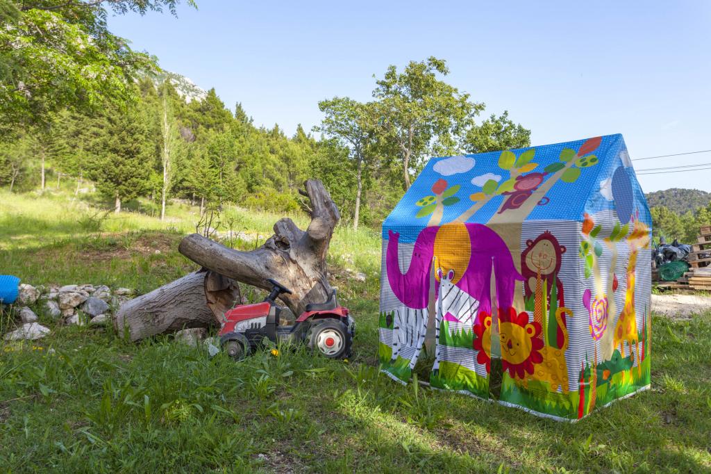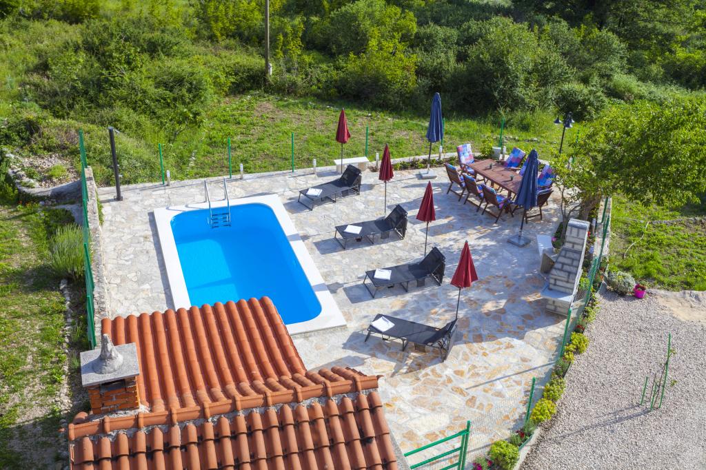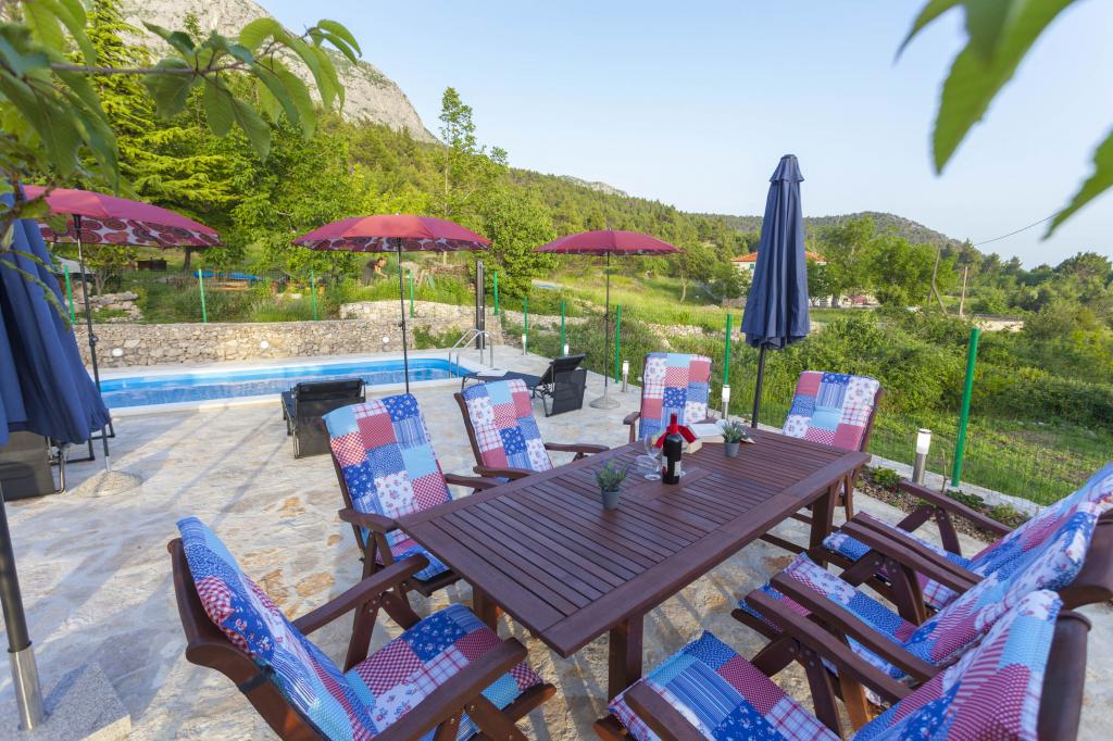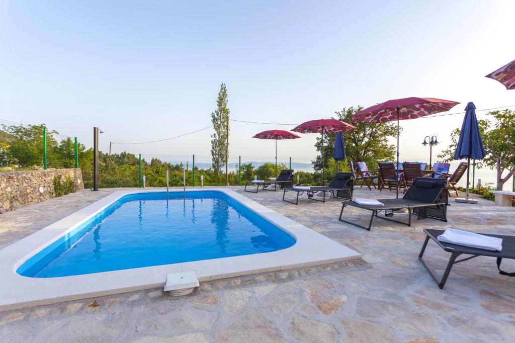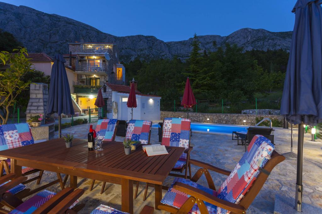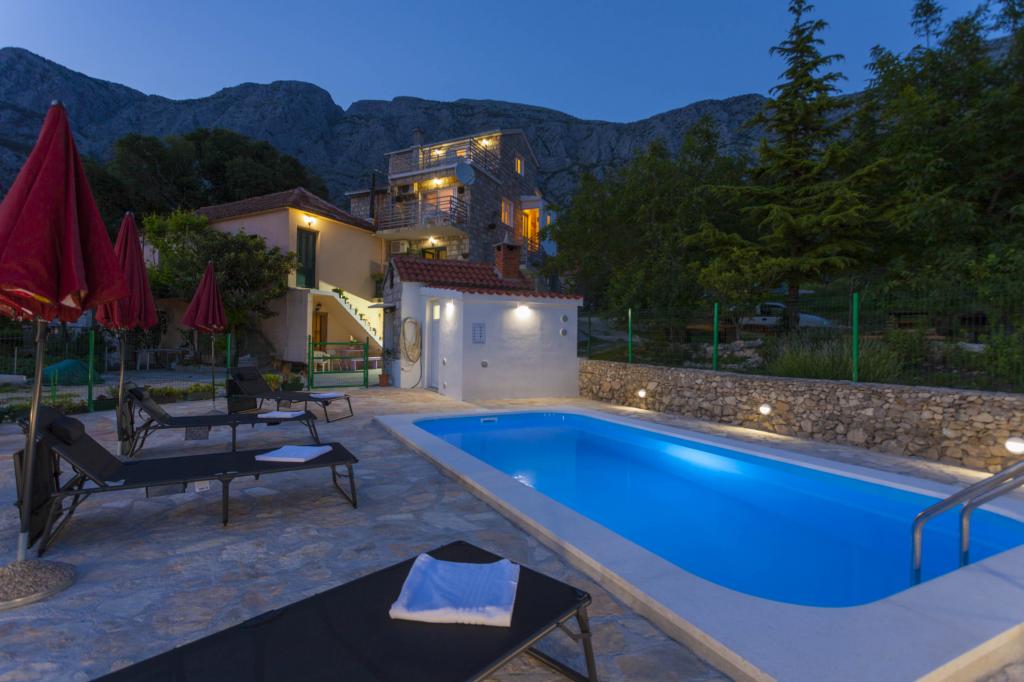 Poštovani gosti, Naša kuća nalazi se u Tučepi gornjoj u samom centru sela u podnožju planine Biokovo odakle se pruža lijepi pogled na obalu i otoke. Kuća je okružena zelenilom, vrtovima i stablima s postavljenim klupama i stolovima Kuća ima prizemlje u kojoj stanuju domaćini, a prvi i drugi kat s potkrovljem se iznajmljuju turistima. Moguć je smještaj 8 plus 2 na pomoćnom ležaju u kući. Prvi kat ima 2 sobe s bračnim ležajem ( 2 plus 2 ) i ima mogućnost korištenja i boravka još 2 osobe na pomoćnom ležaju ( 70 m 2 ). Drugi kat ima veliki dnevni boravak i sobu za 2 osobe, a u potkrovlju je druga soba za 2 osobe ( sve zajedno 130 m2 ). Na raspolaganju vam je i bazen 6 x 3 m na velikoj prostranoj kamenoj terasi, uz koji se nalazi i vanjski kamin za roštilj, unutarnji kamin, stol, stolice, ležaljke, suncobrani, kao i sva druga oprema. Uzgajamo piliće, guske a posjedujemo i njemačkog ovčara. U blizini su 3 lijepa restorana udaljena 200 m. Veselimo se vašem dolasku i želimo vam dobrodošlicu