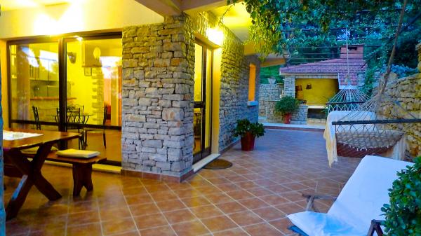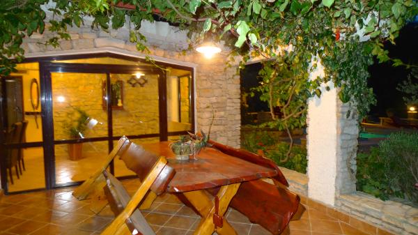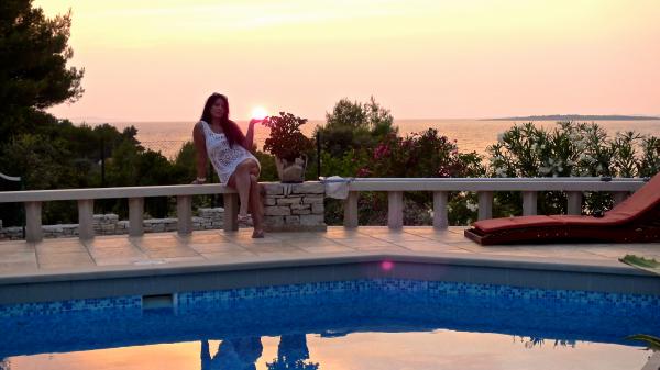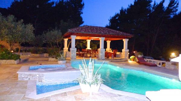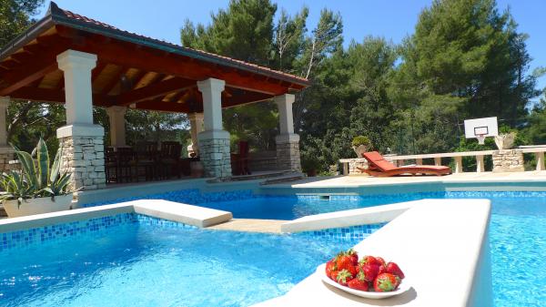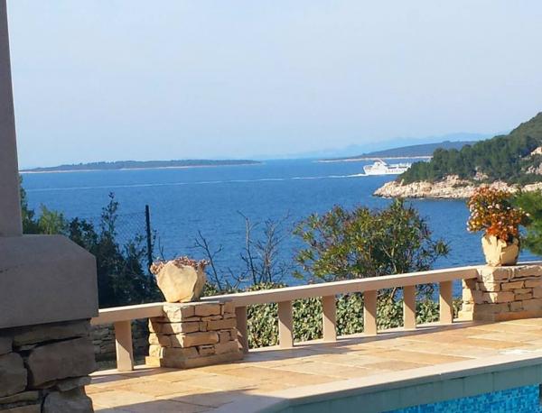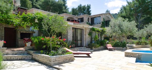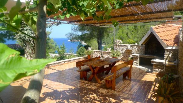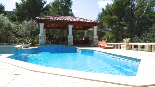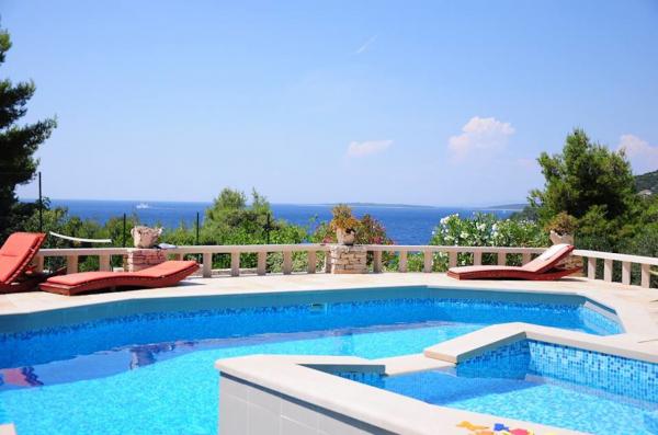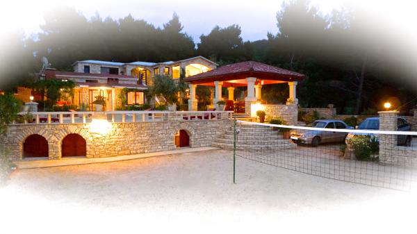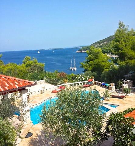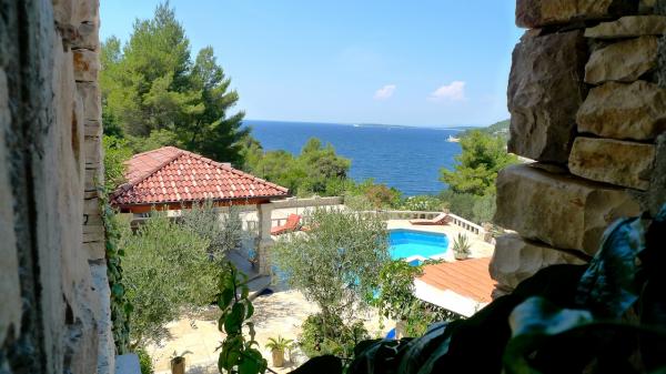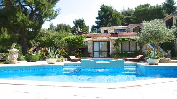 STONEHOUSE- Villa Poplat /Mali raj/ Od mora: 50 m. Od plaze: 80 m. Bazen, sauna, jakyzi, sportsko igraliste, parking, vrt, terase. Vila ima 7 spavacih soba za 14 osoba. 4 dnevna boravka sa kaucima na rasklapanje za 4 osoba. Maximalni smjestaj je za 19 osoba. Ima: 6 kupaonica, 1 vanjski tus, 4 kuhinje, Otvorenu natkrivenu prostoriju za druzenje, 4 vanjska rostilja, 2 unutarnja rostilja. Kompletno stilski uredjena i opremljena. Stone house ima jednu od najljepsih okucnica u Hrvatskoj. App. 1 = (2) / 2 App. 2 = (2) (2 ) /1 App. 3= (2) (2) /1 App. 4= (2) (2 ) / 1 Svaki apartman ima privatni ulaz sa privatnim terasama I zajednicke terase oko bazena. Sauna, 2 jakyzi, vrt, sportsko igraliste, parking za 4 auta na zatvorenoj okucnici, besplatan internet. Posjeduje: Bazen:10, 50 m x 5, 10 m sa jakyzi 2, 00 m x 2, 00 m, Morska voda. Mjesto za romantičan i tih odmor udaljeno 9 km od Vela luke. Krasan pogled na more i zalazak sunca.