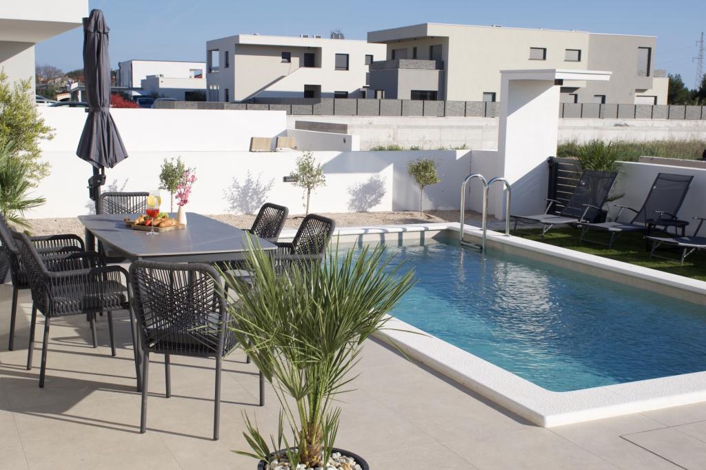 Potpuno opremljena vila sa bazenom, roštiljom i dječjim igralištem. Udaljena cca 1 km od centra grada u mirnom kvartu.
