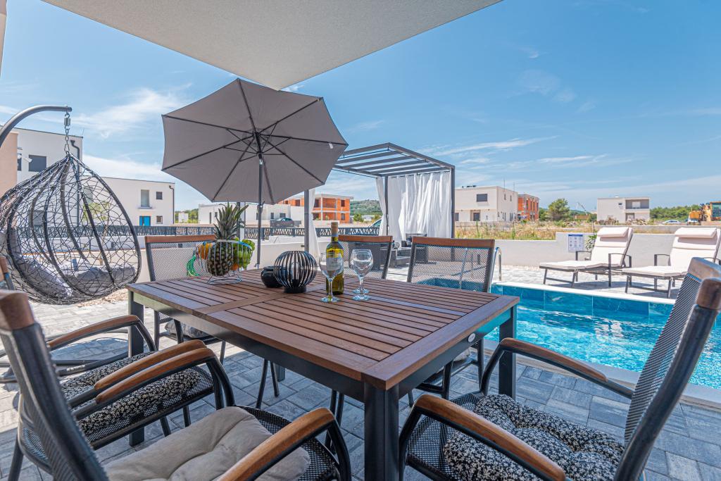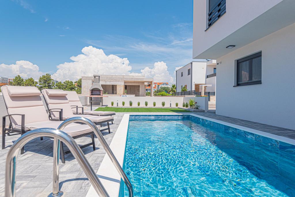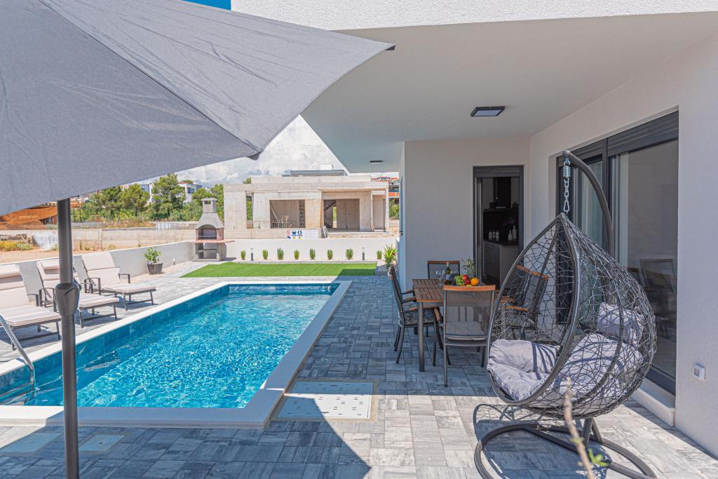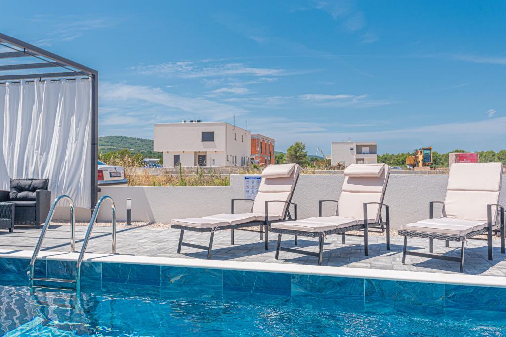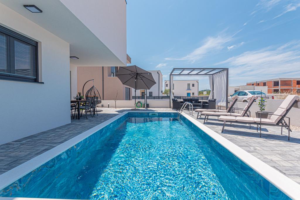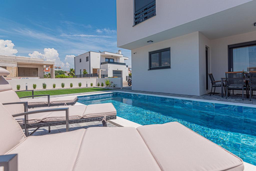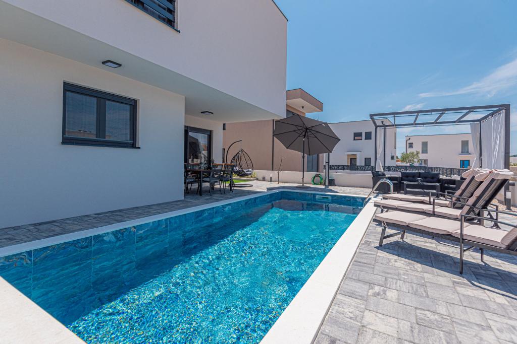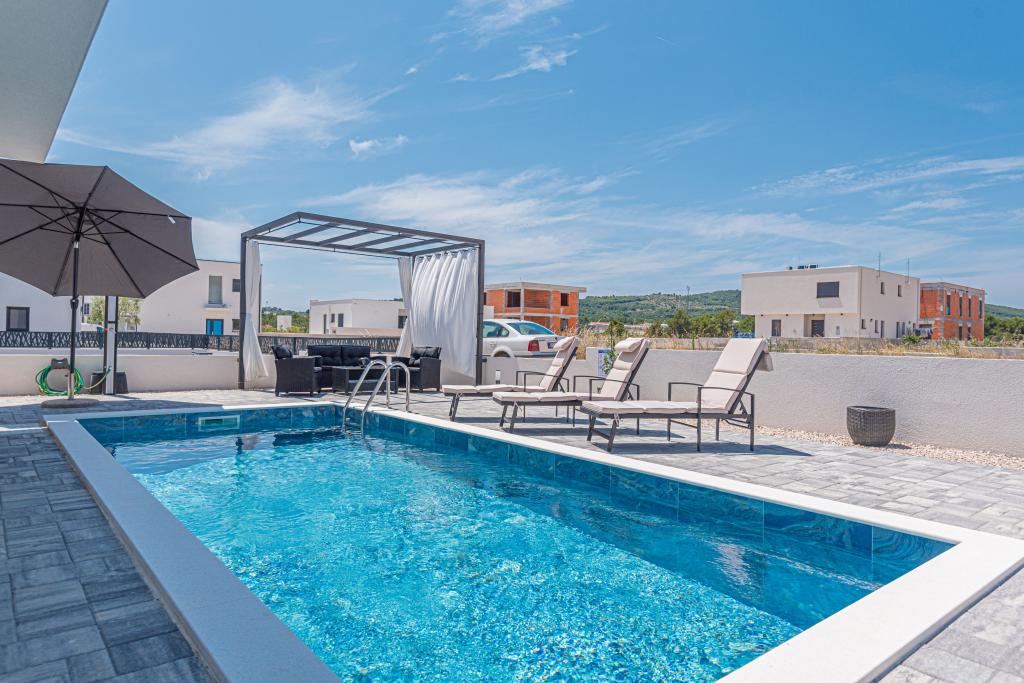 Nova, kompletno uređena vila s bazenom u mirnom kutku grada Vodica, udaljena od centra, plaže i drugih sadržaja oko 1 km ili 15 minuta laganog hoda. Vila posjeduje bazen 7x3 m i dubine 1.5 m, grijani, uz bazen se nalaze ležaljke, vrtna ljuljačka i garnitura za odmaranje u sjenici. Okućnica ima vanjski roštilj i stol za objed. Kuća na katu ima tri sobe, master soba s kupatilom i dvije sobe s kupatilom u zajedničkom hodniku. Kreveti u dvije sobe imaju dimenzije 180x200 cm, a treća soba ima odvojene krevete, 90x200 i 120x200. Sve sobe su opremljene TV -om i klima uređajem. Gosti na raspolaganju imaju posteljinu i ručnike. U prizemlju je kuhinja u potpunosti opremljena posuđem, tosterom, štapnim mikserom i električnim cjedilom za agrume, te aparatom za filter kavu. U kuhinji je perilica suđa, hladnjak i ledenica, pećnica i mikrovalna pećnica. Dnevni boravak ima kutni kauč i TV s internetom i satelitskim programom.