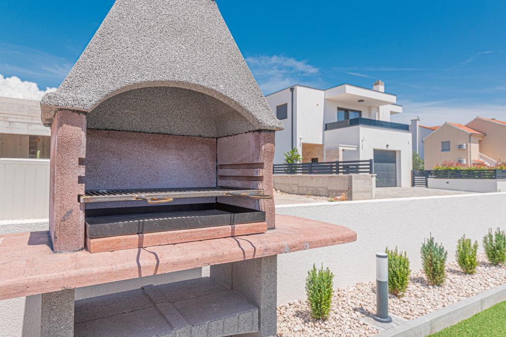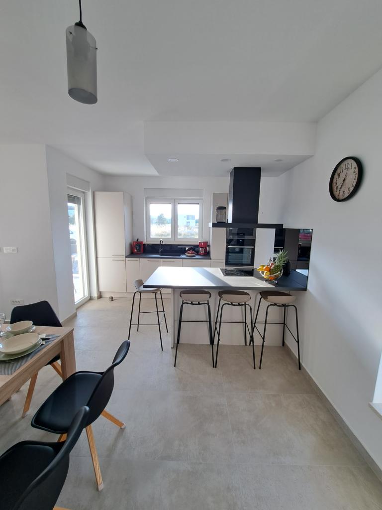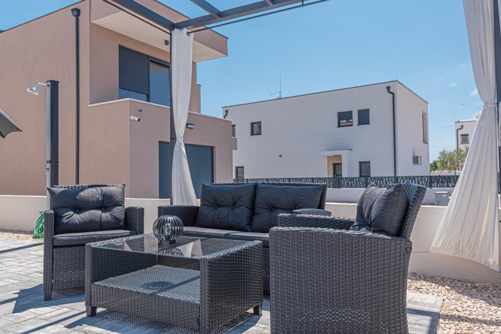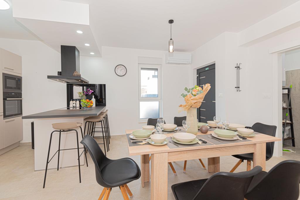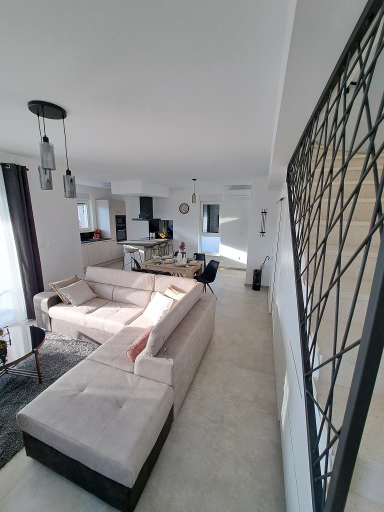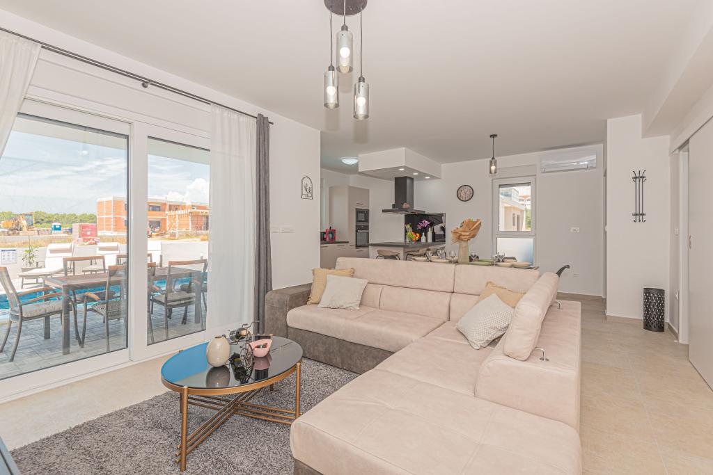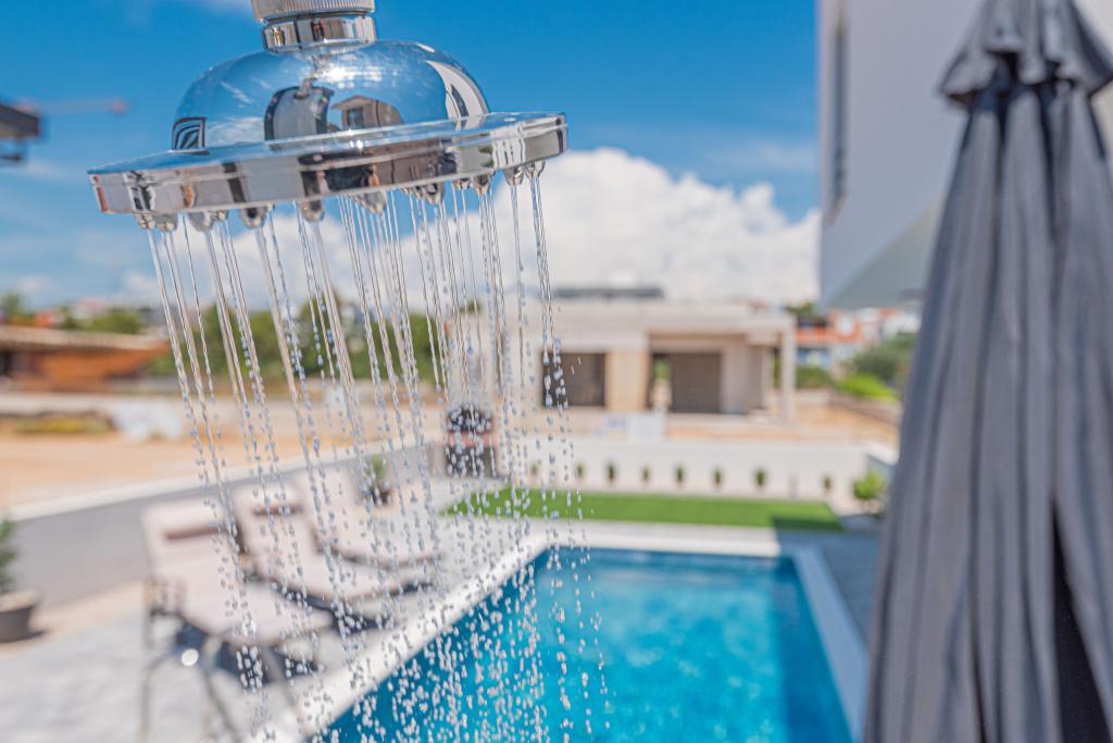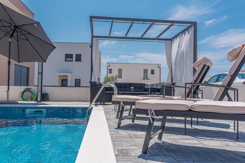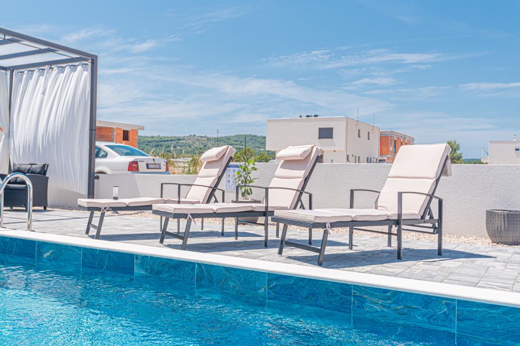Nova, kompletno uređena vila s bazenom u mirnom kutku grada Vodica, udaljena od centra, plaže i drugih sadržaja oko 1 km ili 15 minuta laganog hoda. Vila posjeduje bazen 7x3 m i dubine 1.5 m, grijani, uz bazen se nalaze ležaljke, vrtna ljuljačka i garnitura za odmaranje u sjenici. Okućnica ima vanjski roštilj i stol za objed. Kuća na katu ima tri sobe, master soba s kupatilom i dvije sobe s kupatilom u zajedničkom hodniku. Kreveti u dvije sobe imaju dimenzije 180x200 cm, a treća soba ima odvojene krevete, 90x200 i 120x200. Sve sobe su opremljene TV -om i klima uređajem. Gosti na raspolaganju imaju posteljinu i ručnike. U prizemlju je kuhinja u potpunosti opremljena posuđem, tosterom, štapnim mikserom i električnim cjedilom za agrume, te aparatom za filter kavu. U kuhinji je perilica suđa, hladnjak i ledenica, pećnica i mikrovalna pećnica. Dnevni boravak ima kutni kauč i TV s internetom i satelitskim programom.