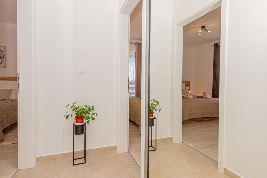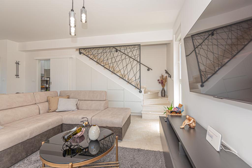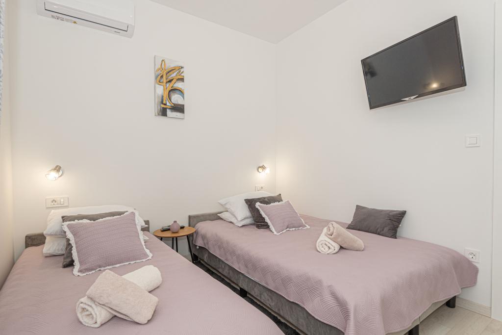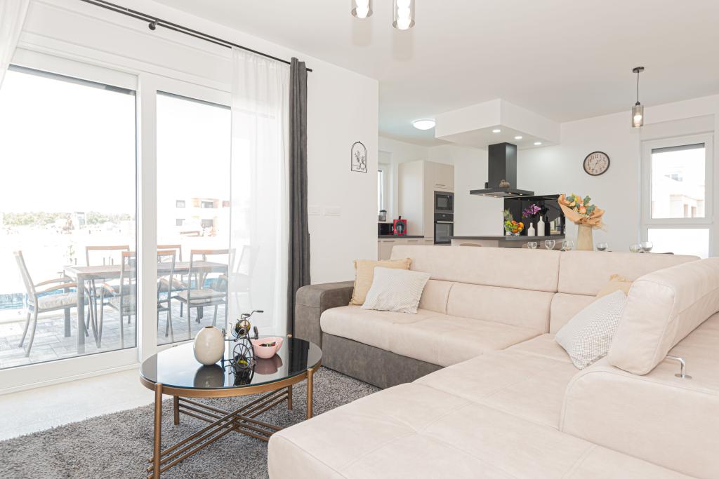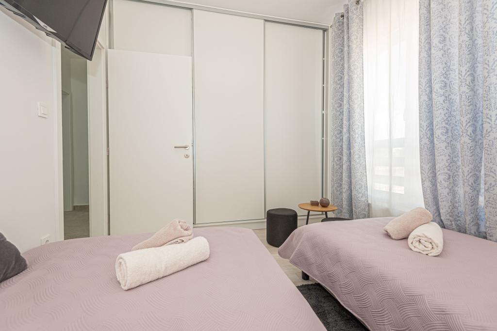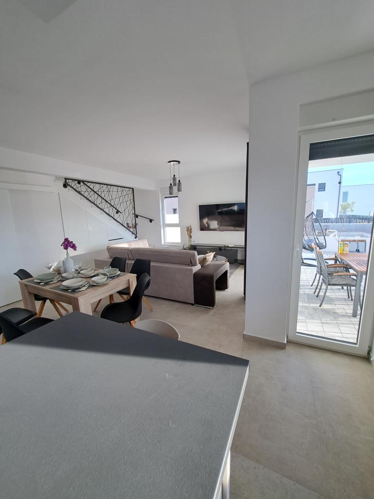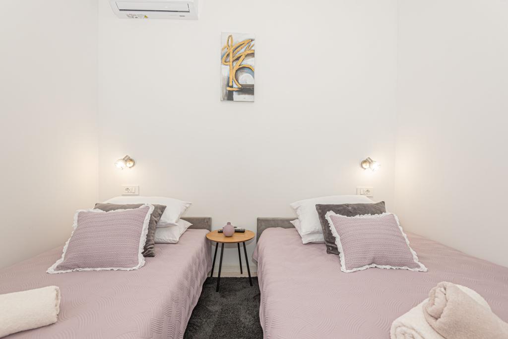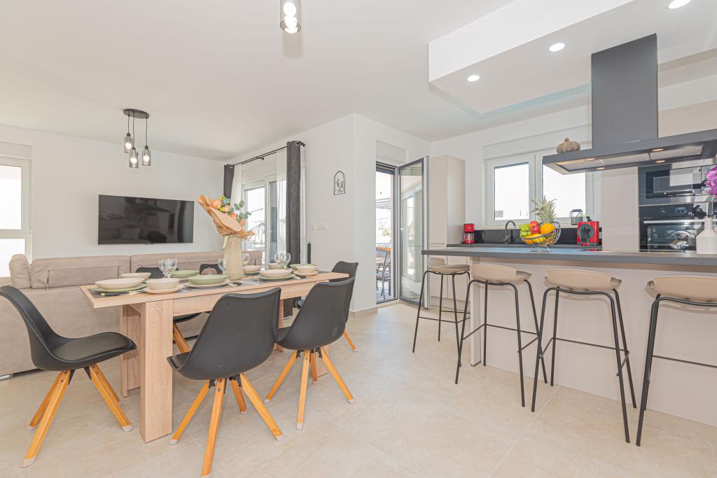 Nova, kompletno uređena vila s bazenom u mirnom kutku grada Vodica, udaljena od centra, plaže i drugih sadržaja oko 1 km ili 15 minuta laganog hoda. Vila posjeduje bazen 7x3 m i dubine 1.5 m, grijani, uz bazen se nalaze ležaljke, vrtna ljuljačka i garnitura za odmaranje u sjenici. Okućnica ima vanjski roštilj i stol za objed. Kuća na katu ima tri sobe, master soba s kupatilom i dvije sobe s kupatilom u zajedničkom hodniku. Kreveti u dvije sobe imaju dimenzije 180x200 cm, a treća soba ima odvojene krevete, 90x200 i 120x200. Sve sobe su opremljene TV -om i klima uređajem. Gosti na raspolaganju imaju posteljinu i ručnike. U prizemlju je kuhinja u potpunosti opremljena posuđem, tosterom, štapnim mikserom i električnim cjedilom za agrume, te aparatom za filter kavu. U kuhinji je perilica suđa, hladnjak i ledenica, pećnica i mikrovalna pećnica. Dnevni boravak ima kutni kauč i TV s internetom i satelitskim programom.