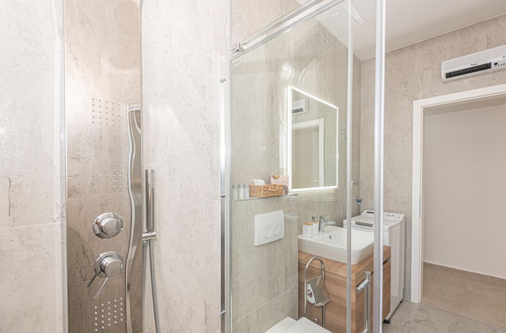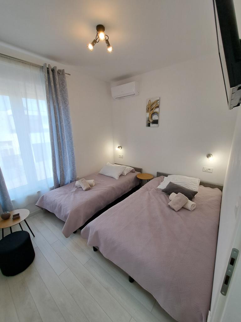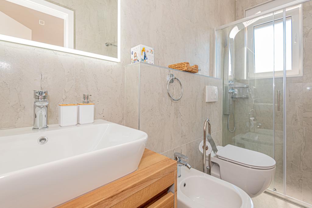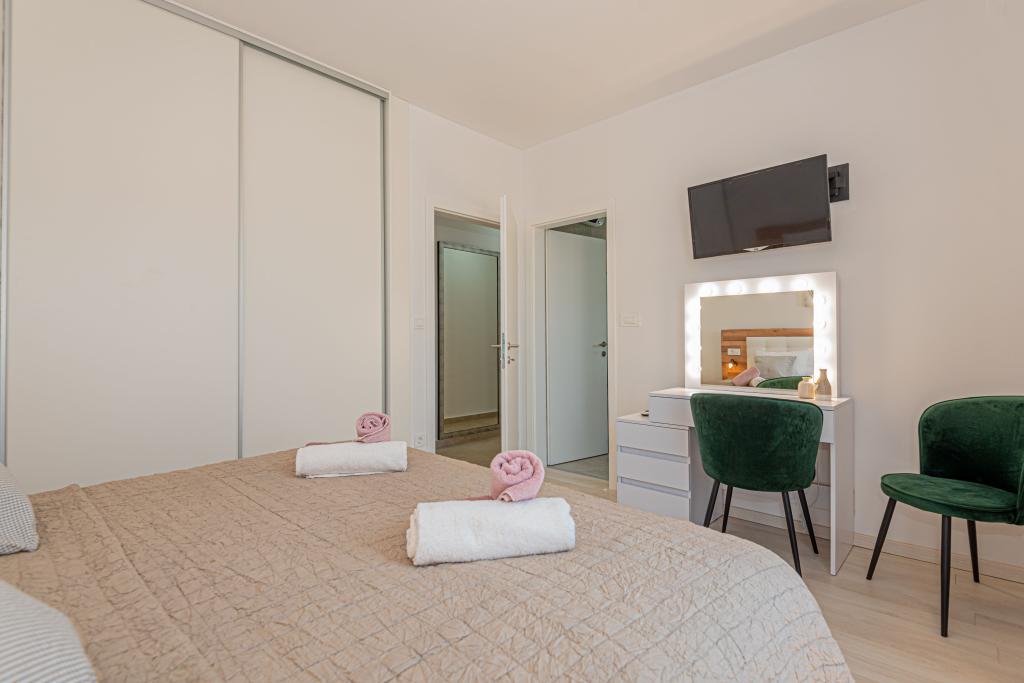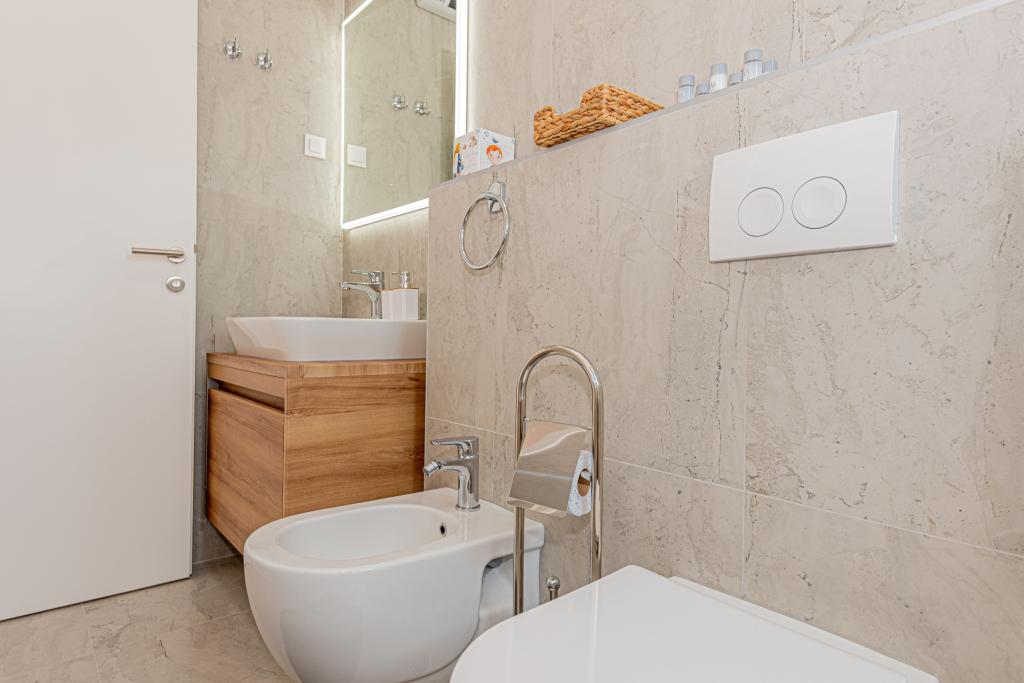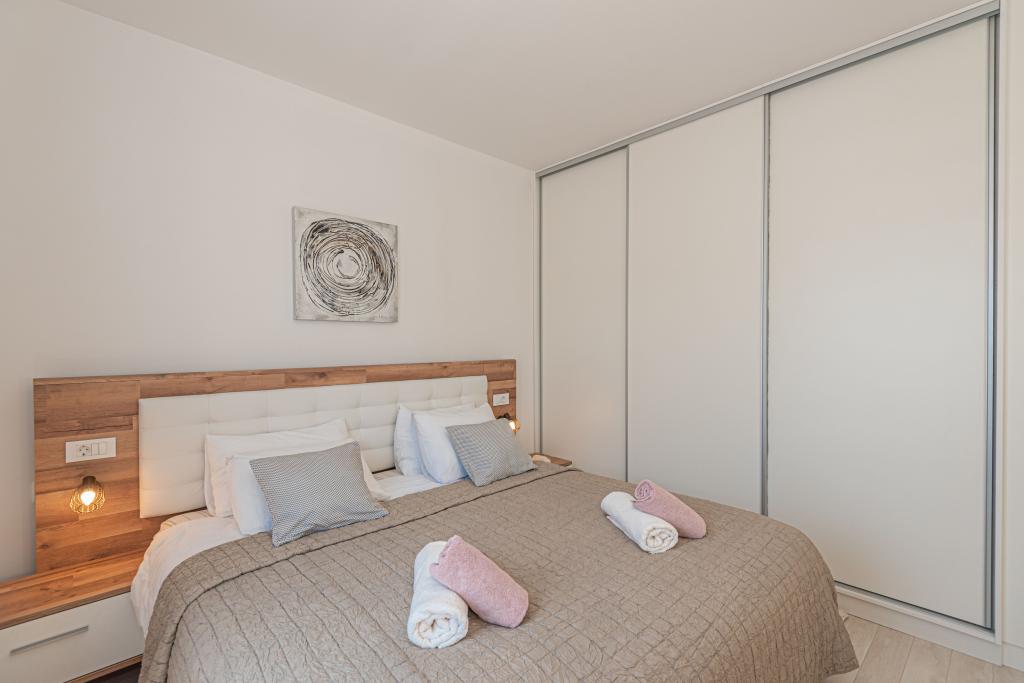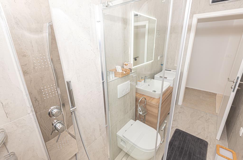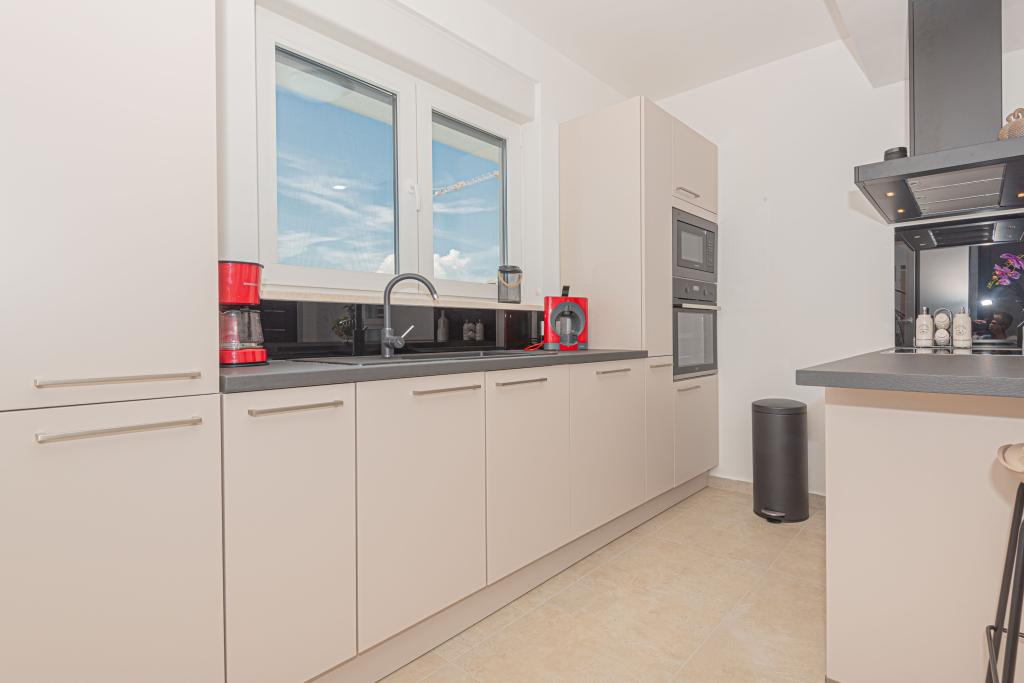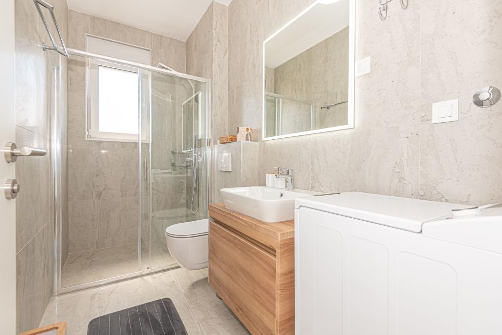 Nova, kompletno uređena vila s bazenom u mirnom kutku grada Vodica, udaljena od centra, plaže i drugih sadržaja oko 1 km ili 15 minuta laganog hoda. Vila posjeduje bazen 7x3 m i dubine 1.5 m, grijani, uz bazen se nalaze ležaljke, vrtna ljuljačka i garnitura za odmaranje u sjenici. Okućnica ima vanjski roštilj i stol za objed. Kuća na katu ima tri sobe, master soba s kupatilom i dvije sobe s kupatilom u zajedničkom hodniku. Kreveti u dvije sobe imaju dimenzije 180x200 cm, a treća soba ima odvojene krevete, 90x200 i 120x200. Sve sobe su opremljene TV -om i klima uređajem. Gosti na raspolaganju imaju posteljinu i ručnike. U prizemlju je kuhinja u potpunosti opremljena posuđem, tosterom, štapnim mikserom i električnim cjedilom za agrume, te aparatom za filter kavu. U kuhinji je perilica suđa, hladnjak i ledenica, pećnica i mikrovalna pećnica. Dnevni boravak ima kutni kauč i TV s internetom i satelitskim programom.