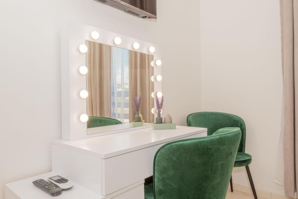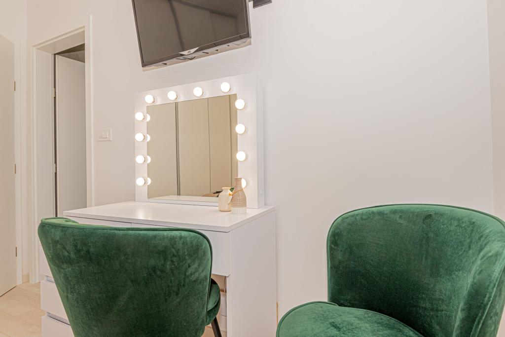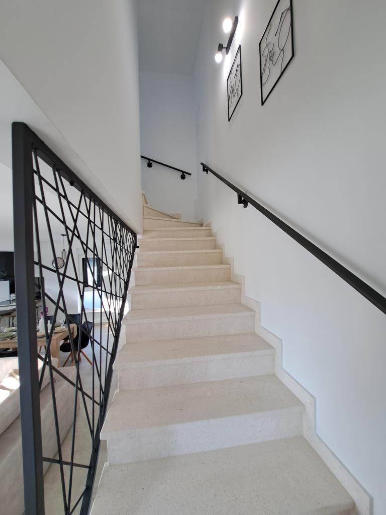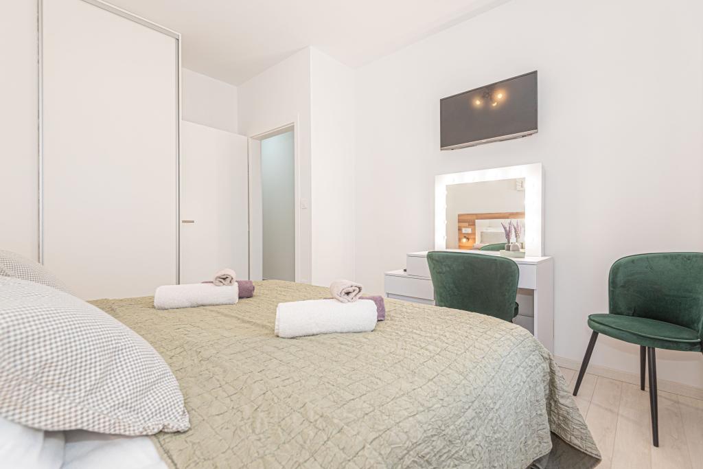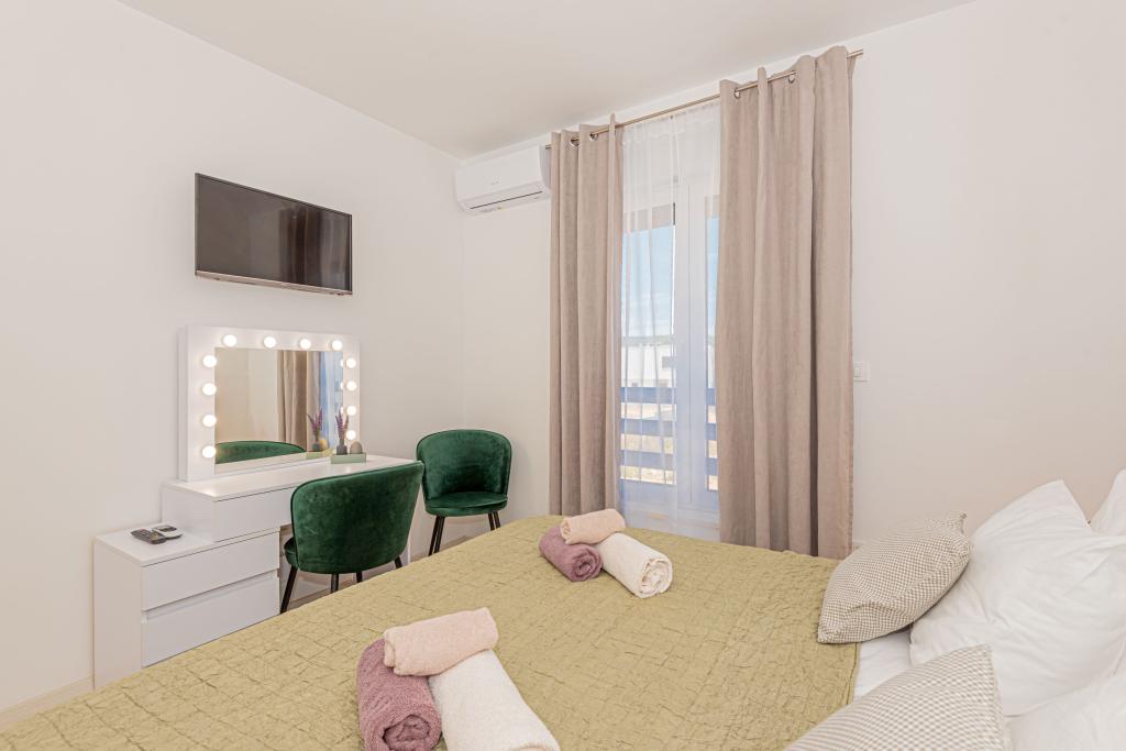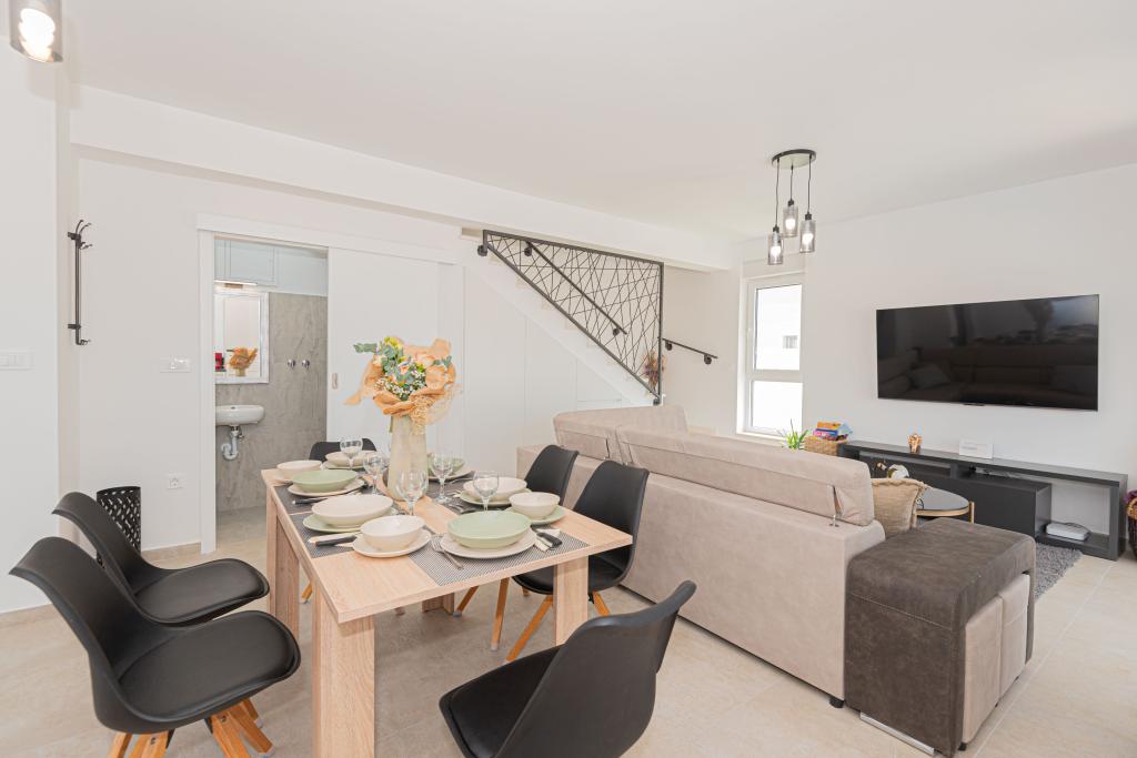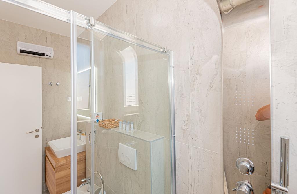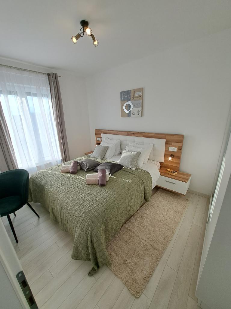 Nova, kompletno uređena vila s bazenom u mirnom kutku grada Vodica, udaljena od centra, plaže i drugih sadržaja oko 1 km ili 15 minuta laganog hoda. Vila posjeduje bazen 7x3 m i dubine 1.5 m, grijani, uz bazen se nalaze ležaljke, vrtna ljuljačka i garnitura za odmaranje u sjenici. Okućnica ima vanjski roštilj i stol za objed. Kuća na katu ima tri sobe, master soba s kupatilom i dvije sobe s kupatilom u zajedničkom hodniku. Kreveti u dvije sobe imaju dimenzije 180x200 cm, a treća soba ima odvojene krevete, 90x200 i 120x200. Sve sobe su opremljene TV -om i klima uređajem. Gosti na raspolaganju imaju posteljinu i ručnike. U prizemlju je kuhinja u potpunosti opremljena posuđem, tosterom, štapnim mikserom i električnim cjedilom za agrume, te aparatom za filter kavu. U kuhinji je perilica suđa, hladnjak i ledenica, pećnica i mikrovalna pećnica. Dnevni boravak ima kutni kauč i TV s internetom i satelitskim programom.