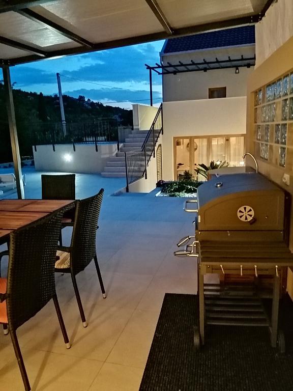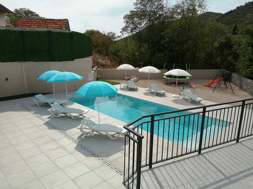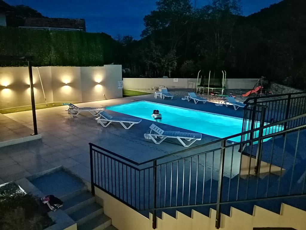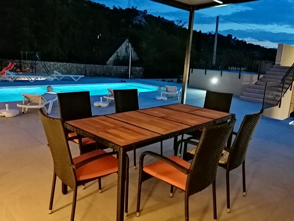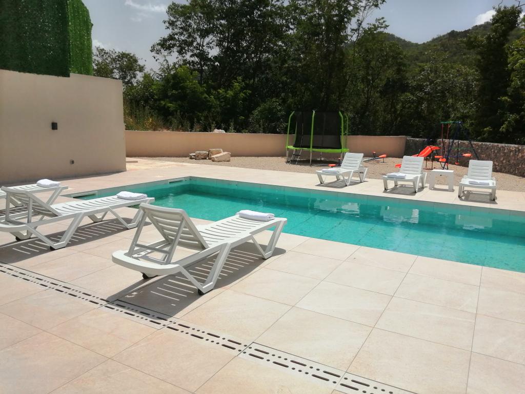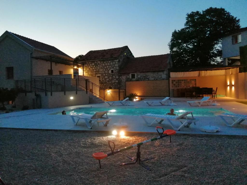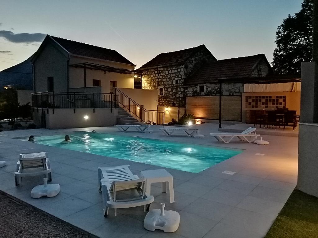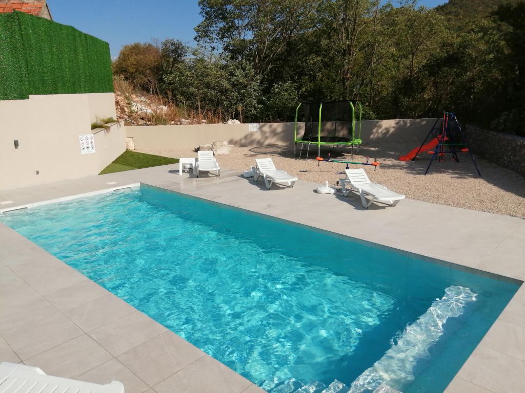 Novouređena kuća za odmor s velikom okućnicom i bazenom 36m2, nalazi se u malom dalmatinskom gradu Vrgorcu, biseru Dalmatinske zagore. Kuća ima tri sobe, svaka soba ima svoje kupatilo. U jednom kupatilu nalazi se i masažna kada. U opremi objekta je i krevetić i hranilica za djecu do 3 godine. U prizemlju kuće je blagavaonica s kuhinjom ,dnevnim boravkom i kupatilom. Kuća ima dvije terase, te veliku okućnicu s bazenom, igralištem za djecu s natkrivenim prostorom za sjedenje i roštiljem. Ispred kuće se nalazi parkiralište. Iz baze, naše kuće za odmor, možete otići na izlete u okolici, biciklirati ili otići na plažu 10tak km udaljenu od mjesta boravka. Dobra prometna povezanost grada Vrgorca omogućuje Vam da brzo i sigurno stignete do Makarske rivijere, Splita, Dubrovnika ili središta u susjednoj BIH kao što su Mostar ili Sarajevo. Naša kuća za odmor posjeduje sve potrebno za miran obiteljski odmor, uživanje i opuštanje. Nadamo se da ćete se i Vi uvjeriti u to. Dobro došli