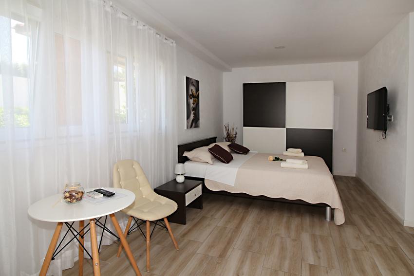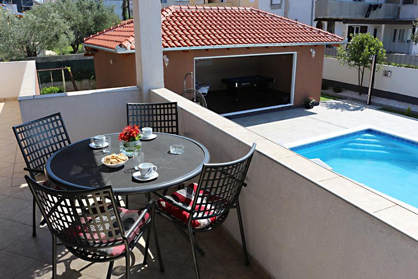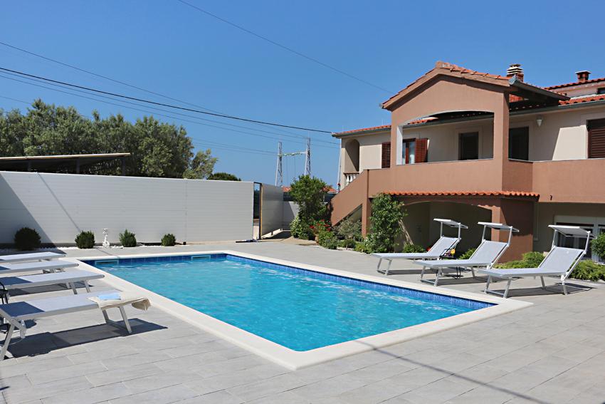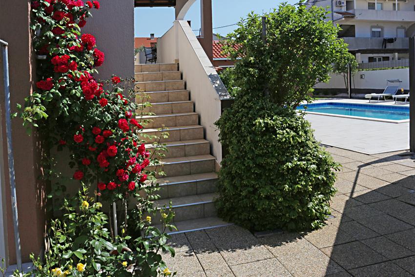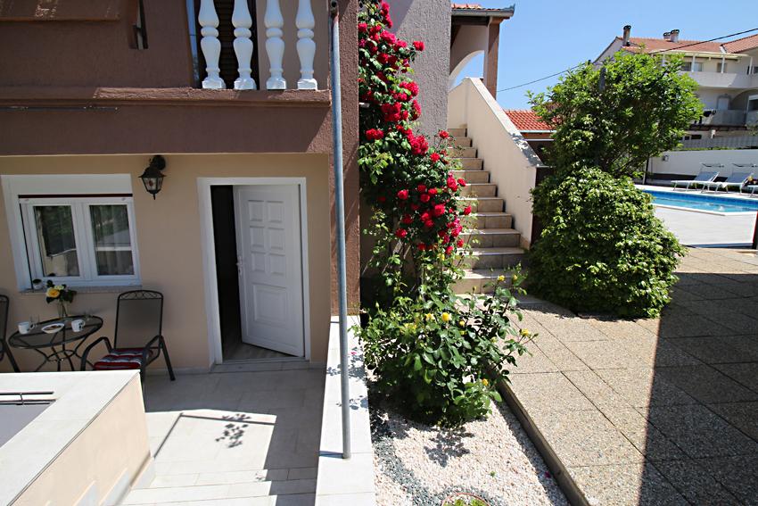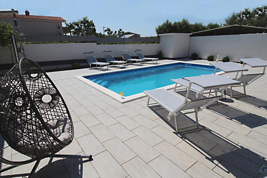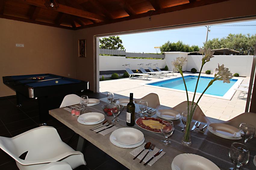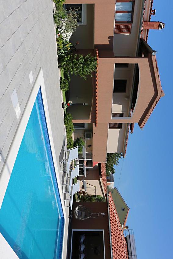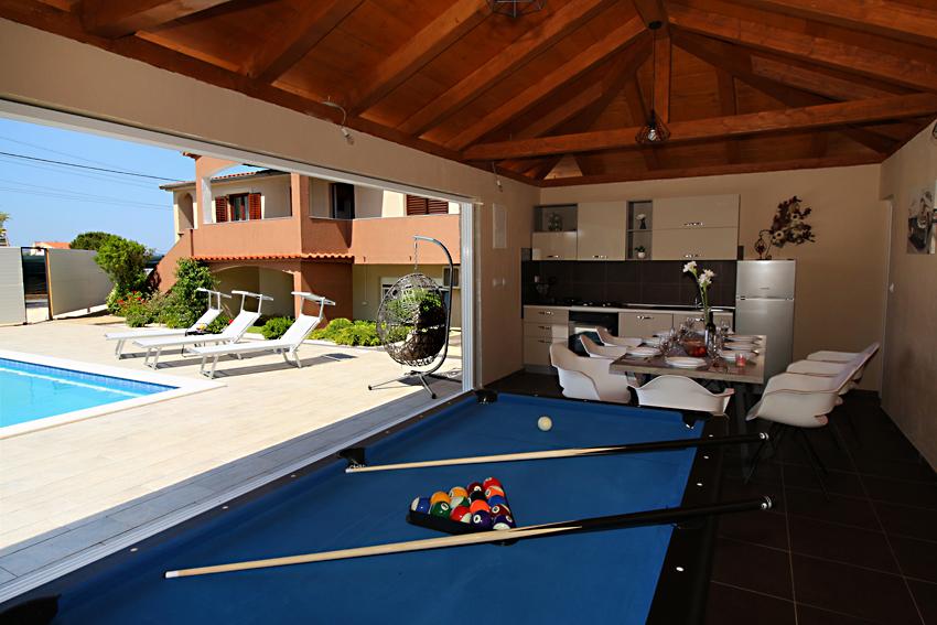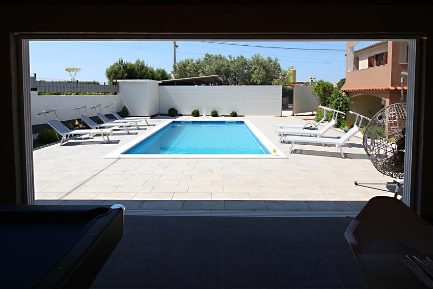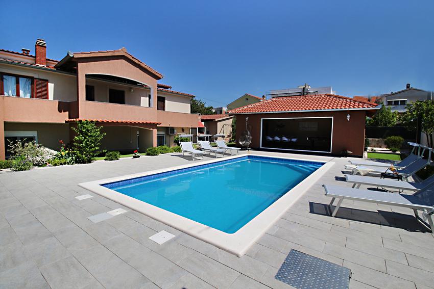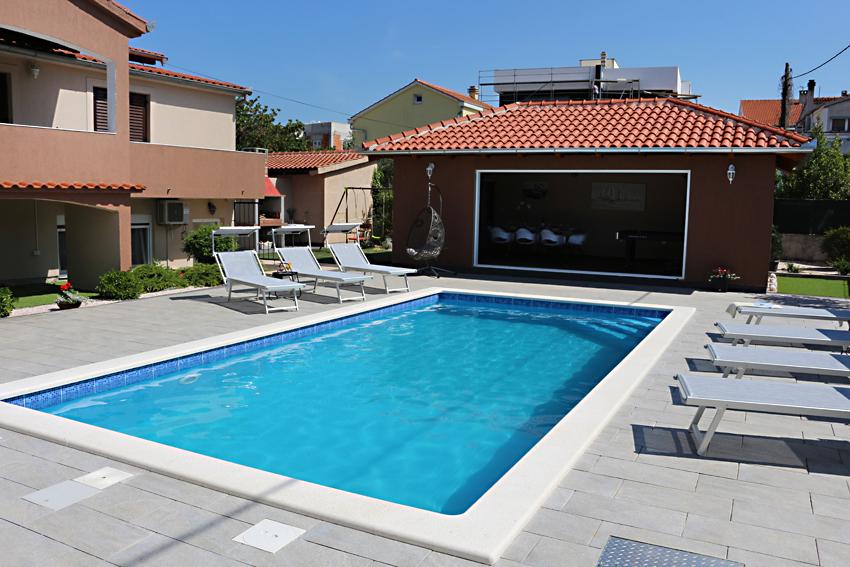 Vila Anda nalazi se u Zadru,3 kilometra od centra grada. Sastoji se od 3 apartmana koji su namijenjeni za istu skupinu gostiju, što znači da u objektu neće biti drugih gostiju osim vas. Apartman na katu sastoji se od 2 spavaće sobe,jedna sa bračnim krevetom za dvije a druga sa krevetom za jednu osobu. Apartman također ima TV,klima uređaj,kupaonicu te kuhinju sa svim potrebnim priborom za jelo.U prizemlju se nalaze 2 studio apartmana jednake površine i svaki ima TV,klima uređaj,bračni krevet za 2 osobe,svoju kupaonicu i kuhinju sa svim potrebnim priborom. U dvorištu se nalazi bazen 8x4 metra a ispred njega je i prostorija sa potpuno opremljenom ljetnom kuhinjom i toaletom u kojemu se nalazi i zajednička mašina za pranje rublja.Pored se nalaze roštilj i ljuljačke za djecu.Gosti imaju osigurana 3 natkrivena parkirna mjesta.