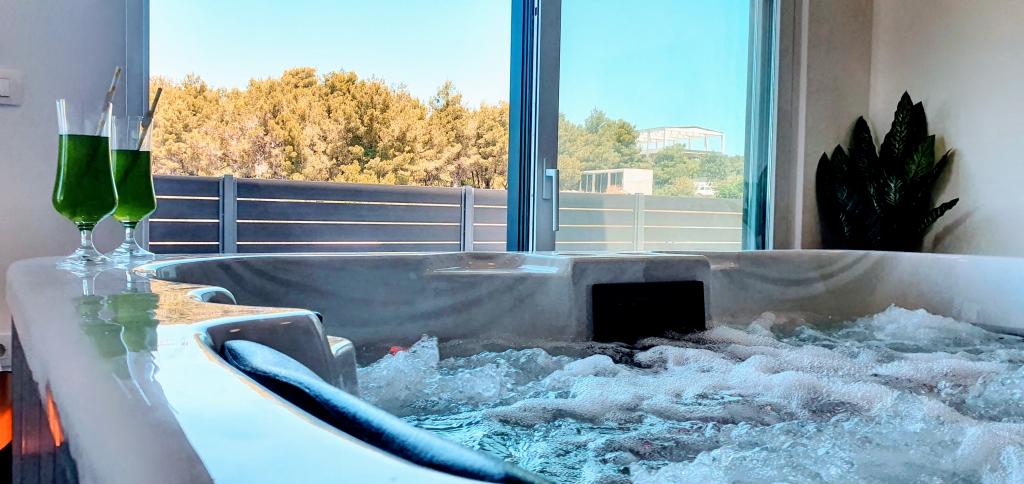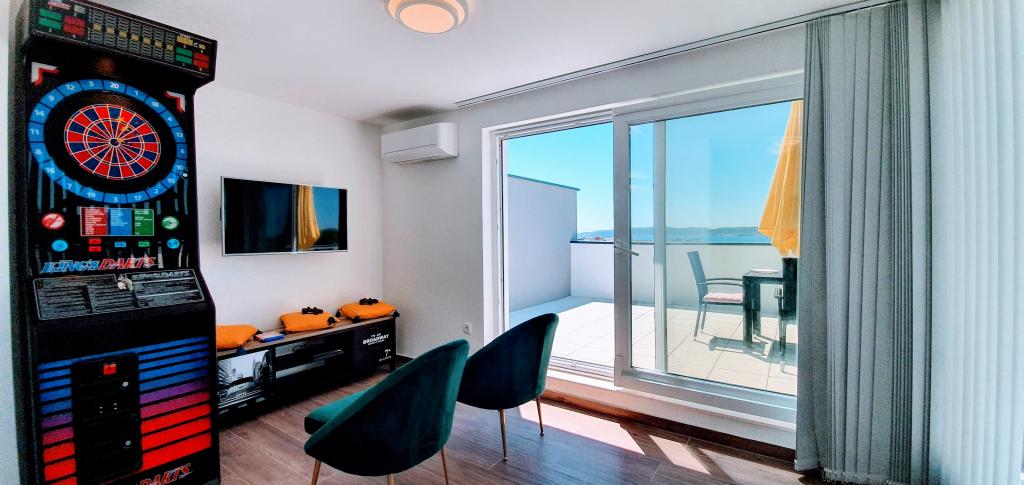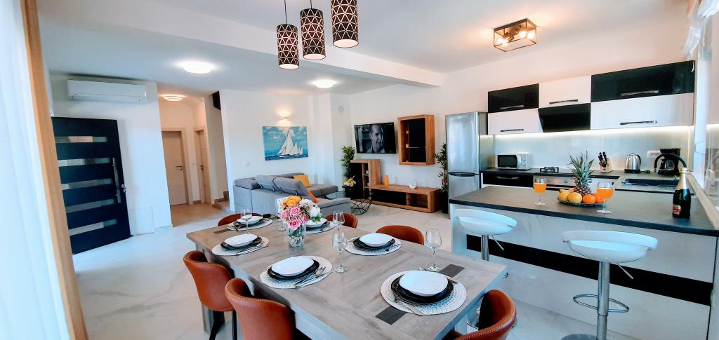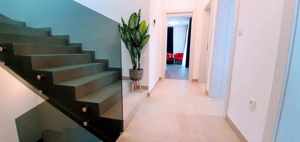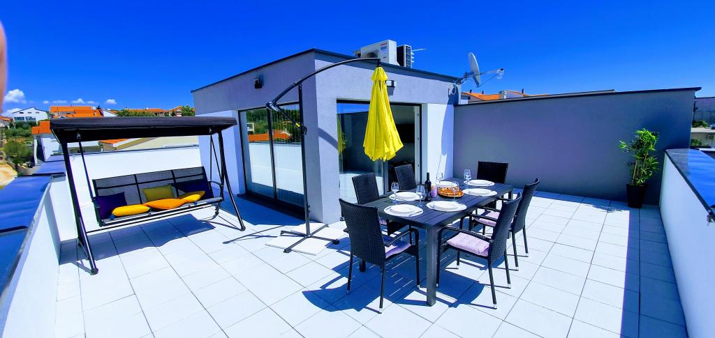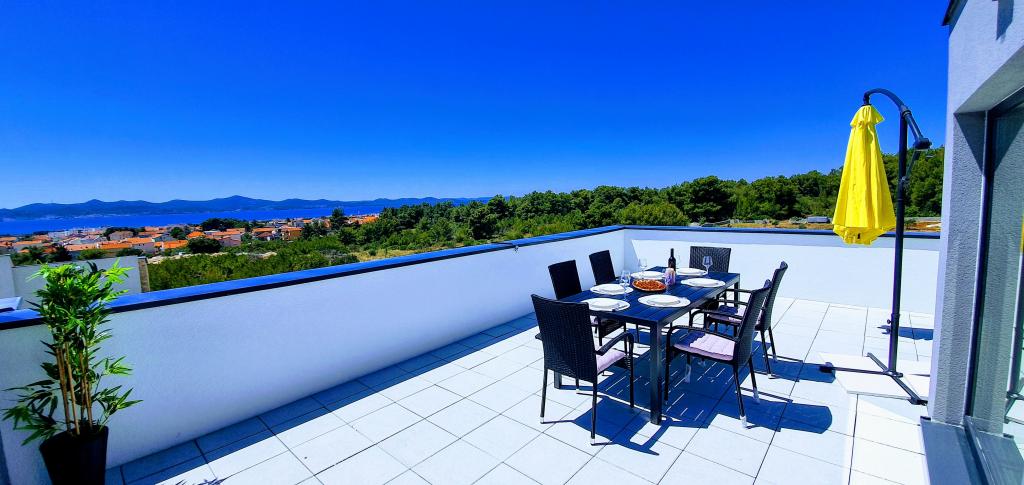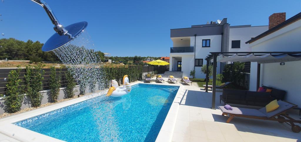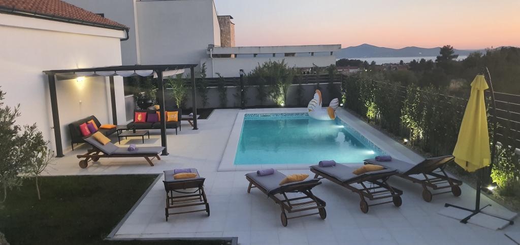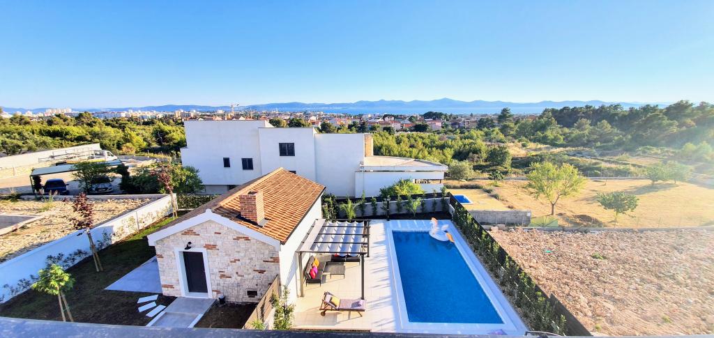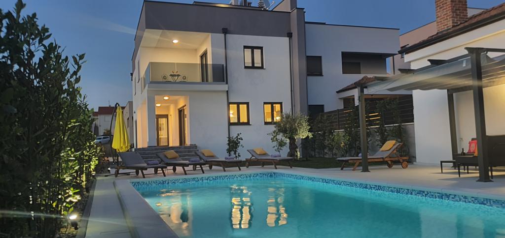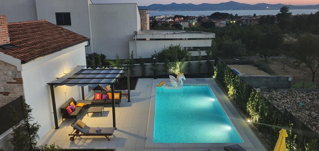 Nova, upravo dovršena Villa, moderno uređena pružiti će Vam nezaboravan i savršen odmor u Zadru. Villa sa panoramskim pogledom na stari grad nalazi se u Zadru na mirnoj lokaciji svega nekoliko minuta vožnje do starog grada gdje se svakodnevno održavaju razne manifestacije, te niz restorana sa vrhunskom gastro ponudom, kao i nizom povijesnih znamenitosti. Villa se sastoji od podruma u kojem se nalazi teretana i konoba, prizemlja u kojem se nalazi dnevni boravak sa opremljenom kuhinjom, wc sa mašinom za pranje rublja te spa sobom u kojoj se nalazi Jacuzzi kao i masažni tuš. Na prvom katu nalaze se 4 sobe, od kojih 3 dijele veliki Wc, dok jedna soba ima svoj Wc i balkon sa predivnim pogledom na more i vanjski bazen. Na drugom katu nalazi se panoramski pogled na Zadar i more, kao i prostorija opremljena konzolom za igre i pikadom. Ispred Ville nalazi se prekrasan veliki bazen dimenzija 9x4, kao i terasa te ležaljke. Za vrijeme boravka u Zadru svakako Vam predlažemo ovu prekrasnu Villu.